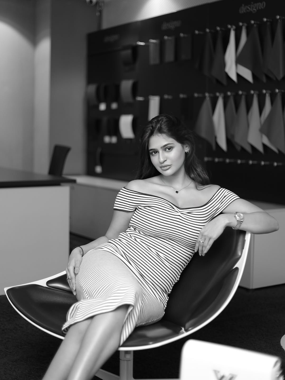 Prakriti Pavani captivates with an effortlessly sultry charm in this striped off-shoulder outfit.