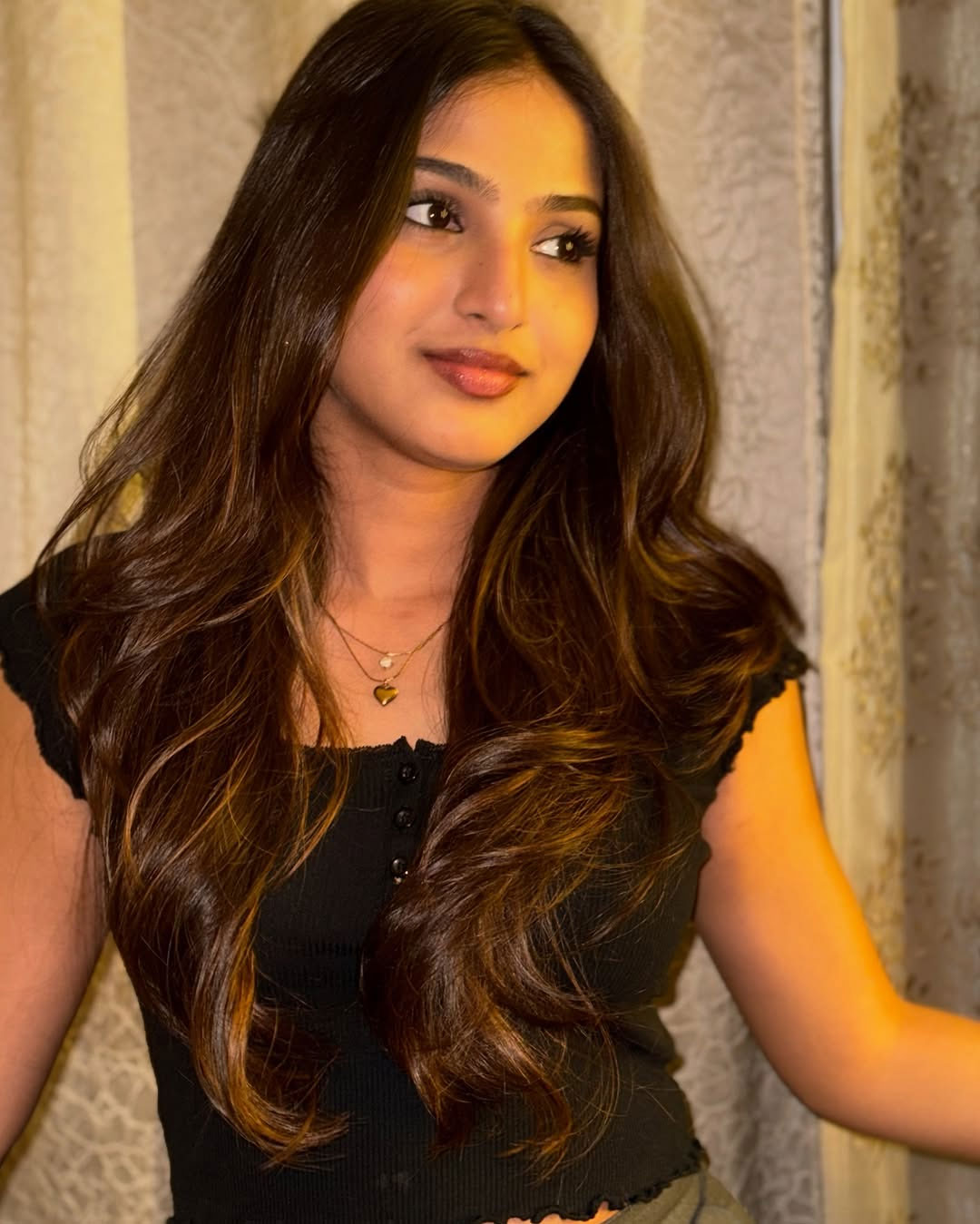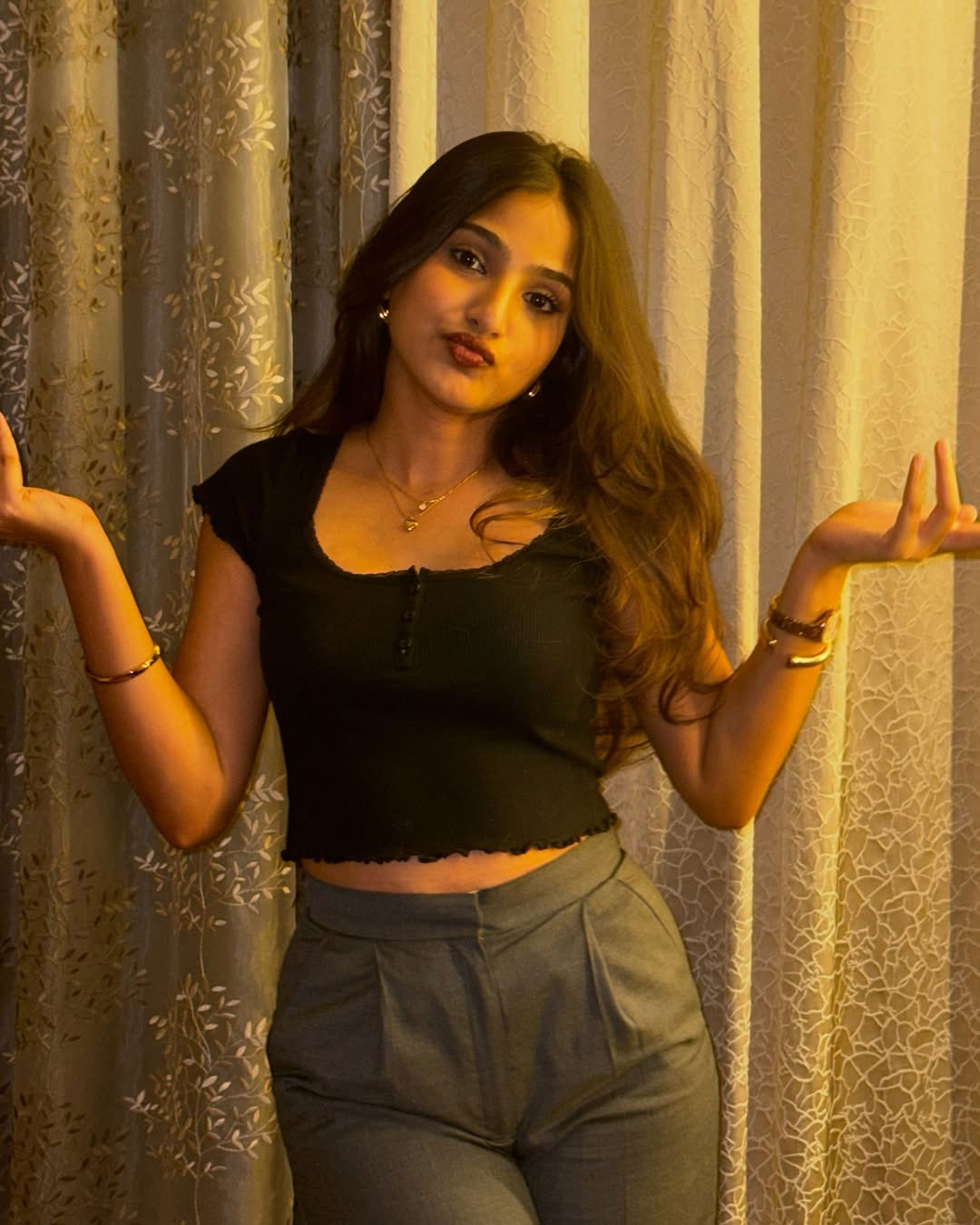 Pranavi often chooses dresses that suit her personality. Soft colors, clean designs, and neat fittings are seen in most of her looks. She proves that fashion does not always need heavy makeup or loud styling. Even simple dresses look adorable on her because of the way she presents herself.