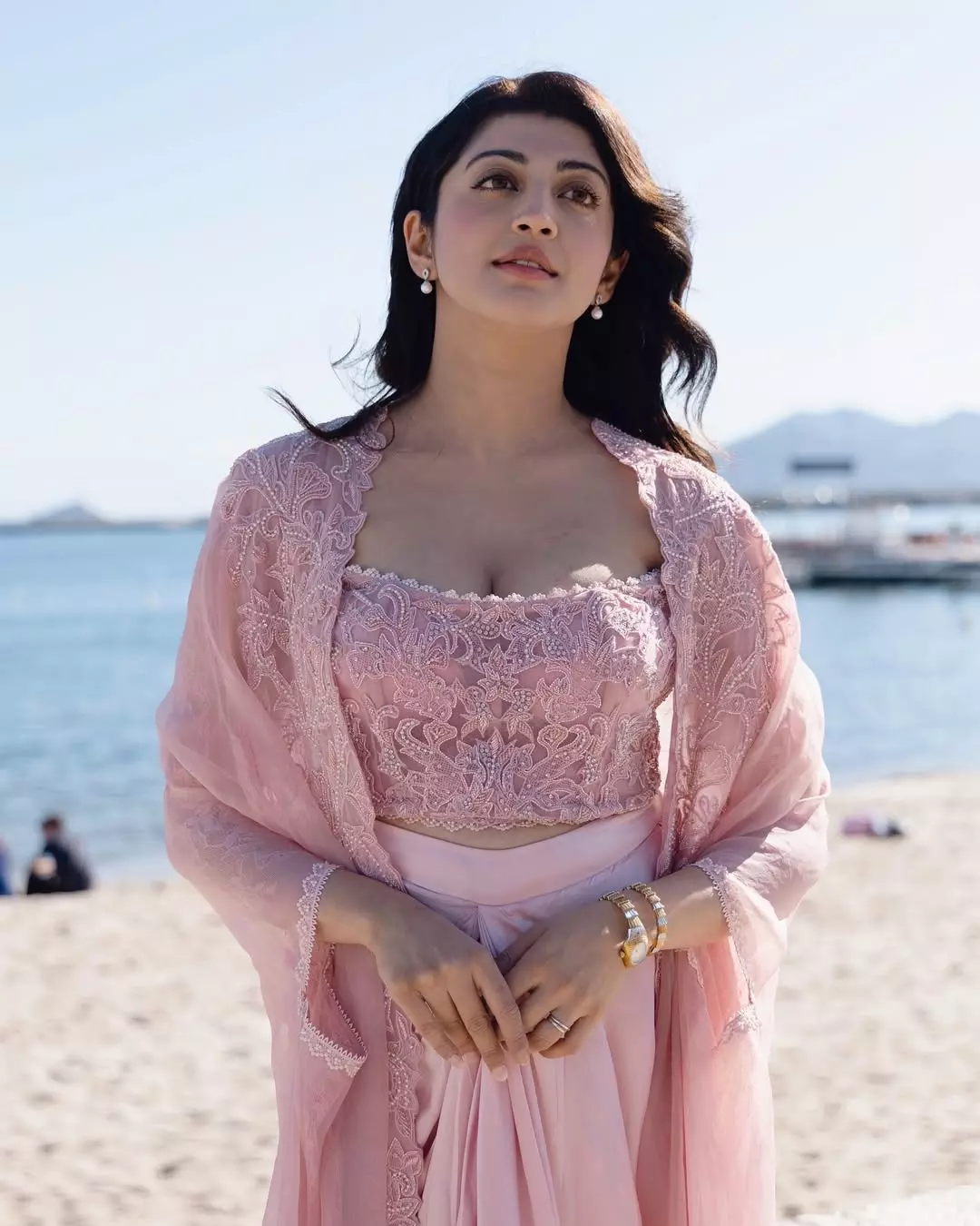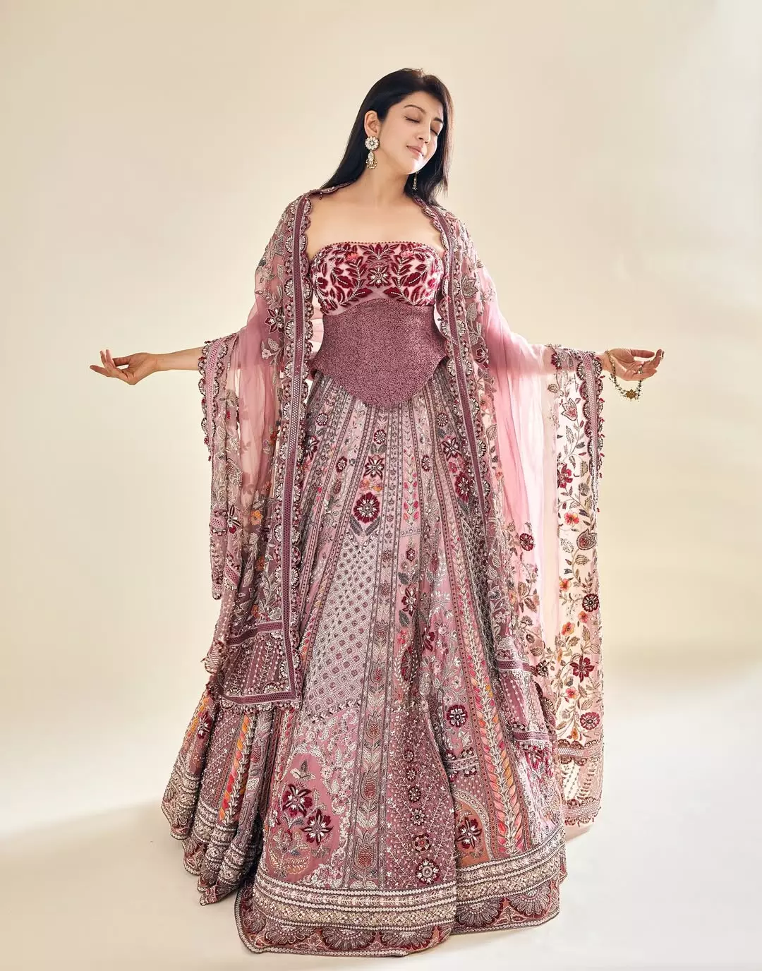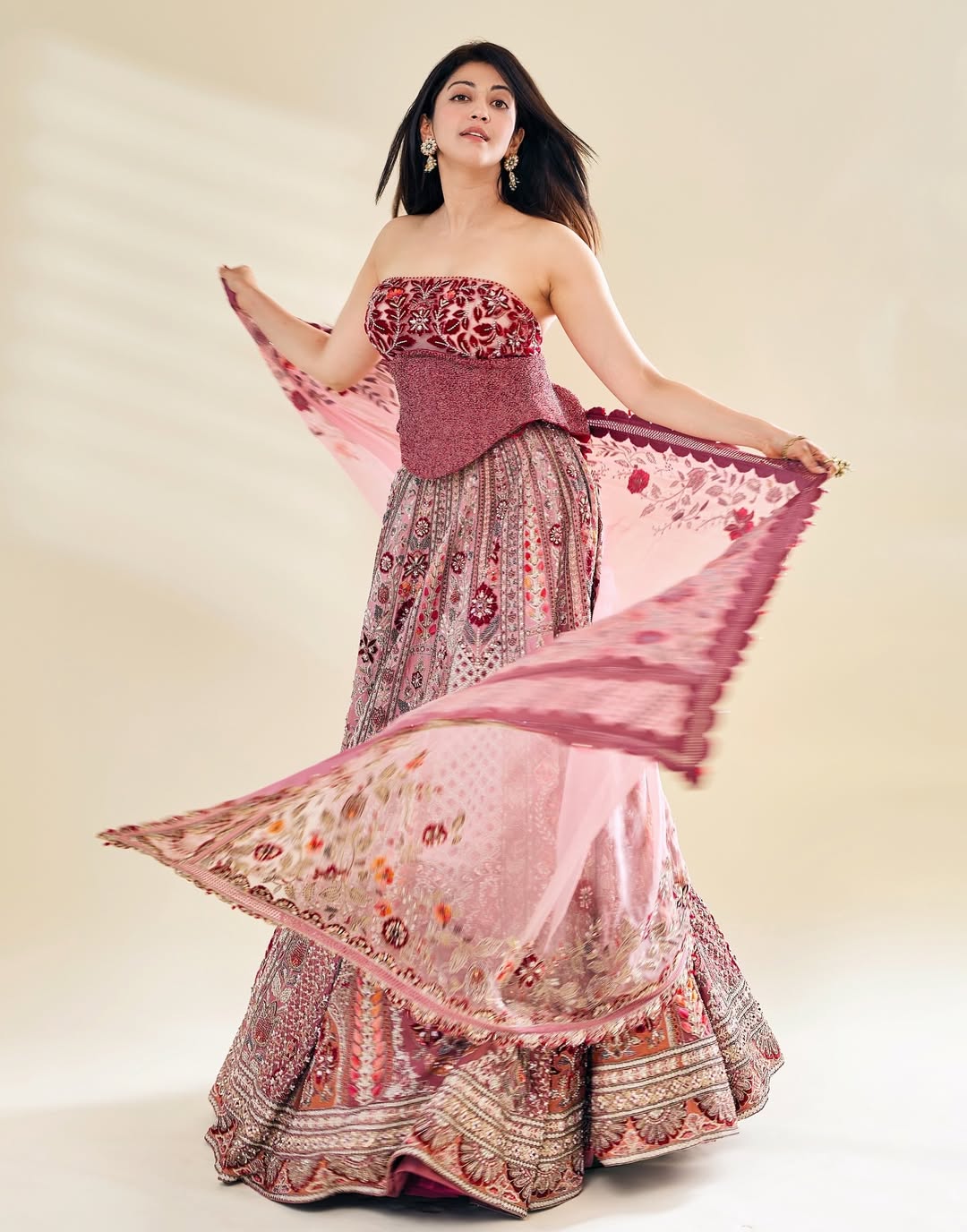 Pranitha, a Kalyan Jewellers ambassador, shone like a true Devi in a breathtaking pink lehenga by designer @sithara_kudige, its flowing dupatta and intricate gold embroidery evoking the vibrancy of the season. Adorned with exquisite pieces from @kalyanjewellers_official including a pearl choker, dangling jhumkas, and statement rings she embodied timeless grace against the backdrop of Thrissur's lush greenery and the family's iconic Bommai Kolu display.Pranitha's journey from a Bangalore-bred model to a pan-South Indian star began in 2010 with her debut in the Kannada blockbuster Porki, a remake of Pokiri.