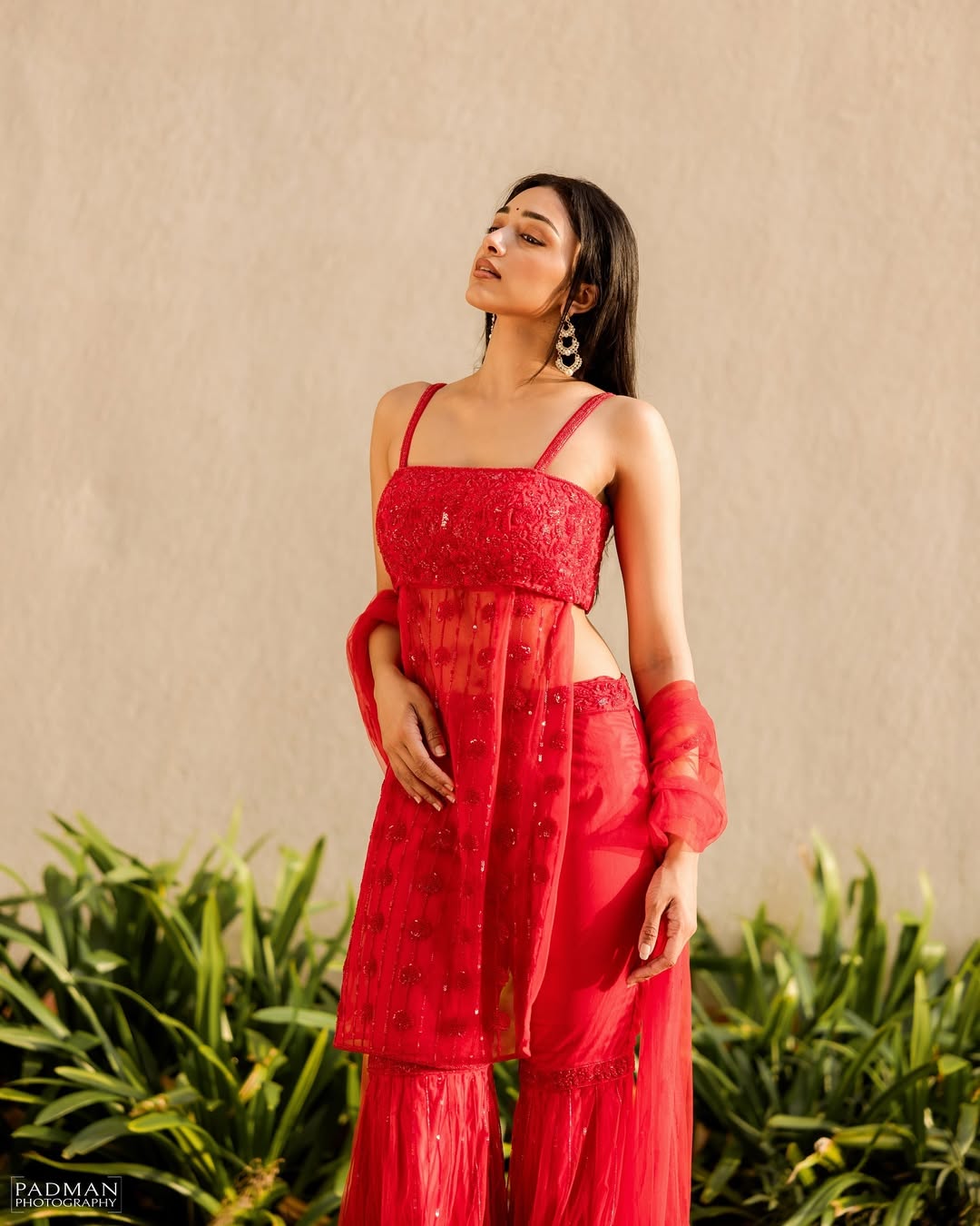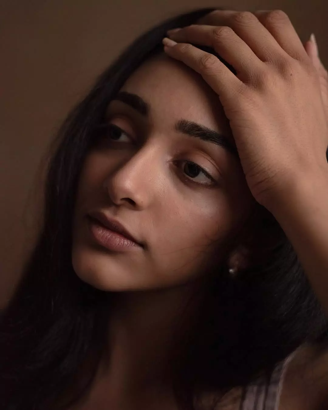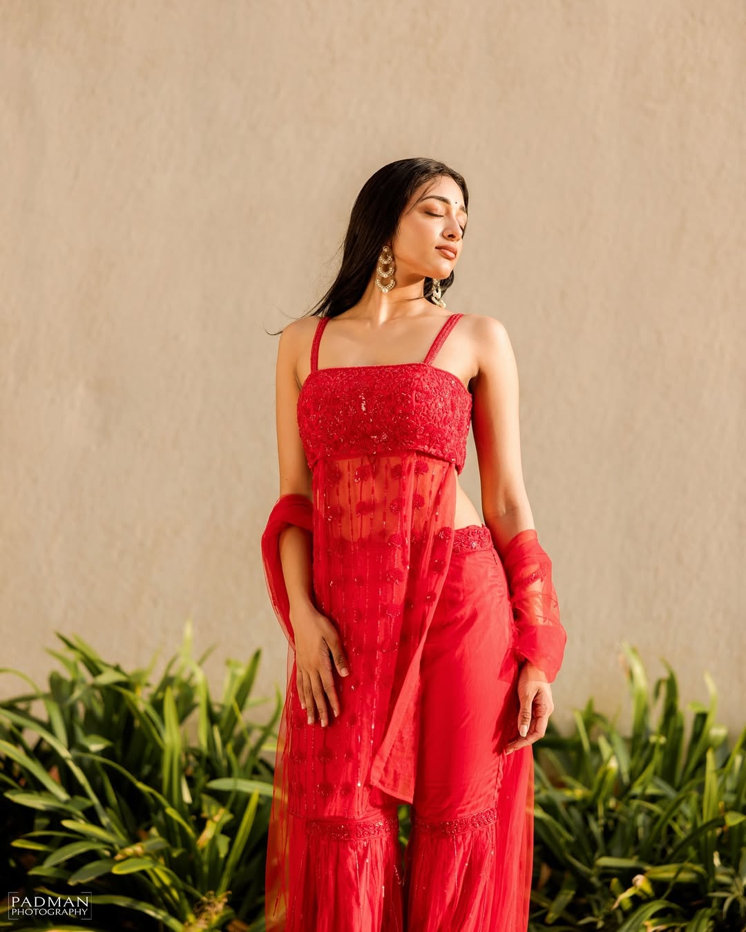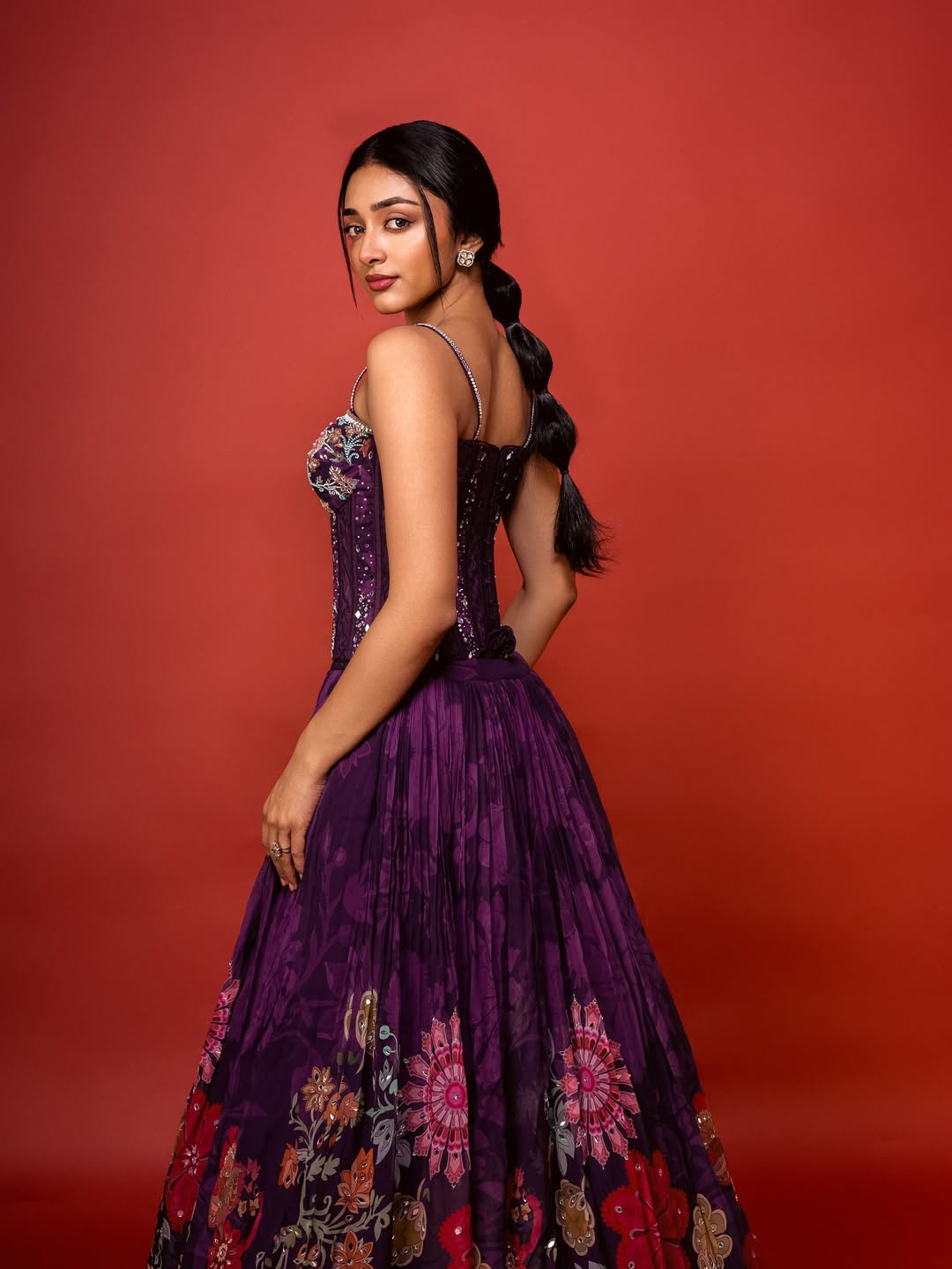 Kannappa actress Preity Mukhundhan posted a picture on Instagram. She wore a deep purple dress with colorful embroidery across the top. The dress flowed gently and had small patterns in soft shades. She added a matching sheer drape and her hair was neatly parted in the center and tied back. She wore earrings and soft makeup. The red background made her look pop even more.