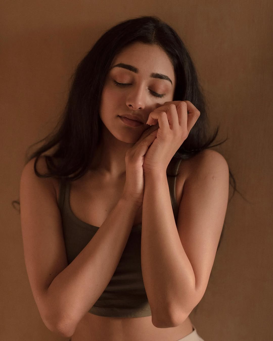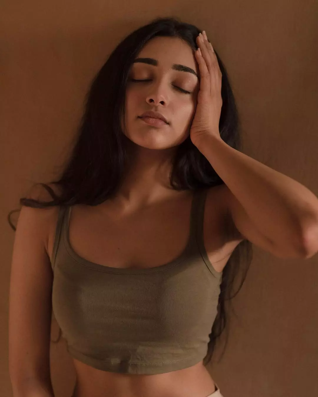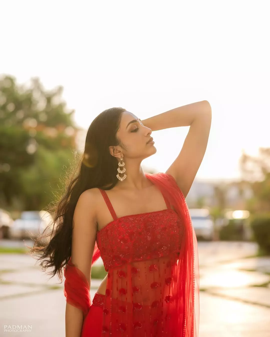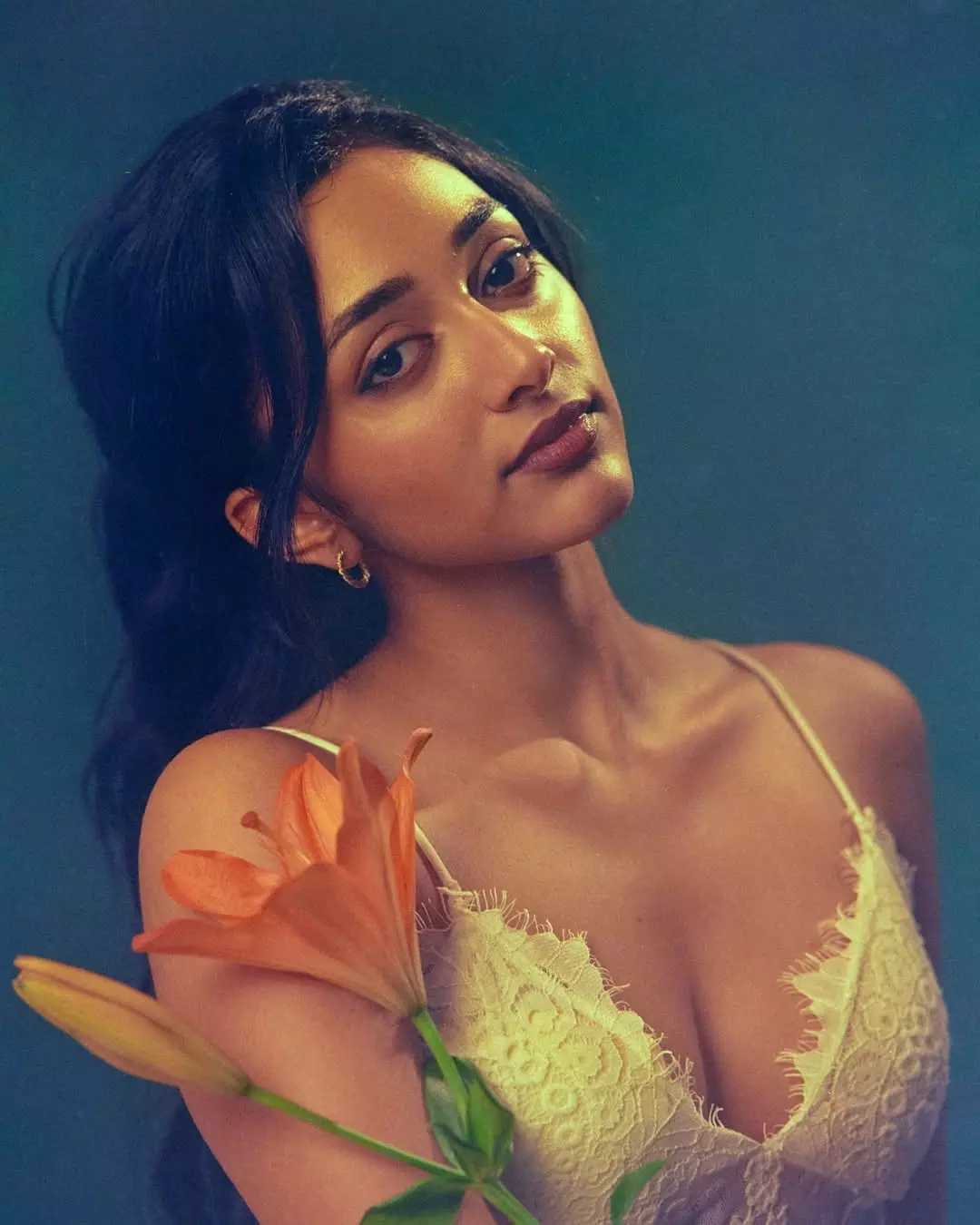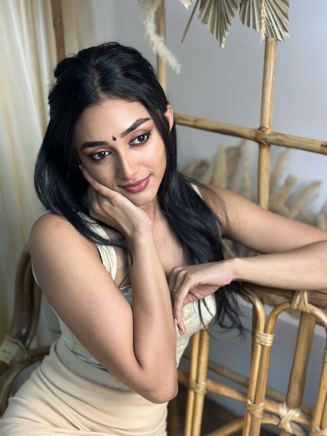Kannappa actress Preity Mukhundhan posted a picture on Instagram. She wore a deep purple dress with colorful embroidery across the top. The dress flowed gently and had small patterns in soft shades. She added a matching sheer drape and her hair was neatly parted in the center and tied back. She wore earrings and soft makeup. The red background made her look pop even more.