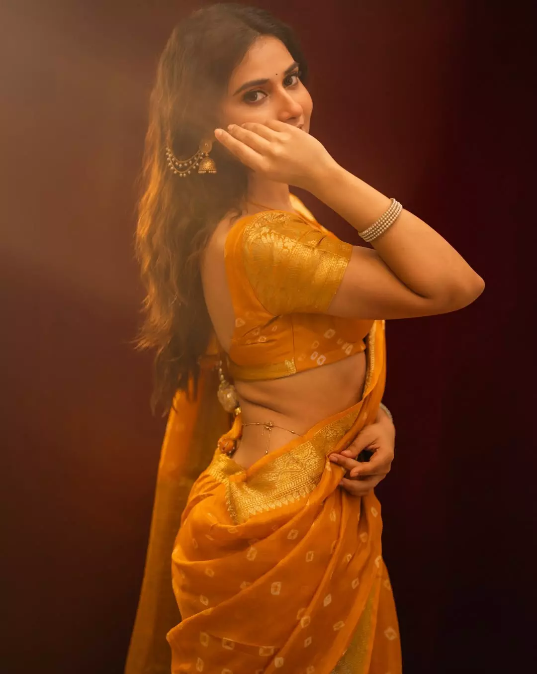 By: Tupaki Desk | 14 April 2026 10:48 PM ISTPrisha R Singh exuded timeless charm and confidence in a radiant golden yellow saree paired with a matching short-sleeved blouse. The young actress posed gracefully against a warm, dramatic backdrop, flashing a beautiful smile that highlighted her glowing skin and traditional gold jhumkas. Her look was completed with subtle makeup and minimal accessories, perfectly capturing both grace and sensuality.
