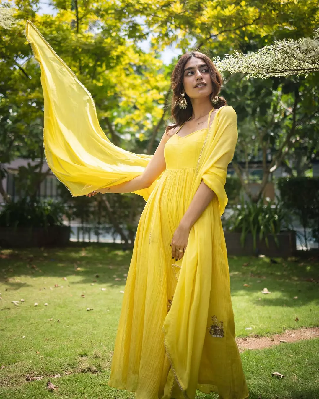 Priya Prakash Varrier looks radiant in a bright yellow dress by @ira-_india in this Instagram photo. Styled beautifully by @stylewithmay and @mayzaideh-_khalid, she pairs her look with statement earrings from @goldencup-_rental-_jewellery. Her soft glam look is crafted by @vasan-_makeupartist and the moment is captured perfectly by photographer @premsampaul.