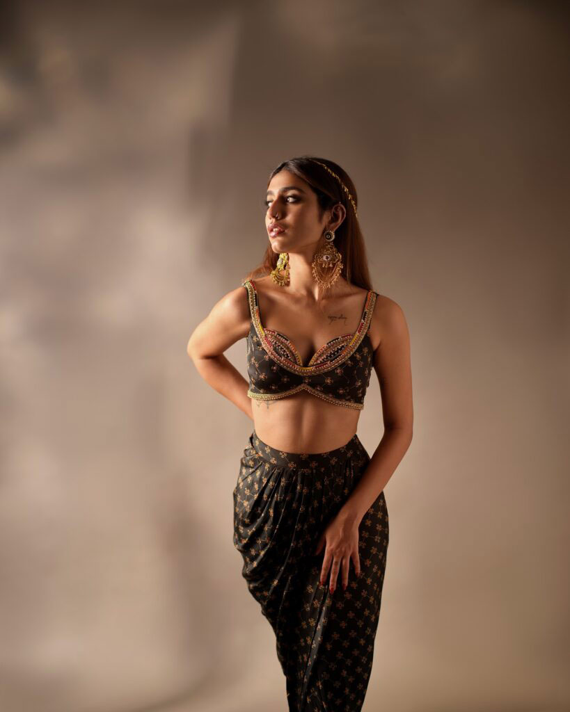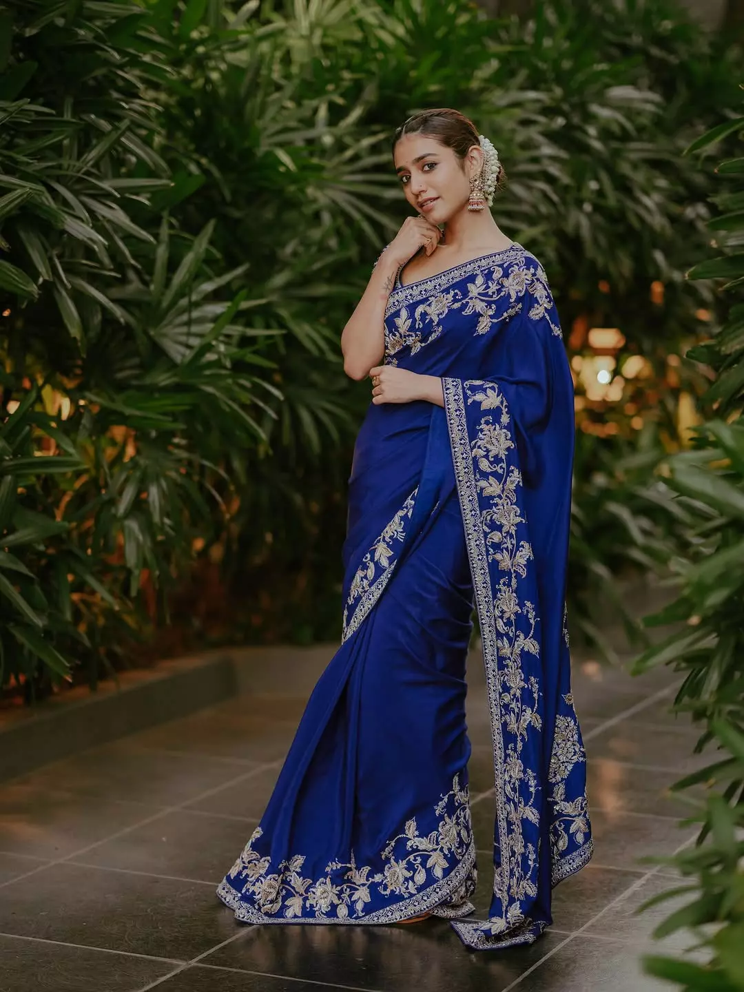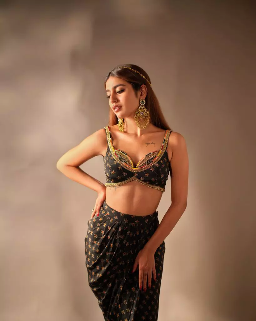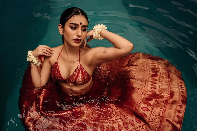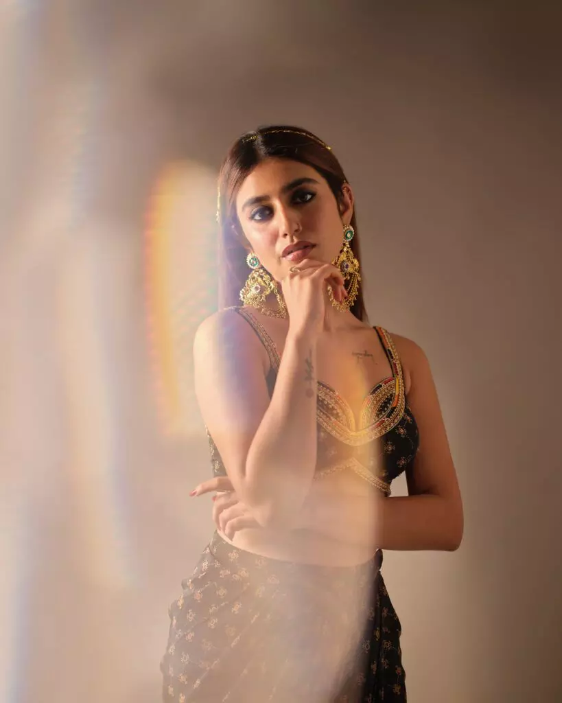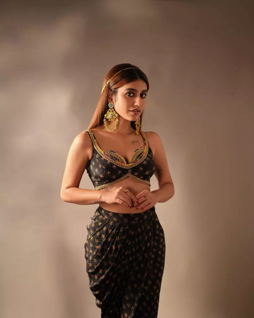 In her recent creative photoshoot, Priya embraced a striking black saree that perfectly blends tradition with contemporary style. The saree’s soft printed patterns and the blouse’s intricate cutwork and detailed borders create a chic yet classic look. The dark hue lends her ensemble a bold, confident vibe — effortlessly balancing elegance with youthful freshness.