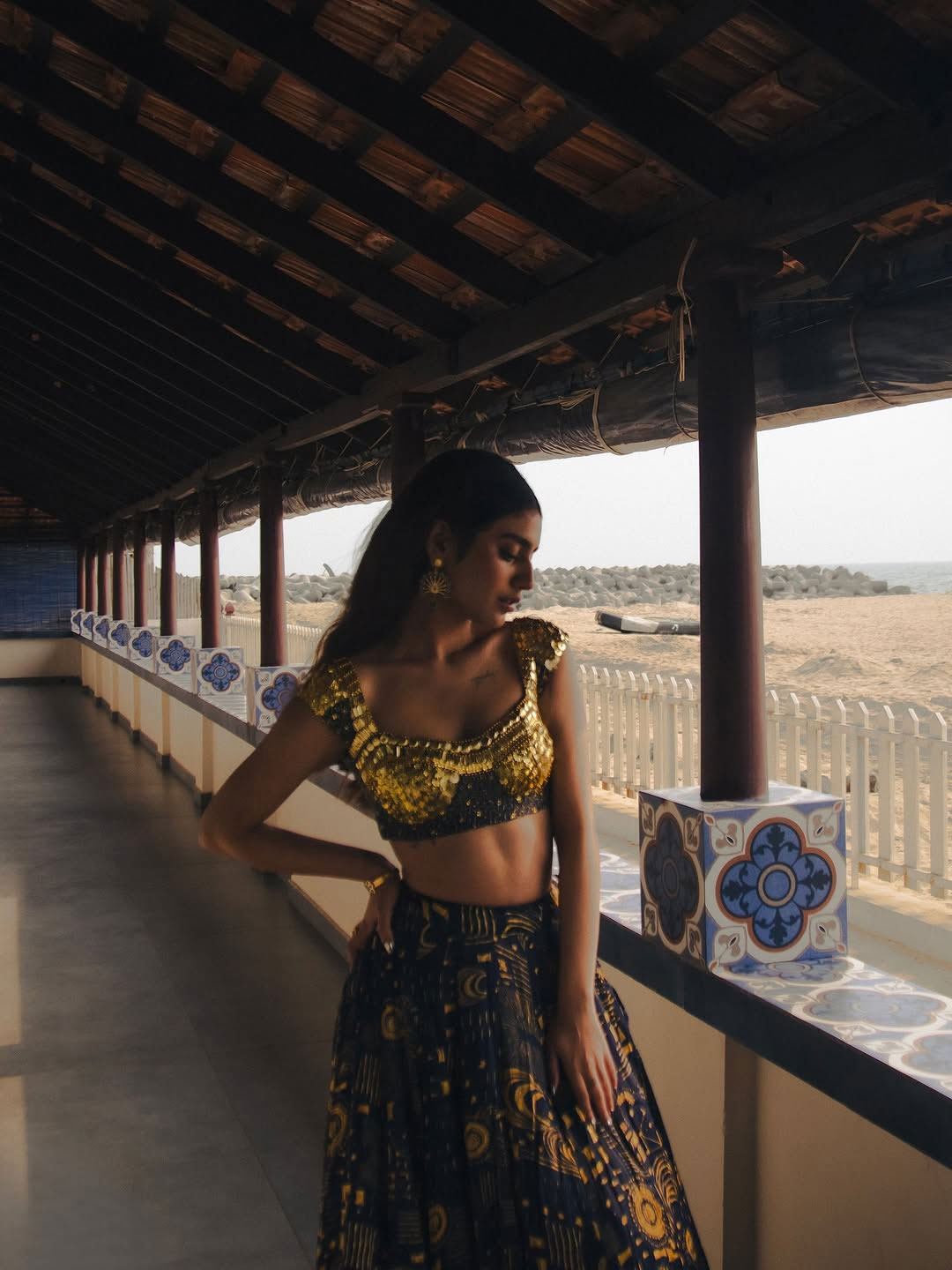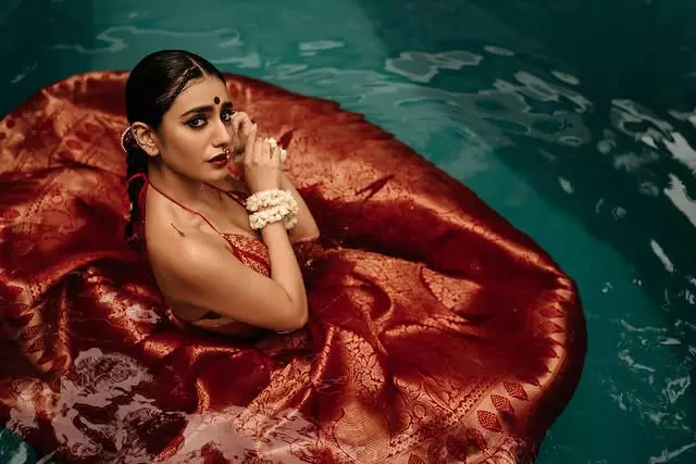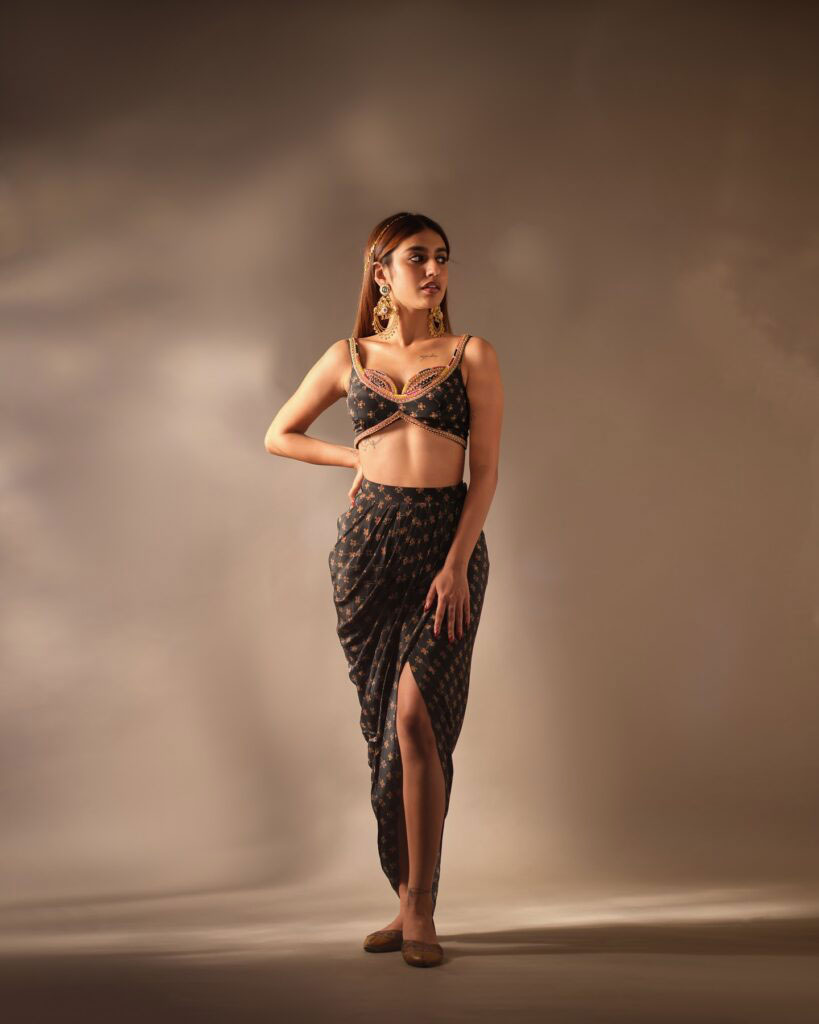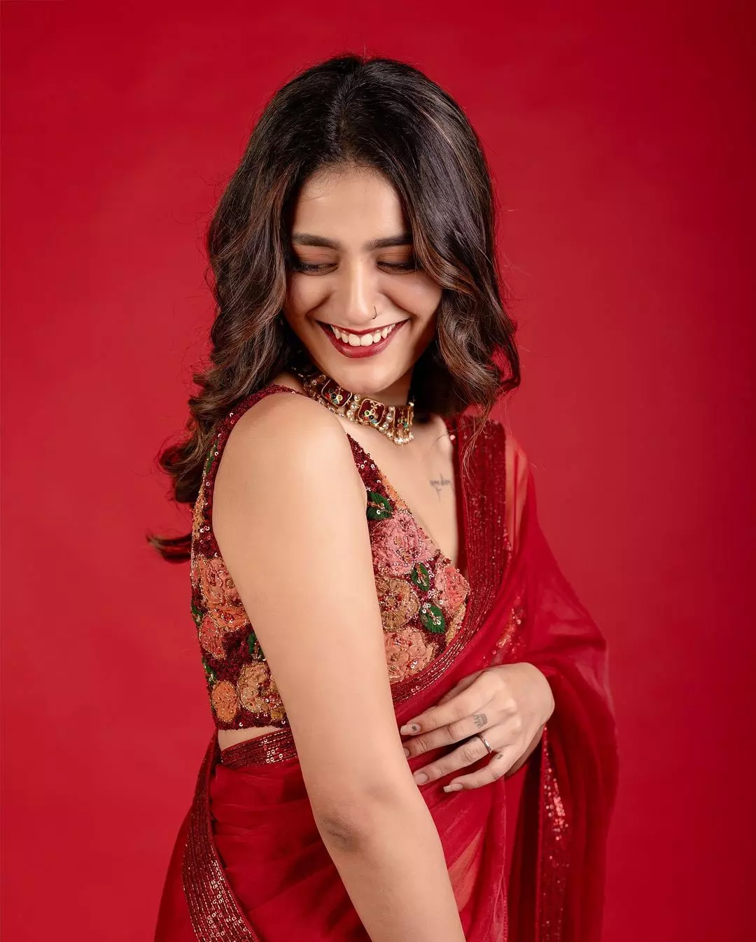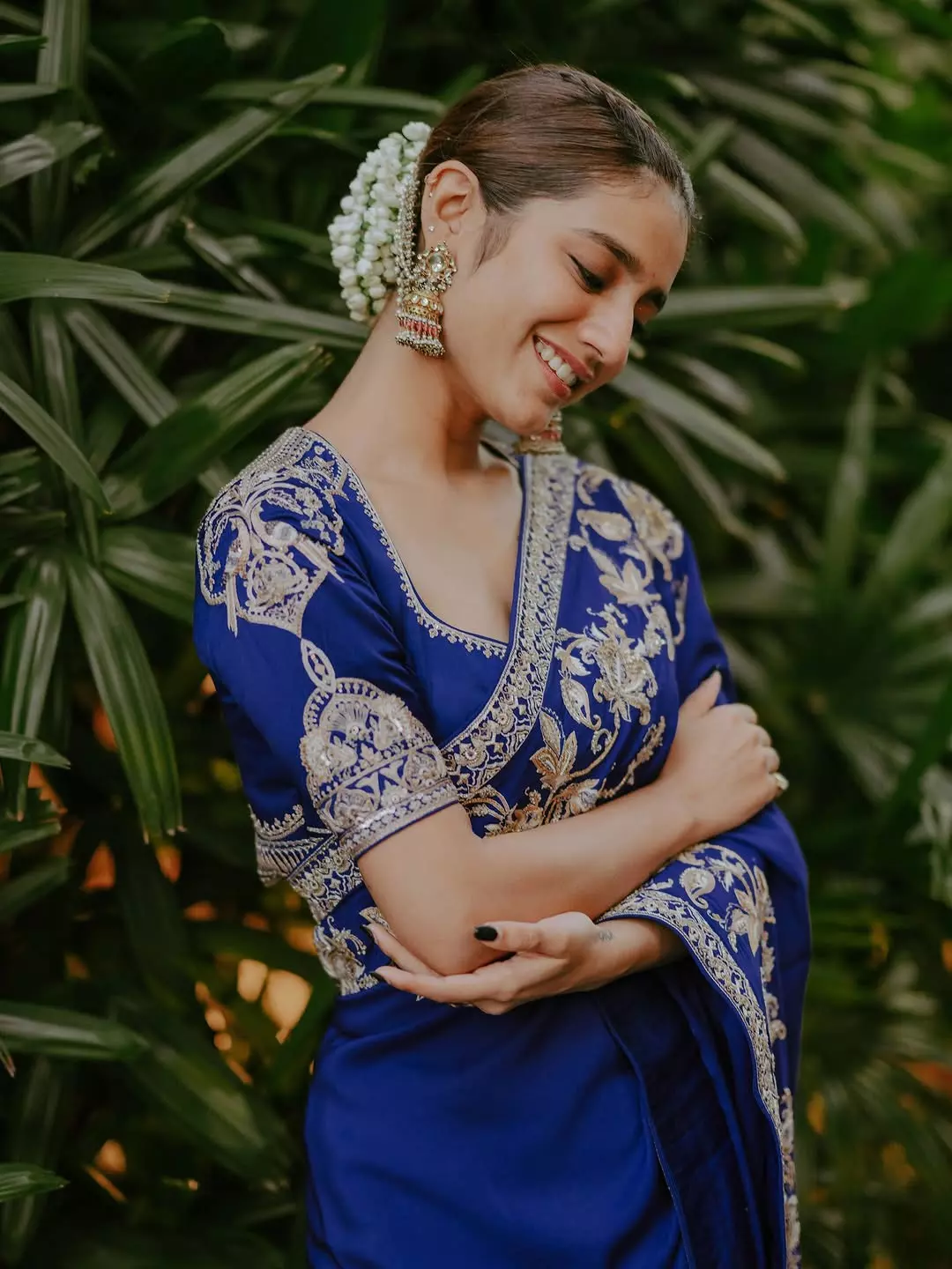 In her recent creative photoshoot, Priya embraced a striking black saree that perfectly blends tradition with contemporary style. The saree’s soft printed patterns and the blouse’s intricate cutwork and detailed borders create a chic yet classic look. The dark hue lends her ensemble a bold, confident vibe — effortlessly balancing elegance with youthful freshness.