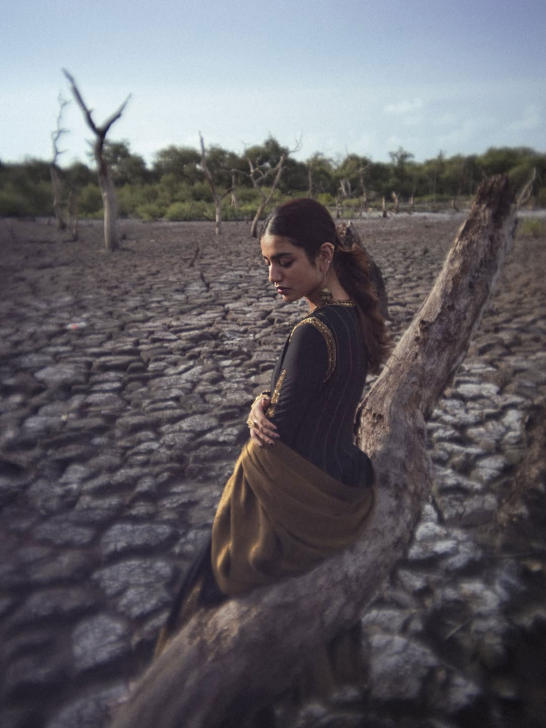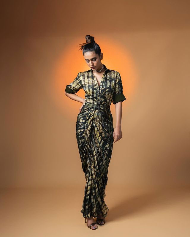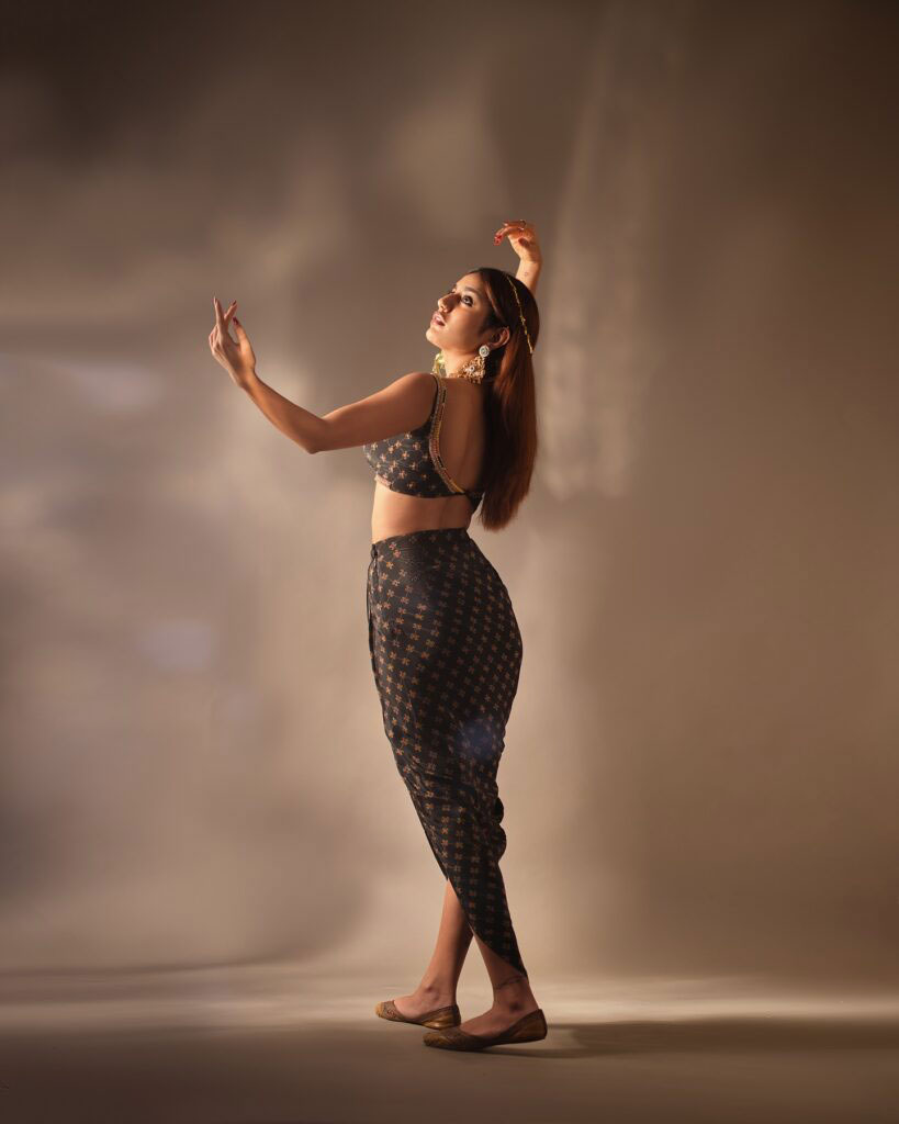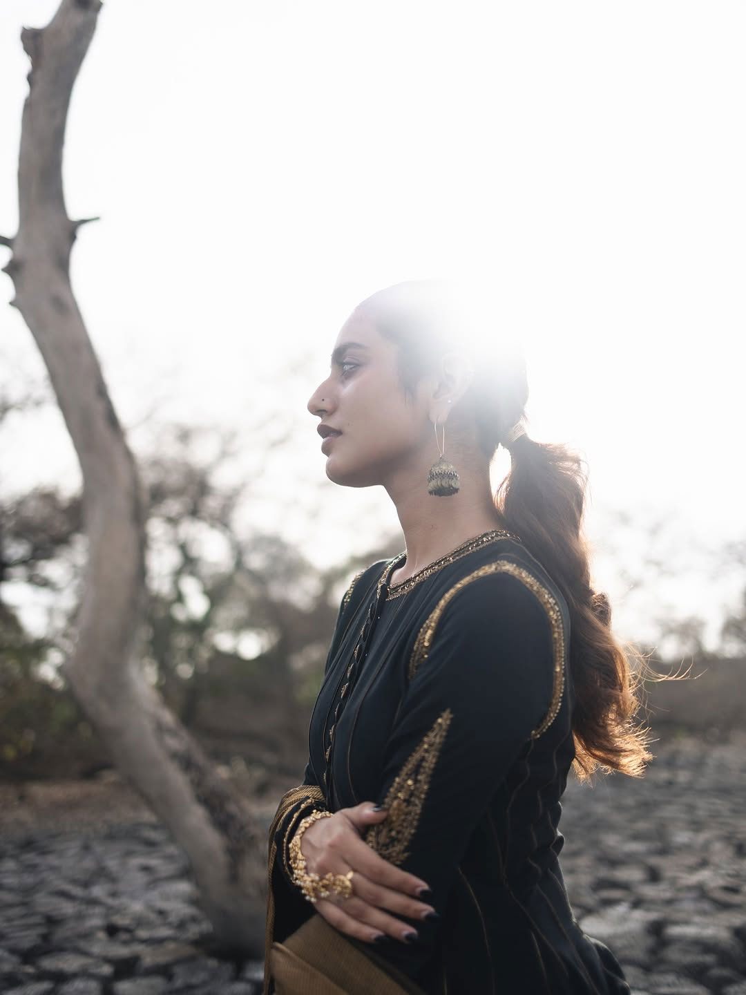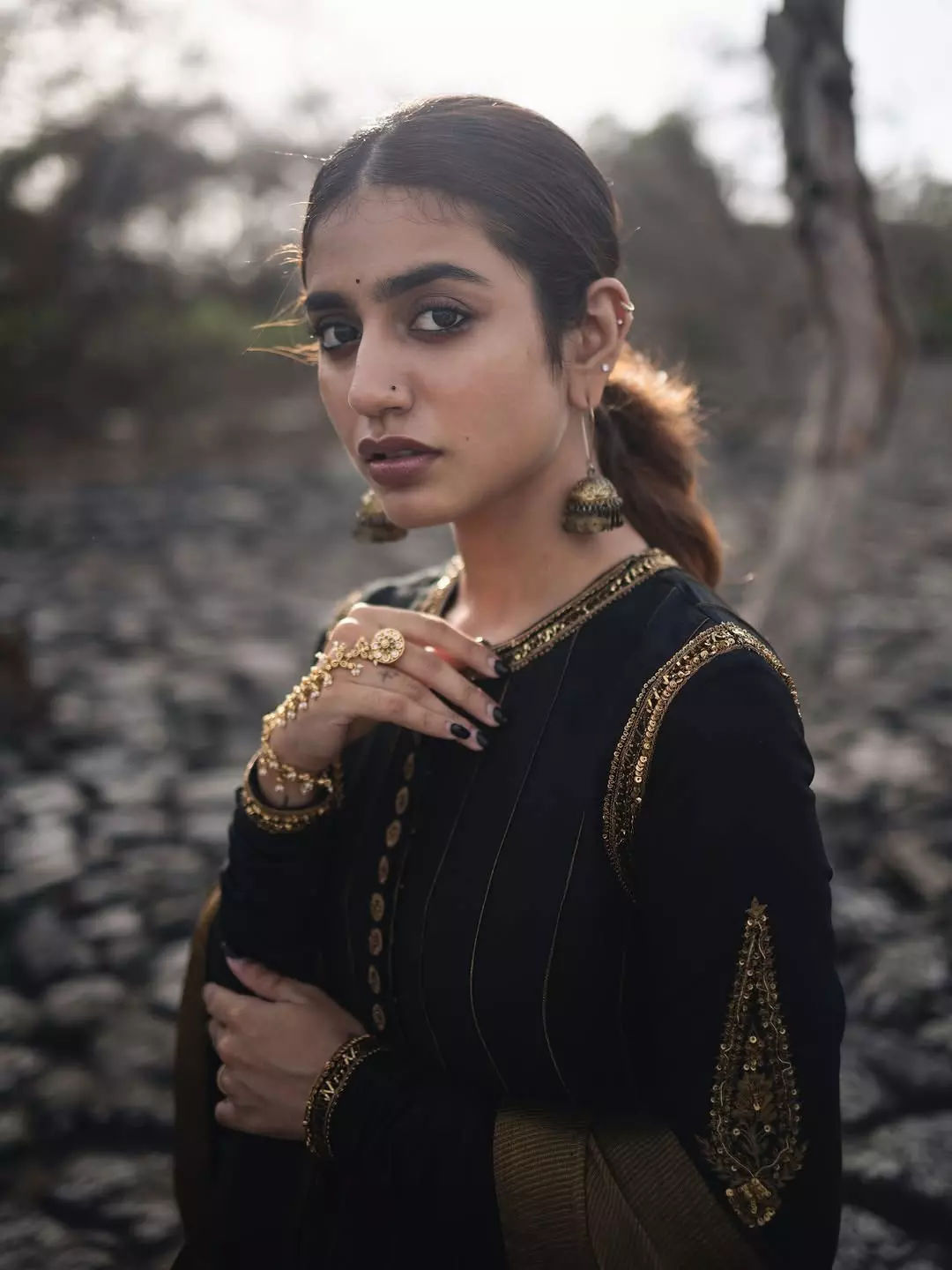 In her recent creative photoshoot, Priya embraced a striking black saree that perfectly blends tradition with contemporary style.