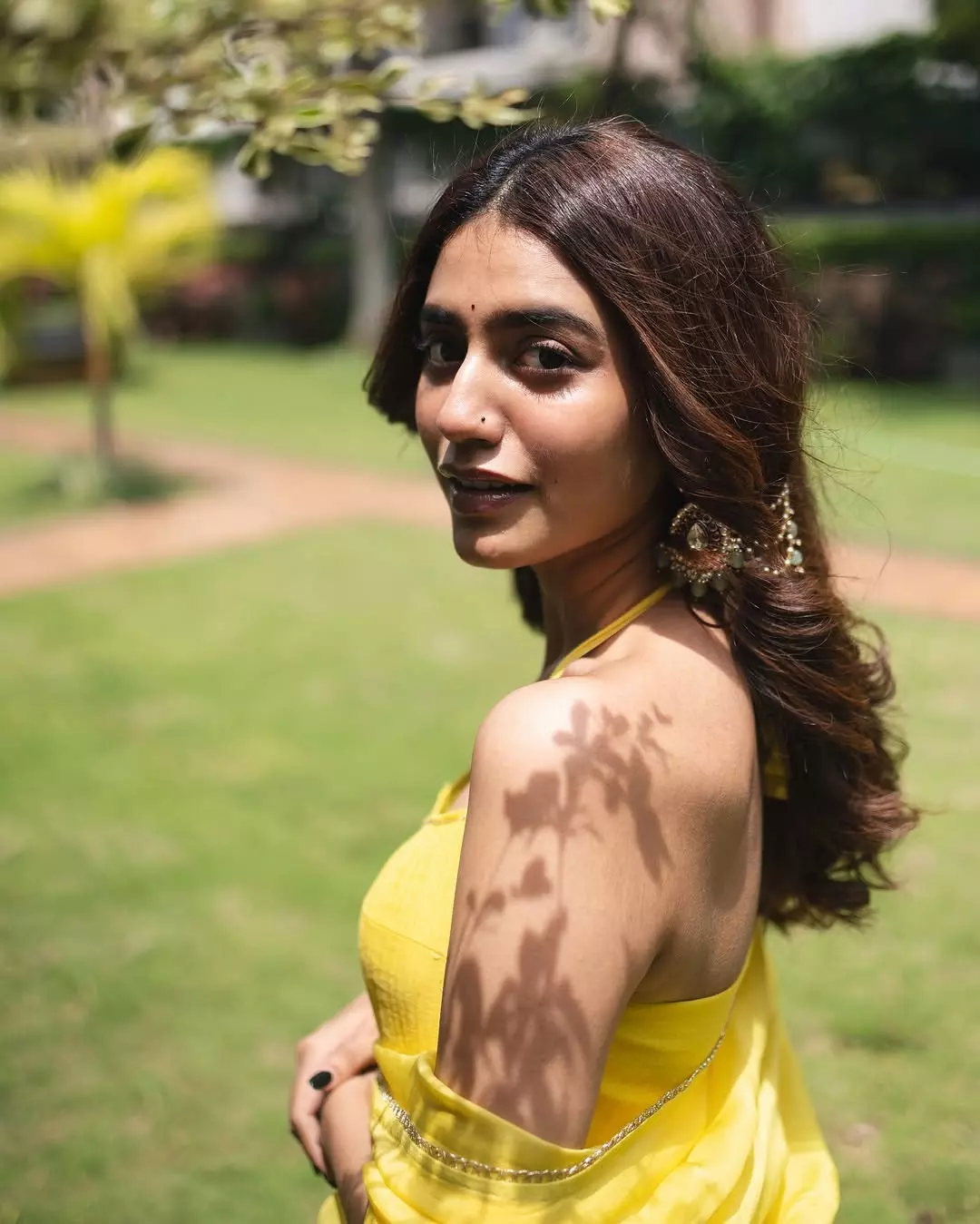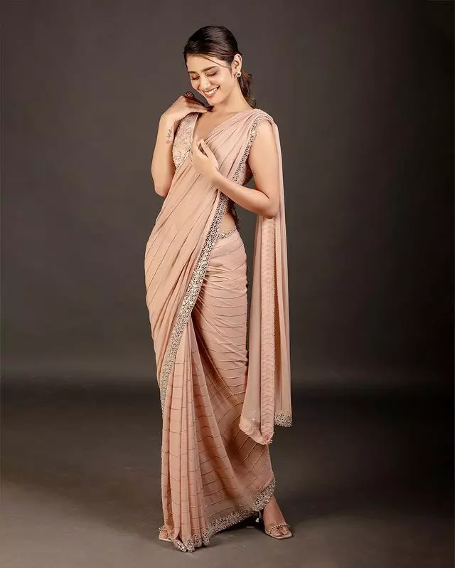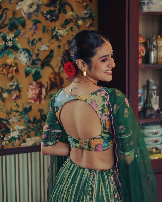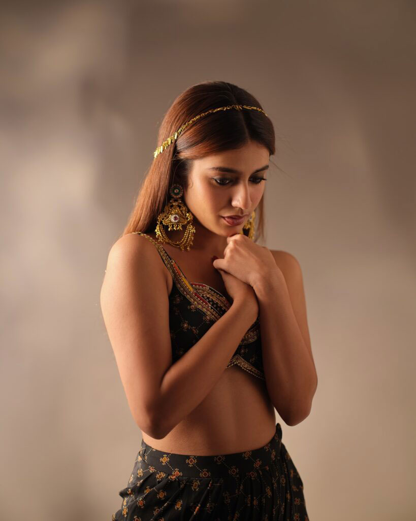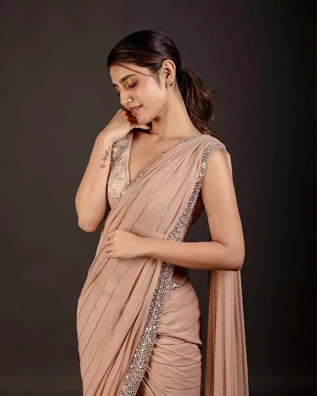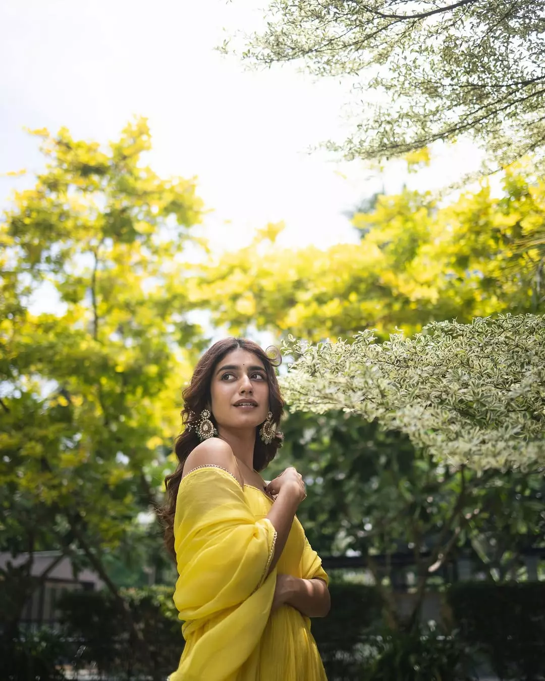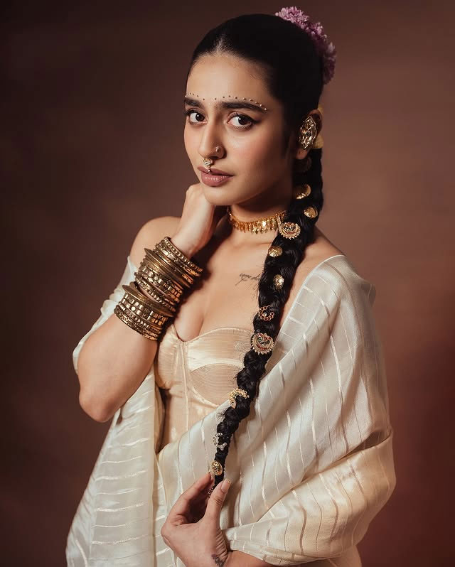 Her accessories added the perfect finishing touch: oversized chandbali earrings beautifully framed her face, while a delicate golden hairpiece lent her a regal aura. With minimal makeup and her signature natural charm, Priya’s authentic beauty shines through.