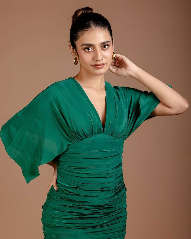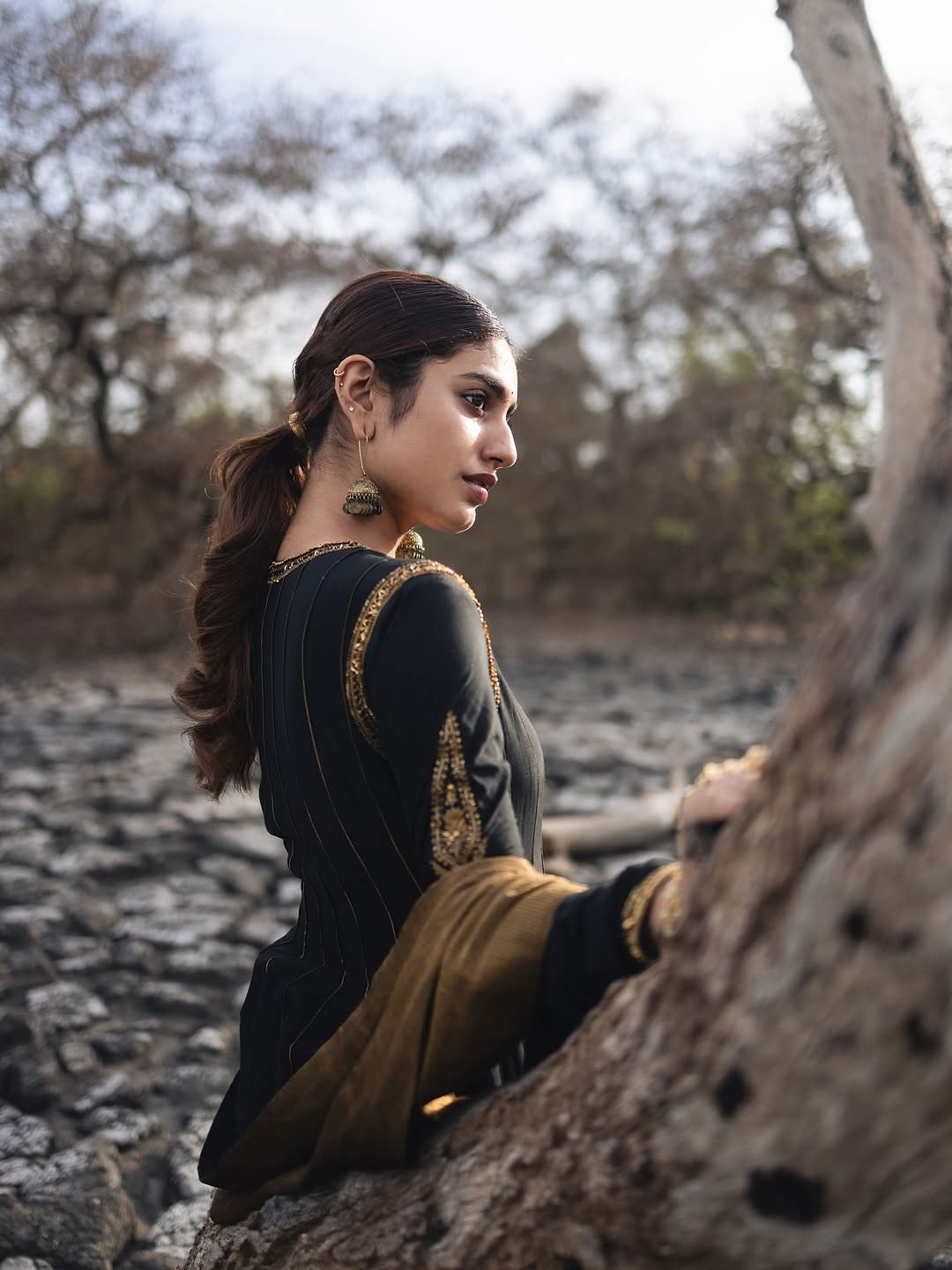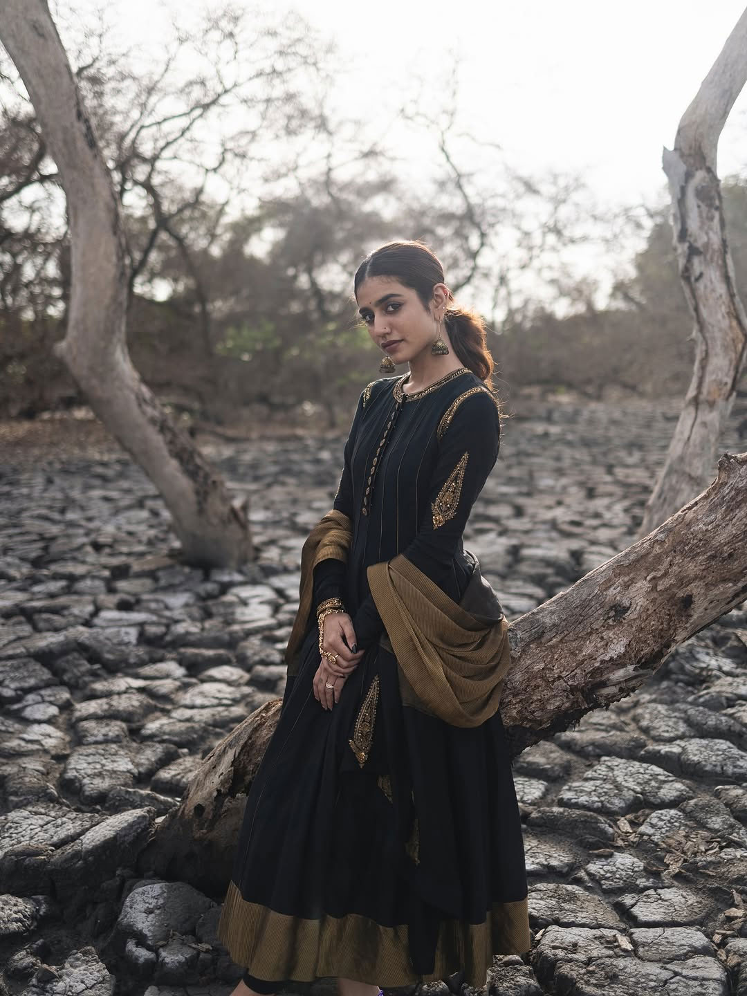 In the Instagram picture above, Priya is seen in a artistic setting a dry, cracked land with tree stumps, giving a raw and emotional vibe. She is wearing a dark, elegant dress by @tanva-_by-_deepika and styled by @mayzaideh-_khalid and @stylewithmay-_. The photo was taken by @premsampaul with makeup by @vasan-_makeupartist and jewelry by @goldencup-_rental-_jewellery. The entire look and feel of the photo match the caption: "It’s like killing yourself, and then you’re reborn." This quote may reflect Priya’s personal growth or journey in the film industry going through tough phases and coming out stronger.