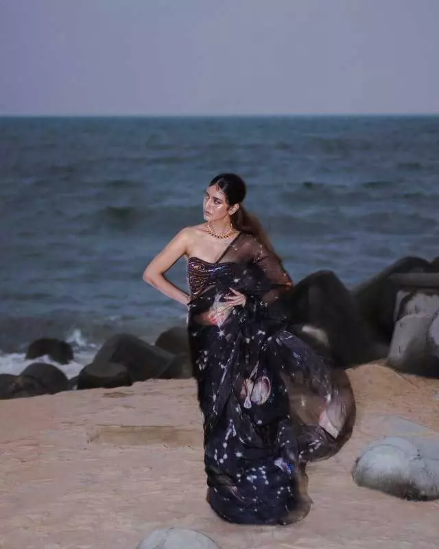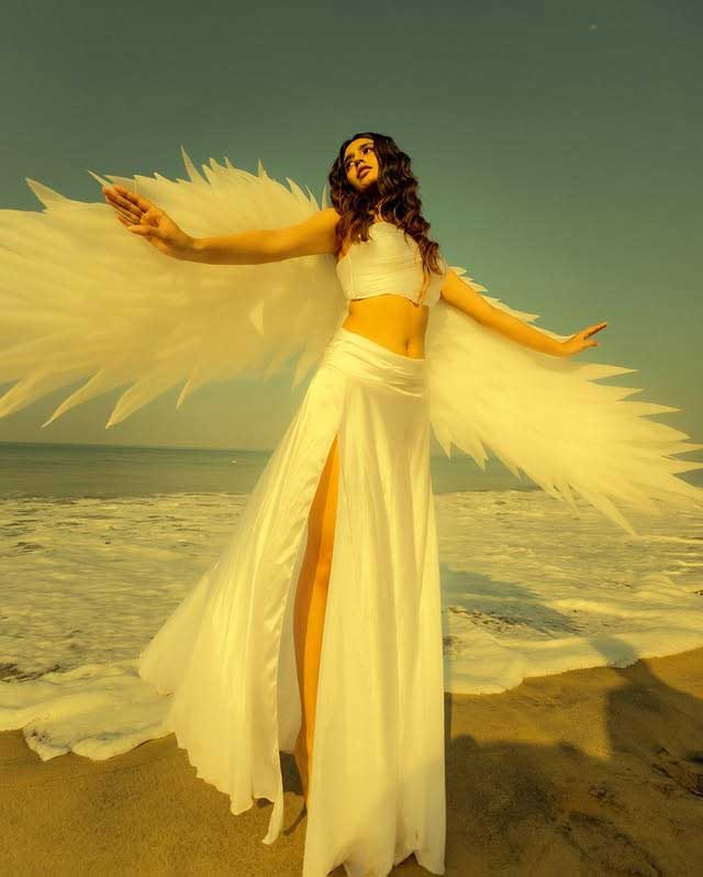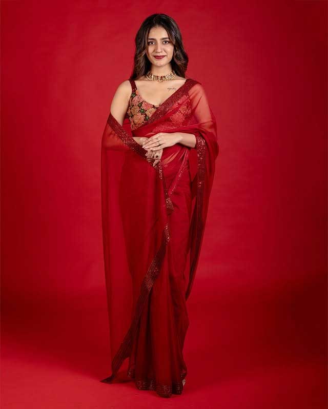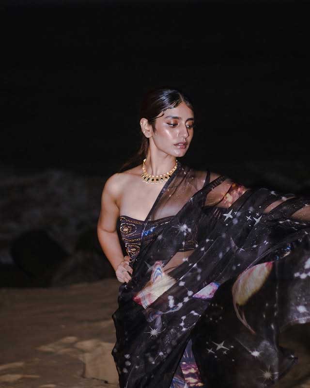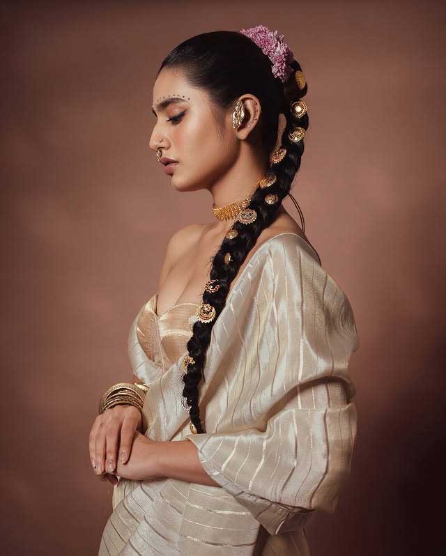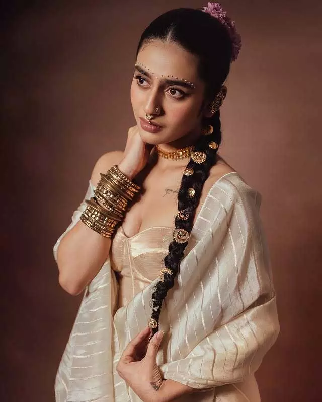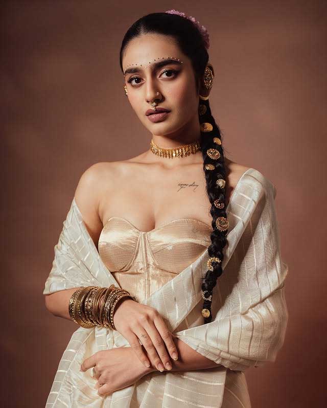 Actress Priya Prakash Varrier recently shared a photo on Instagram that quickly went viral. She is seen dressed in a traditional white saree with a golden border from @jaanki-_sarees-_, she stood in a serene water setting, looking effortlessly graceful. The look was completed with makeup by @sreegeshvasan-_makeupartist and photography by @a-_isography. Her caption in Malayalam, “അവളുടെ കണ്ണുകളിലെ അമ്പുകൾ…” (translating to “the arrows in her eyes…”) paired with a lotus emoji.