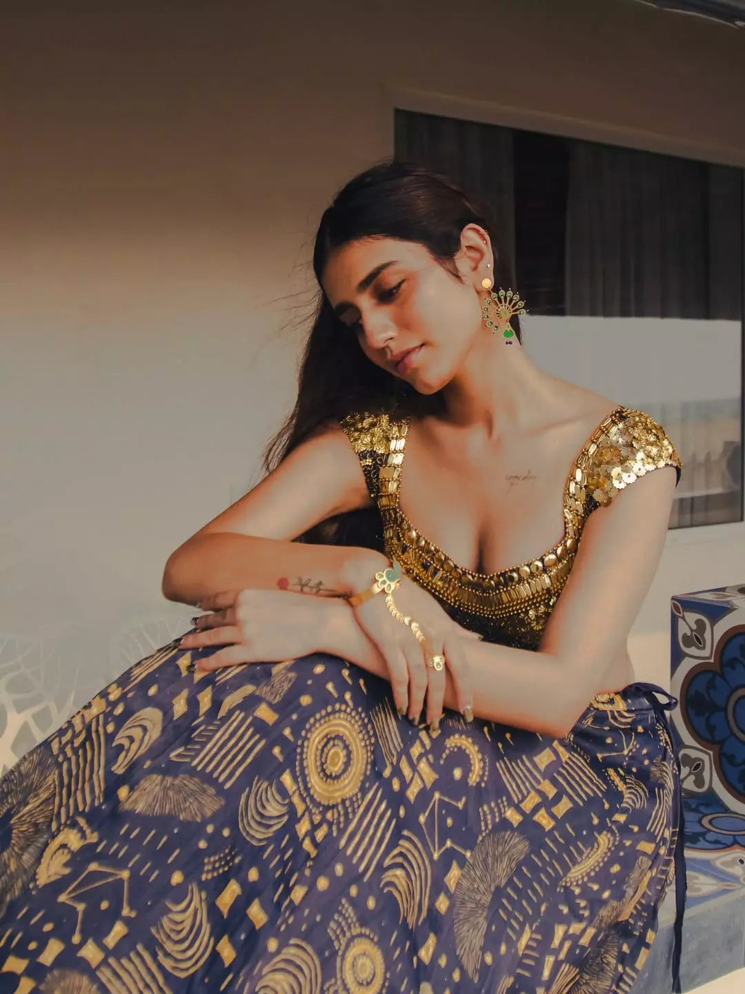 The outfit, paired with delicate heels and minimal, reflects her effortless blend of sophistication and modern chic. Her poised look by the radiates confidence, making it a perfect mix of style and serenity.