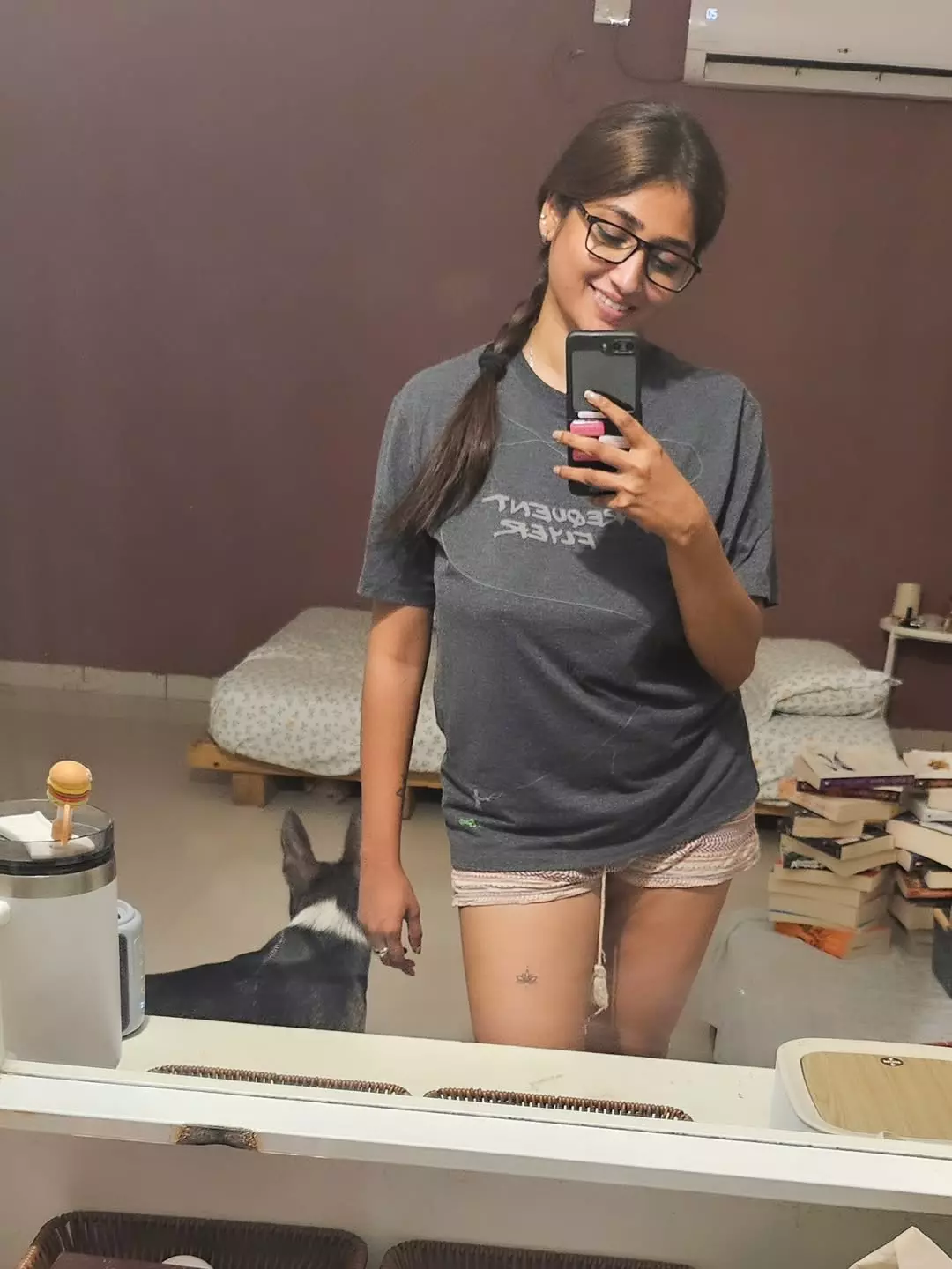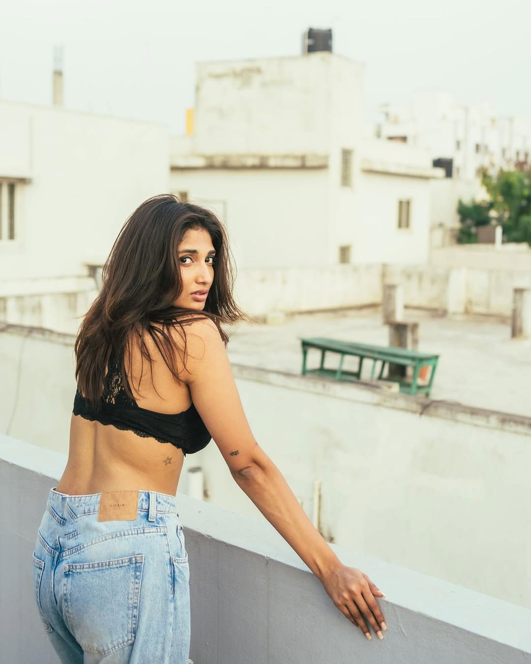 The captivating photo showcases Priya on a sunlit urban rooftop in a black lace bralette paired with high-waisted light blue jeans, her long wavy hair flowing, back turned with a confident glance over her shoulder. Her toned physique, star tattoo on her lower back, and "thot" ink on her arm add edgy allure against the cityscape backdrop, radiating bold sensuality and effortless cool.