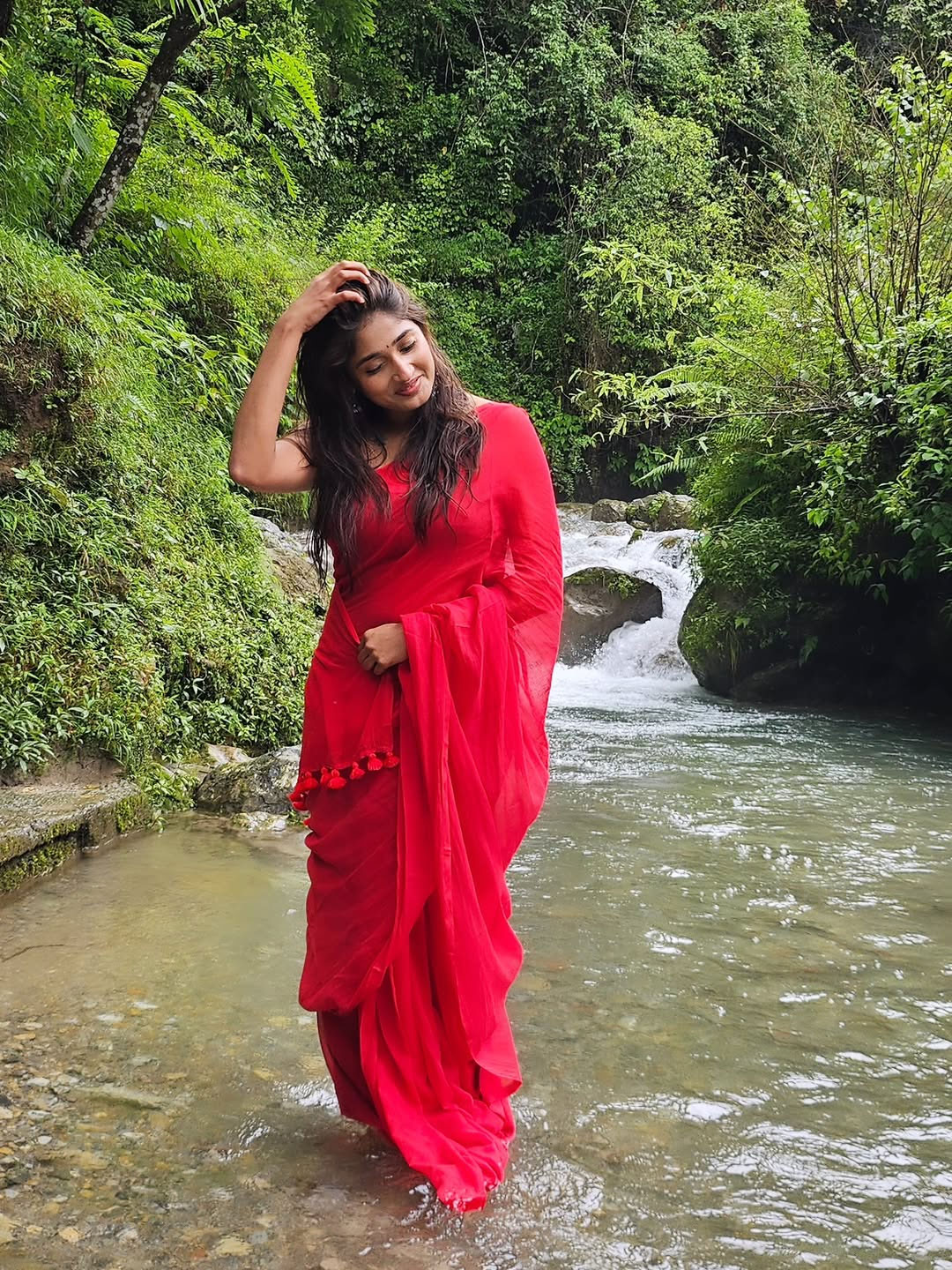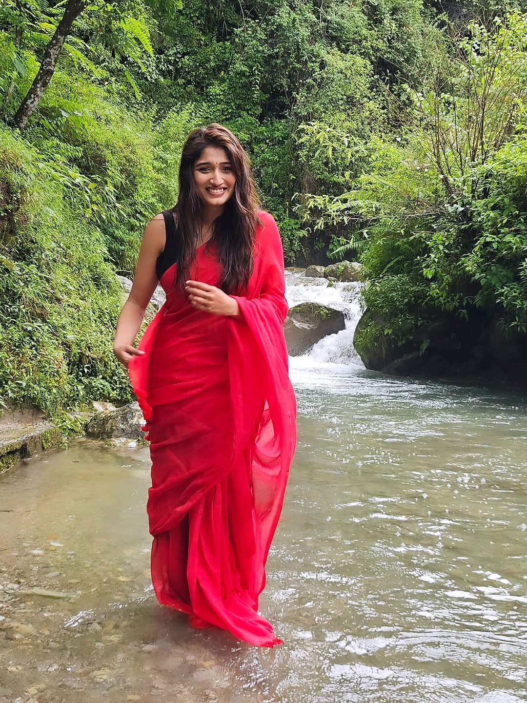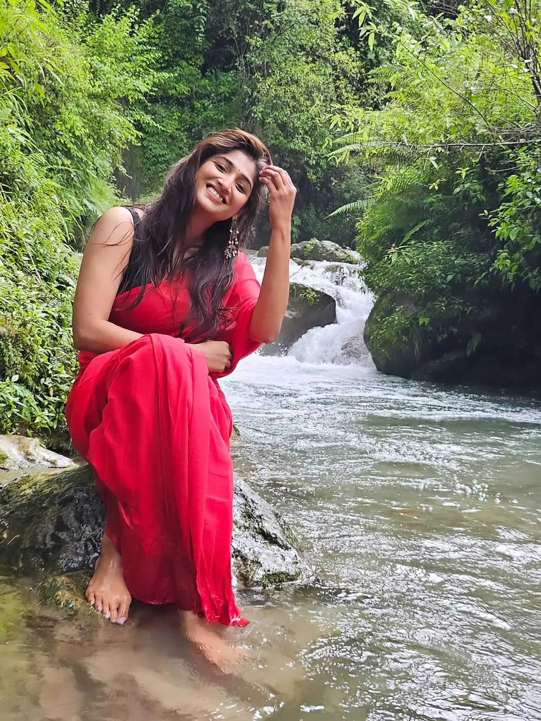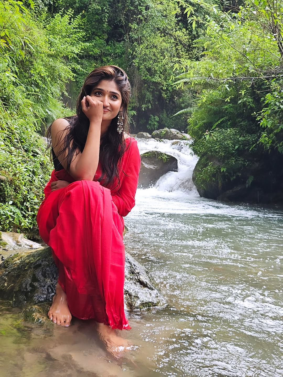 In the photo, Priya looks adorable in a bright red outfit as she sits on a rock near a calm stream with a waterfall in the background.
