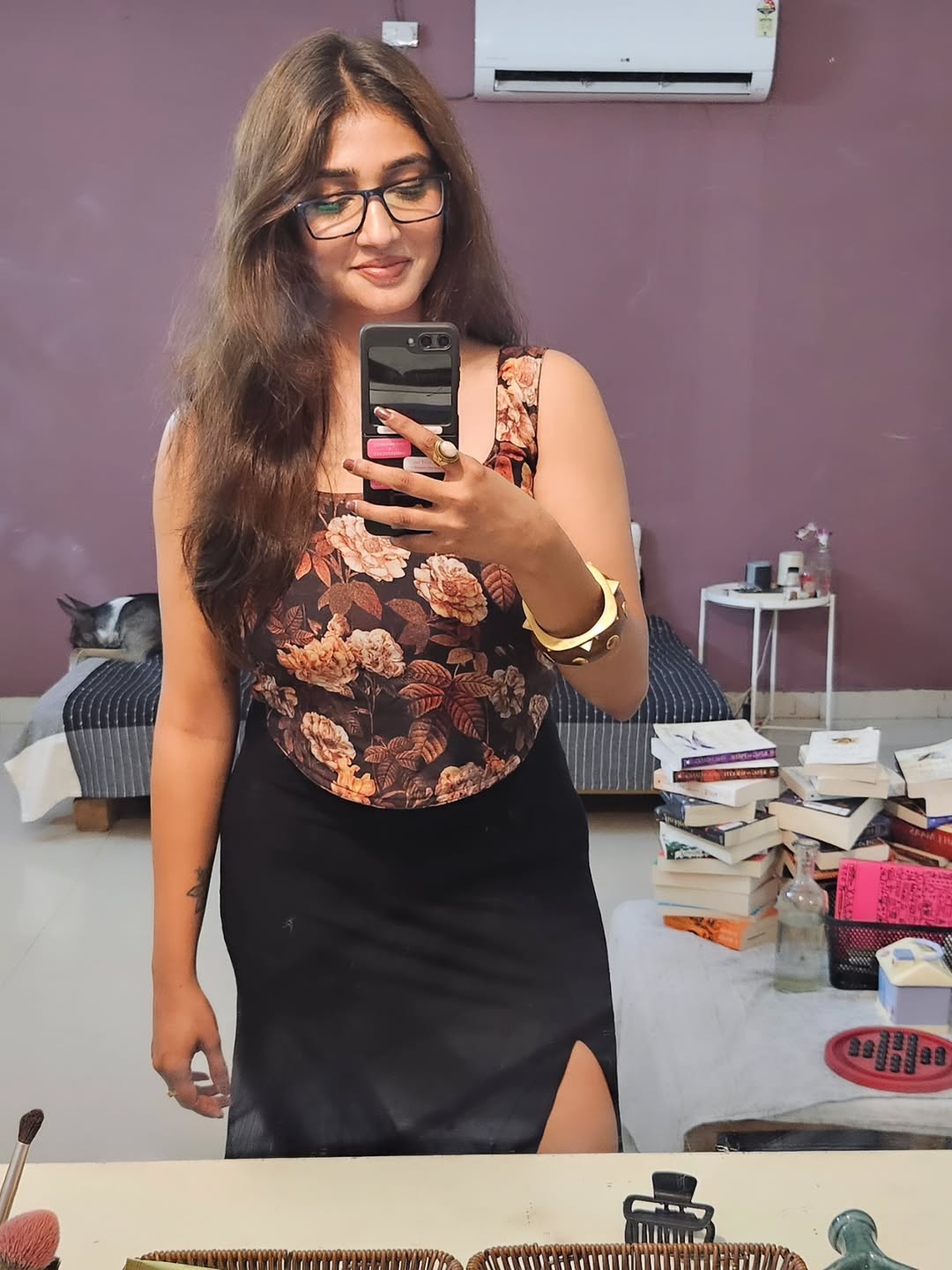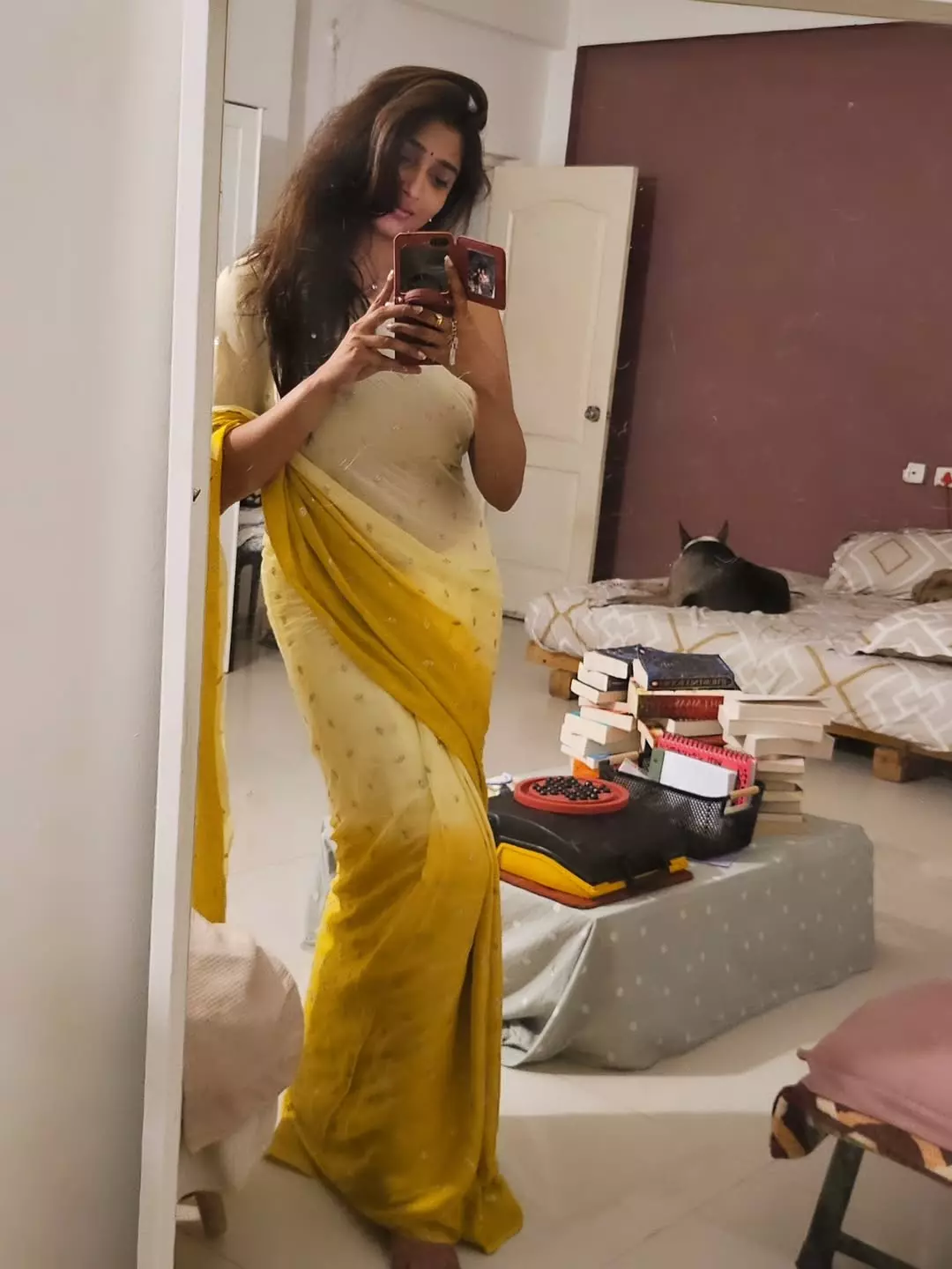 In the shared image, Priya is seen smiling warmly, dressed in a striking black and yellow saree, highlighting her appreciation for traditional attire. Posted on platforms like Instagram and Threads, the selfie reflects her effortless elegance and the joyful charm she carries both on and off screen.