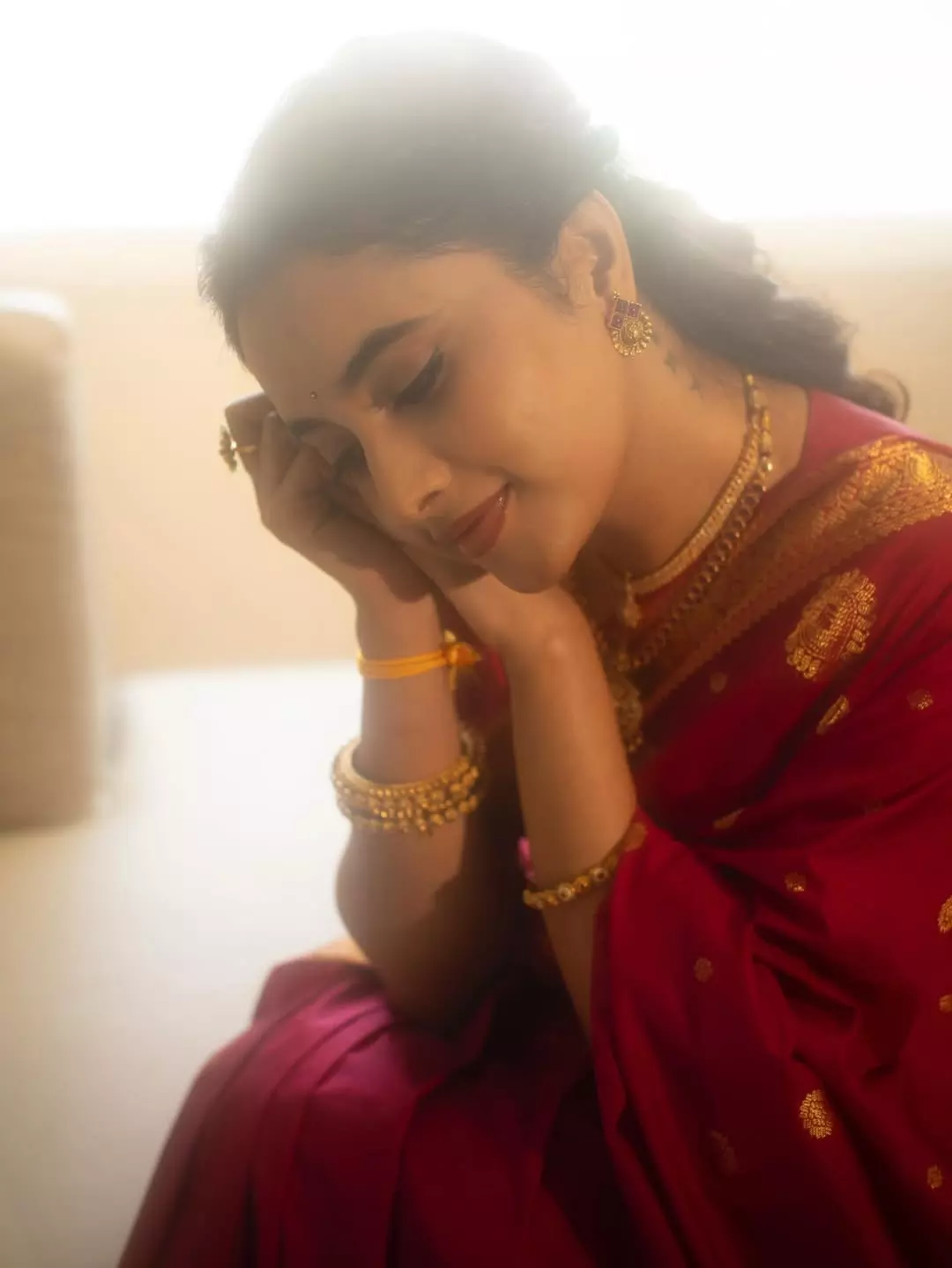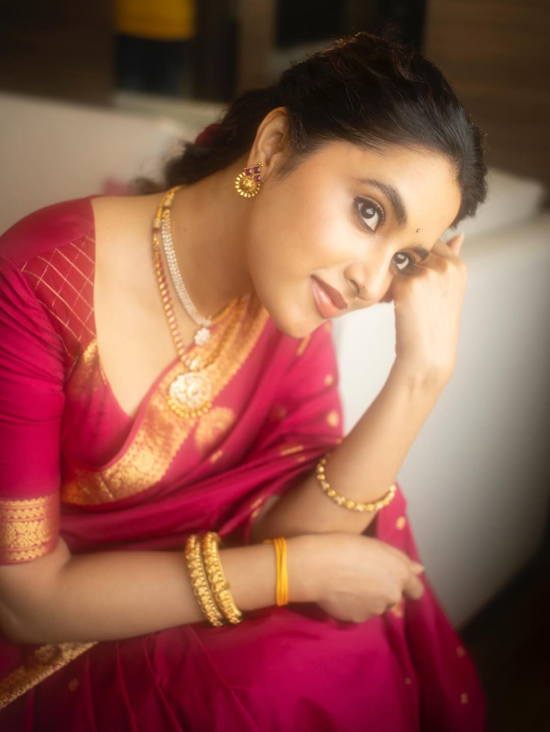 Priyanka Arul Mohan looks like a red rose in her recent pics and continues to win hearts. Her latest Instagram post caught the attention of fans. In the picture, she is seen standing near a softly lit window by wearing a rich maroon saree with golden designs.