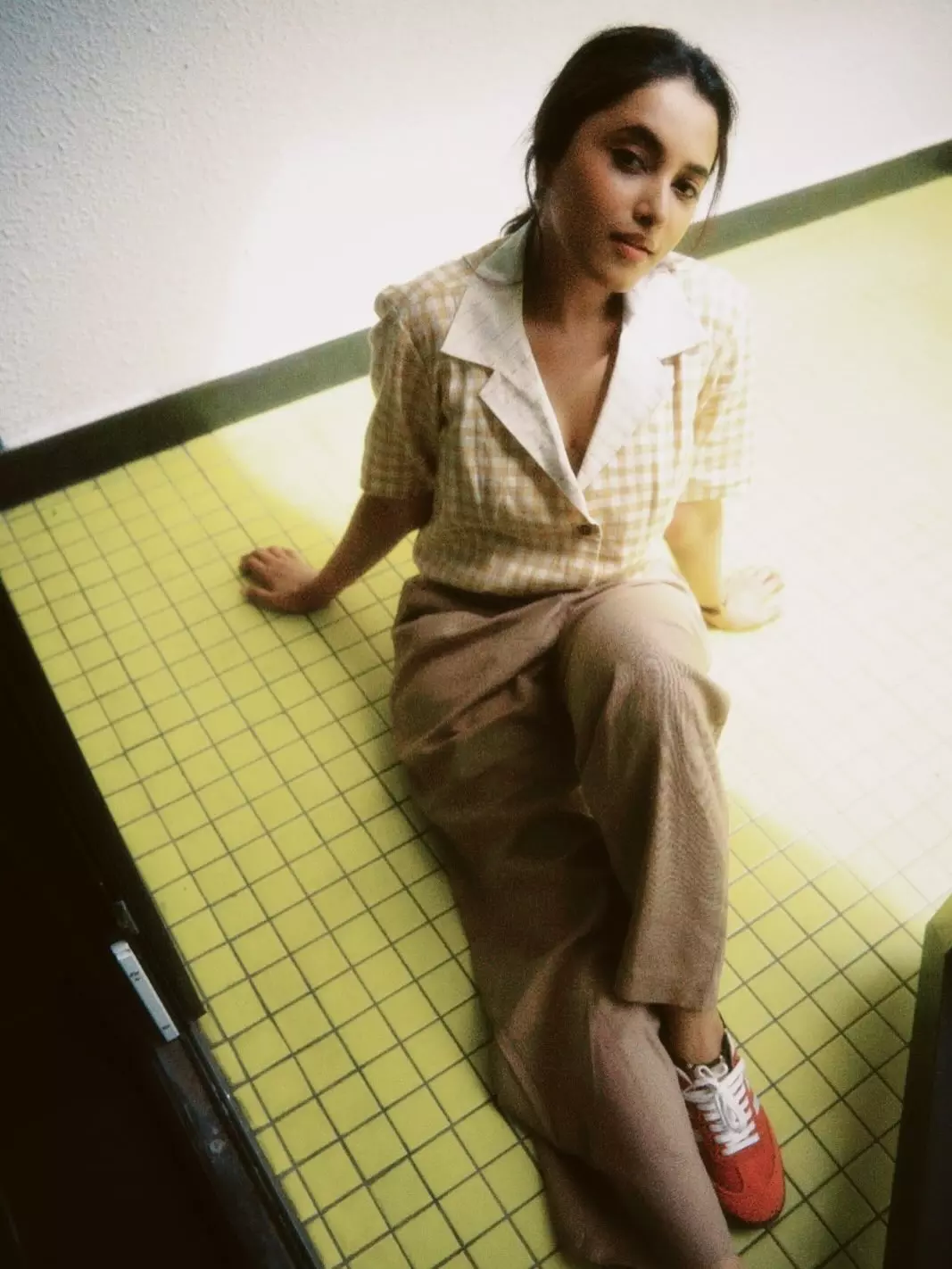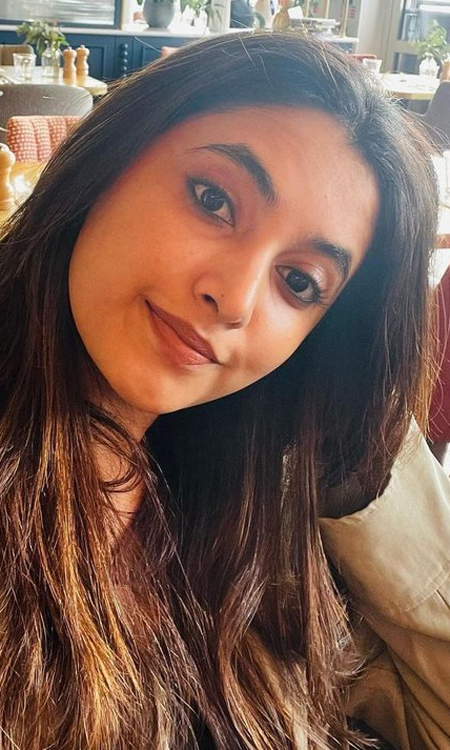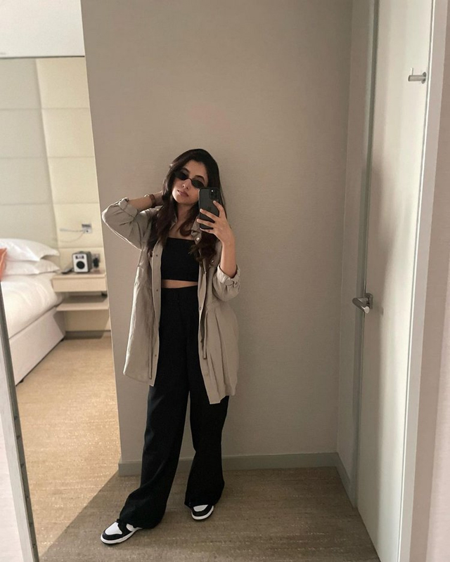Her beauty look stays true to her subtle style—glowing skin, soft nude tones, and lightly defined eyes that let her natural radiance take center stage.