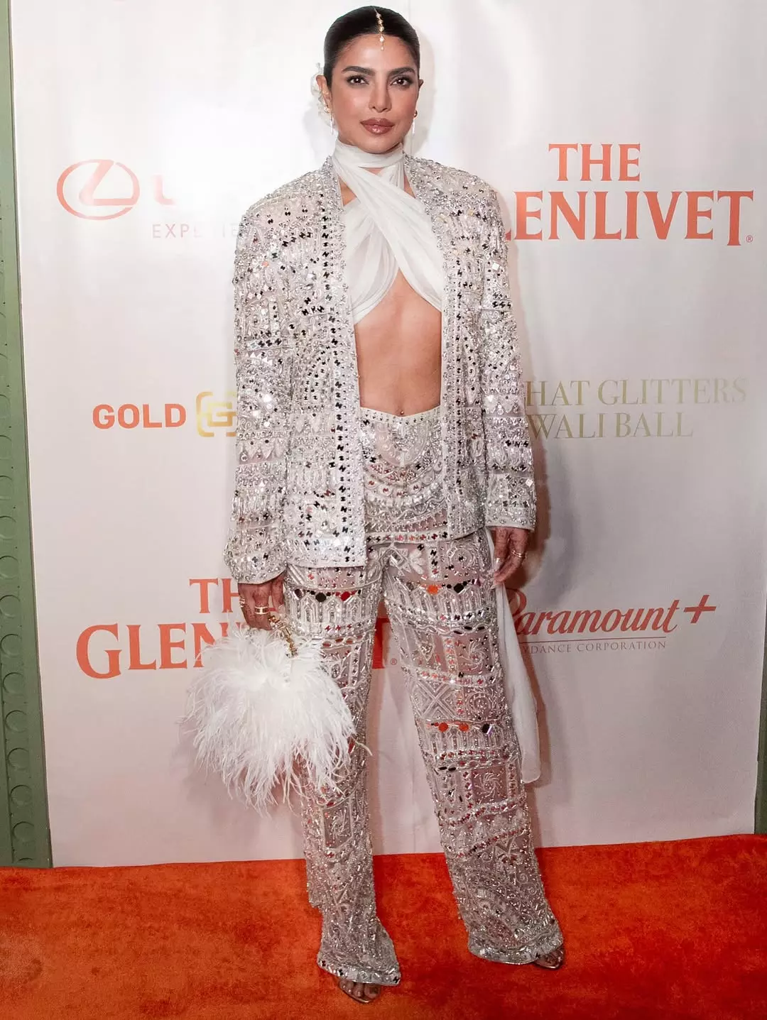 Priyanka looked dazzling in a mirror work embroidered drwss that perfectly blended traditional Indian craftsmanship with a modern twist. Her attire included a shimmering silver jacket and matching pants paired with a soft drape that added grace to her look. The actress completed her ensemble with a delicate maang tikka, diamond earrings and a white feathered clutch.