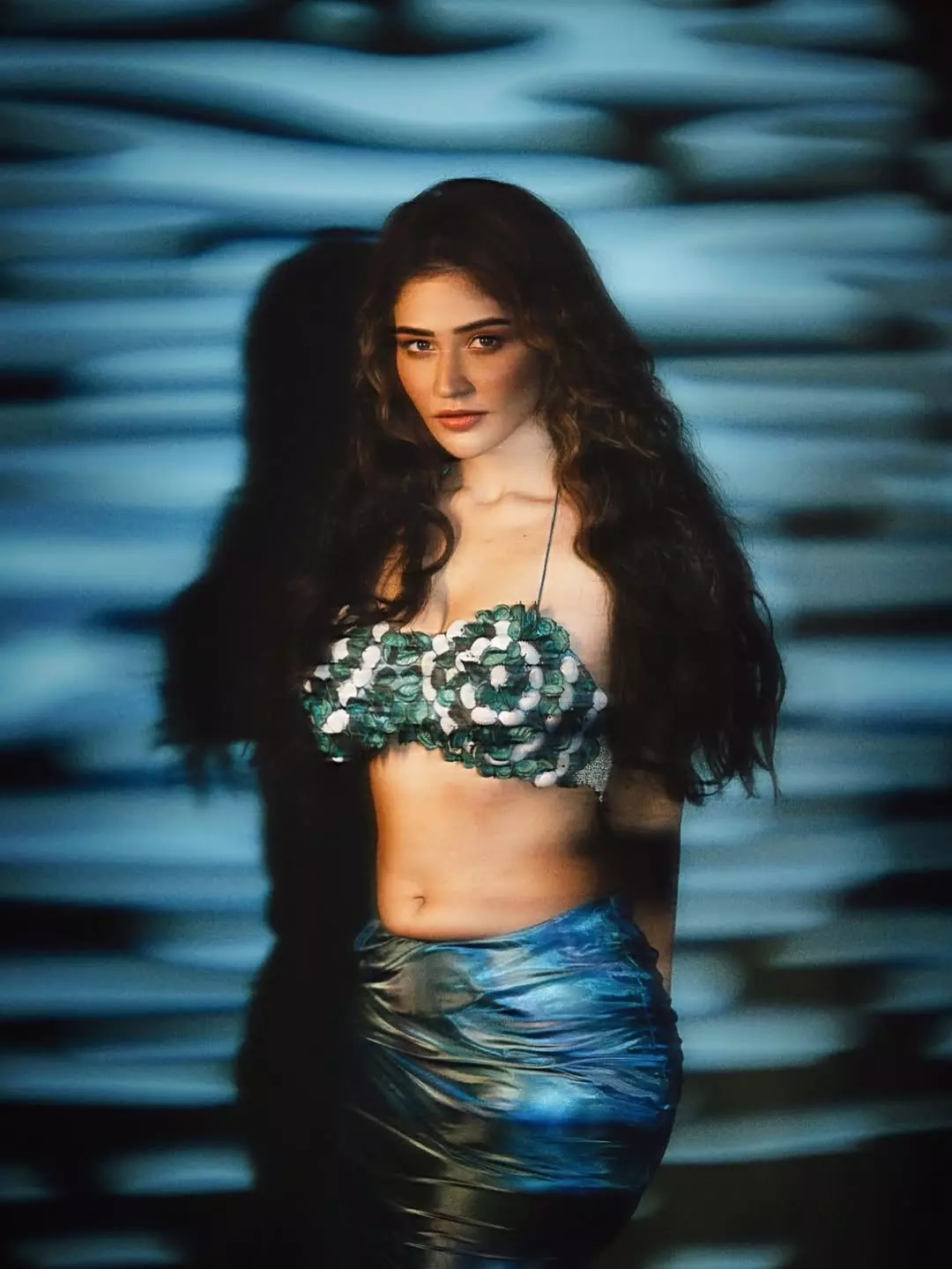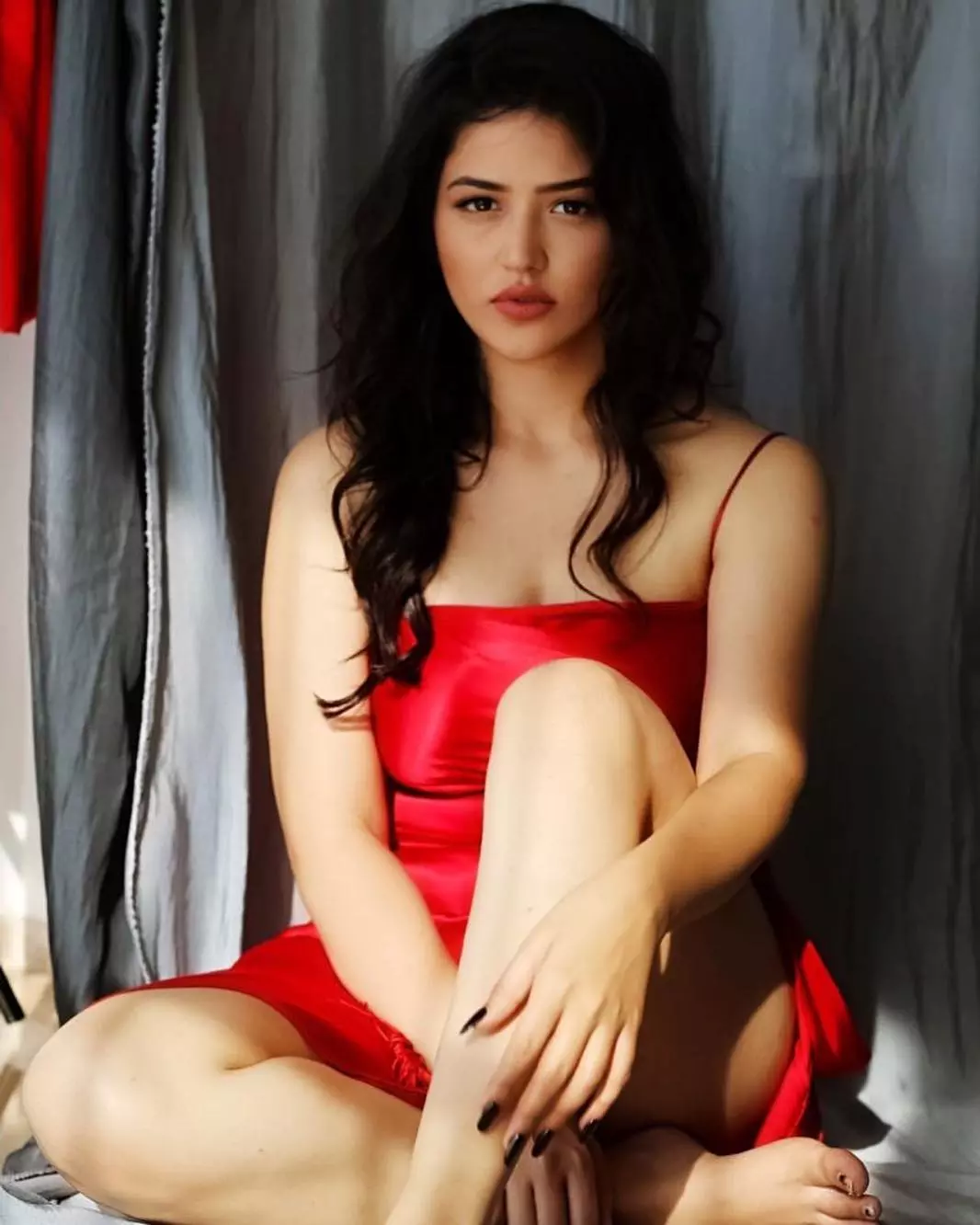 In this dazzling golden-hour portrait, Priyanka Jawalkar radiates sultry elegance and confidence. Seated barefoot on a reflective surface in a shimmering metallic brown outfit, she poses with one hand gracefully touching her face and the other resting on her leg, her long wavy hair glowing under warm light against a blurred urban backdrop.