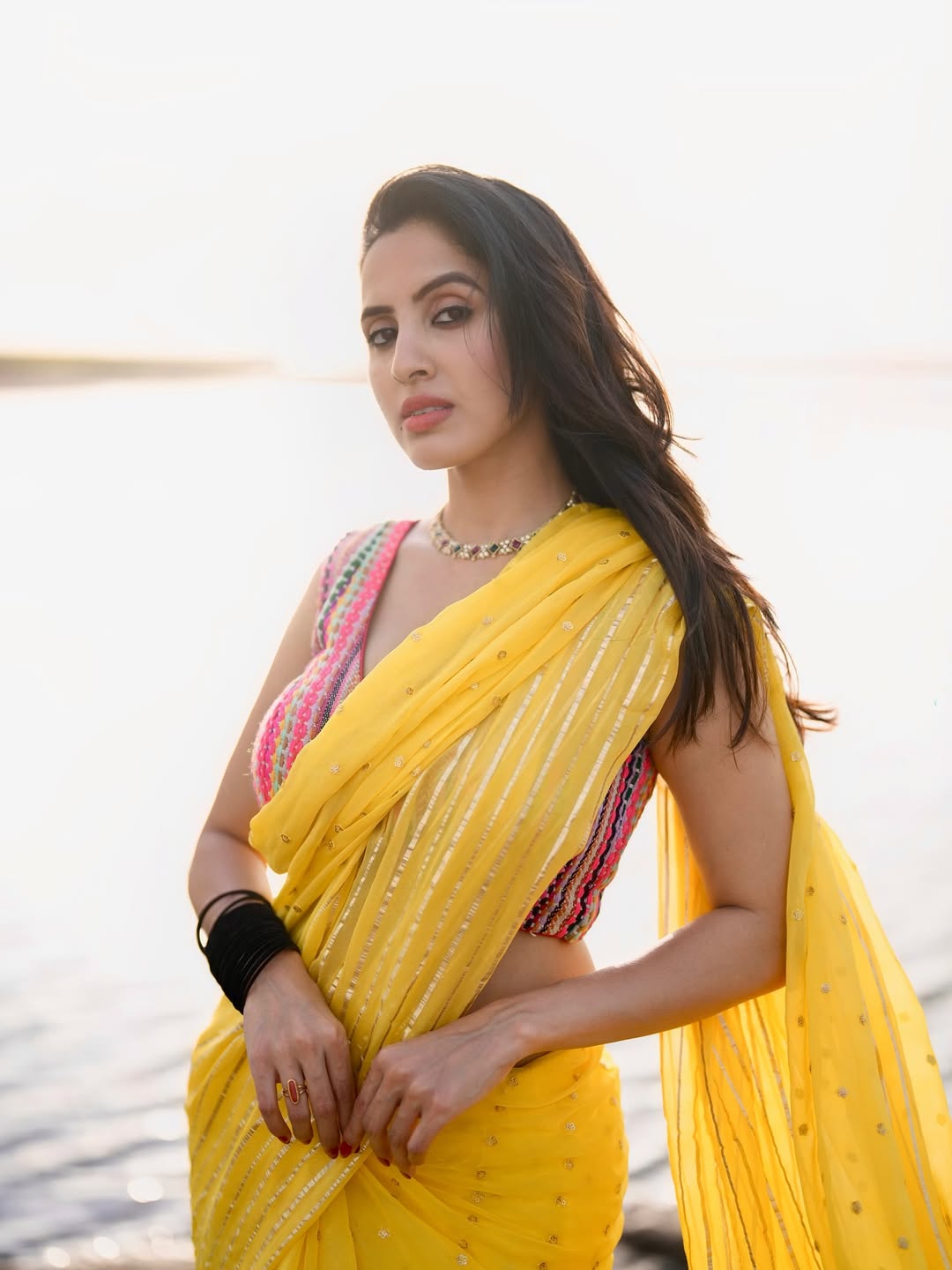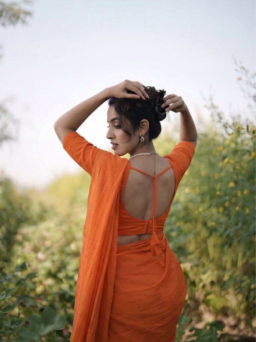 Actress Priyanka Kholgade looks radiant in a striking bright orange saree crafted from Mul Mul cotton, a fabric cherished for its exceptional softness, breathability, and lightweight comfort. Renowned for its airy texture, Mul Mul cotton is a timeless choice—perfect for warm climates and long hours of wear, offering effortless grace with ease.