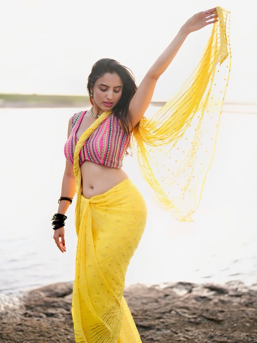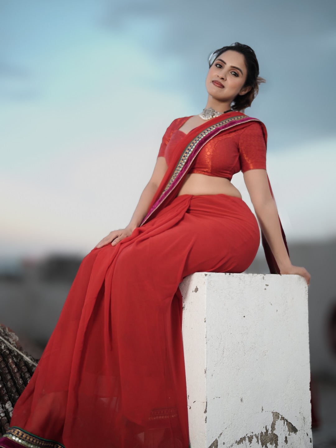 Bathed in the soft glow of twilight, Priyanka Kholgade transforms into a vision of timeless allure in a vibrant red saree that drapes her form like liquid fire
