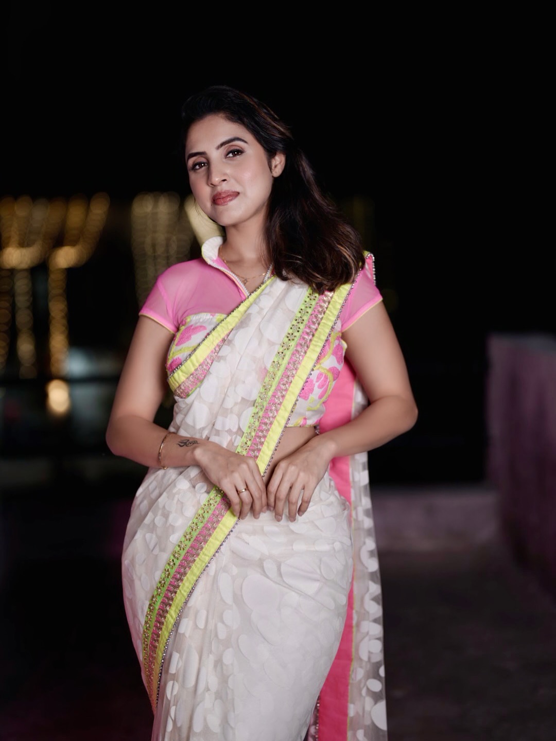 In the pictures, Priyanka carries the saree with effortless charm, highlighting the fluidity of the fabric and the subtle intricacies of the design. Minimal accessories and soft makeup complement the serene aesthetic, allowing her natural beauty and confident aura to shine through. The crisp white hue brings out a sense of purity and sophistication, making each frame a picture-perfect moment.