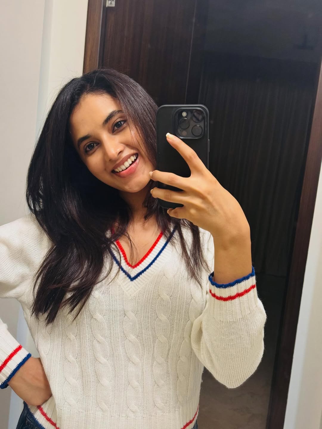 Priyanka Arul Mohan, the talented South Indian actress known for her captivating smile and versatile performances, continues to shine brightly. This candid selfie captures her effortless beauty—long wavy hair cascading over a stylish beige top, resting her cheek on her hand with a playful, thoughtful gaze from inside a car. Her natural glow and doe-eyed innocence remind us why she's a fan favorite.
