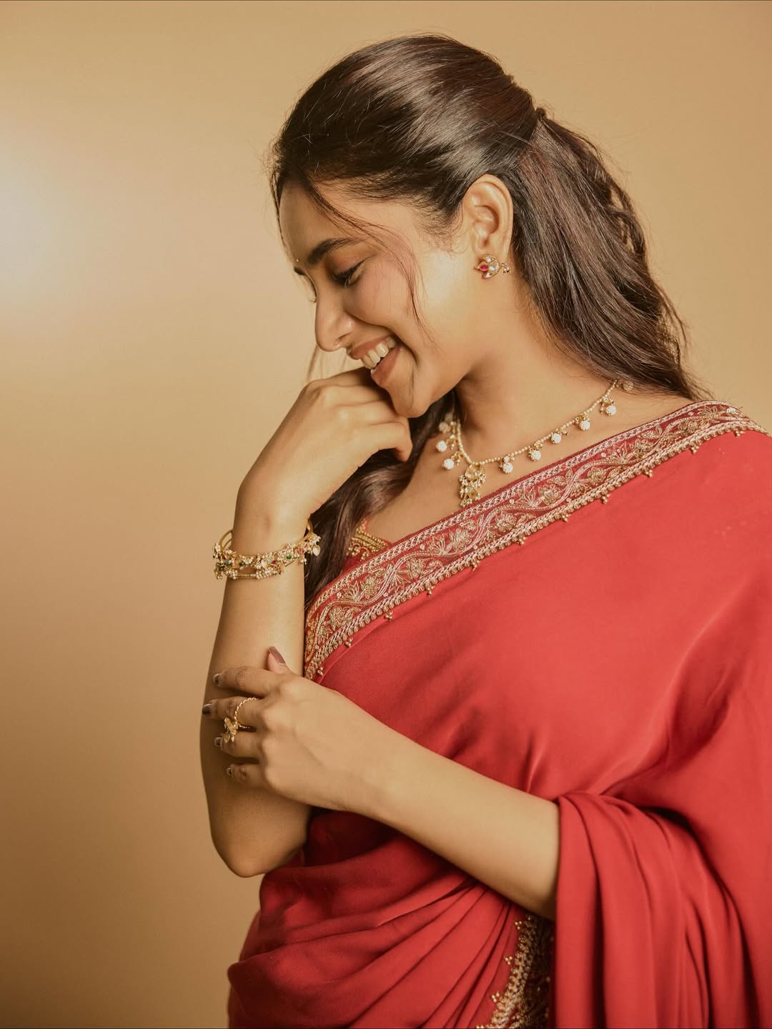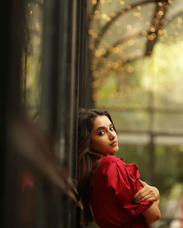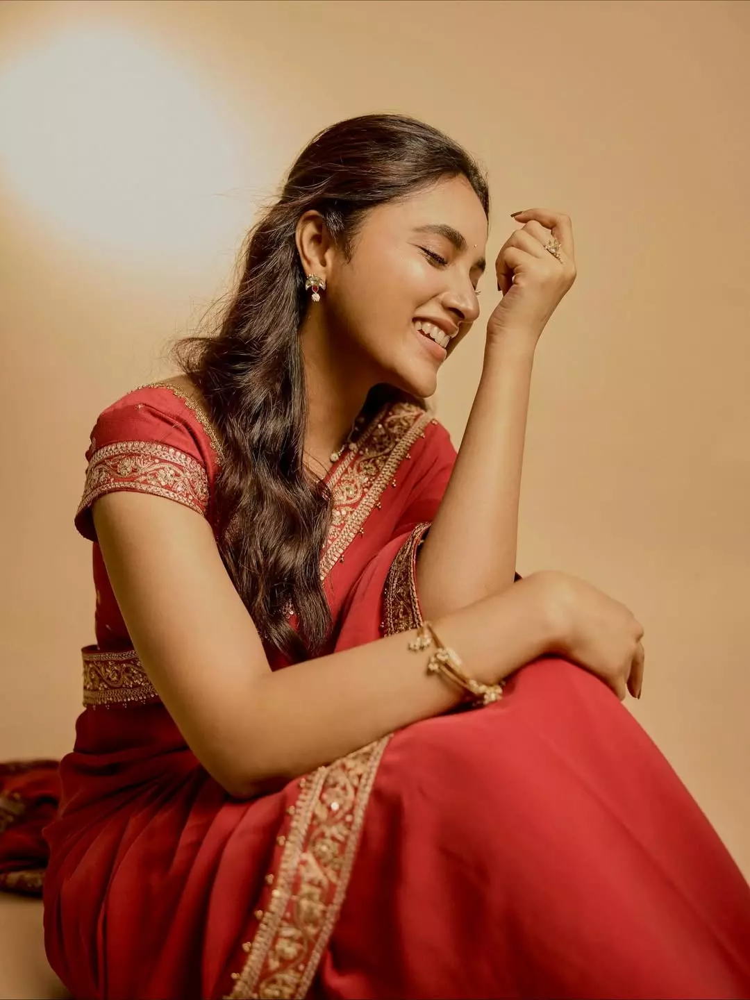 Actress Priyanka Mohan shared a new photo on Friday looking adorable and she captioned it as “On Fridays, we wear gold.” The picture shows Priyanka sitting on a soft brown sofa with a relaxed smile. She wore a golden dress. Her simple gold earrings and rings matched the dress beautifully.