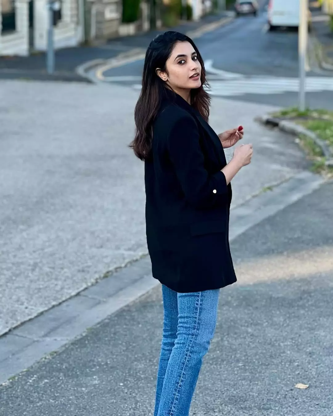 In this stunning portrait, Priyanka Mohan radiates elegance and grace. Dressed in a beautifully embellished blouse paired with a black saree, her poised expression and confident charm make the frame captivating.
