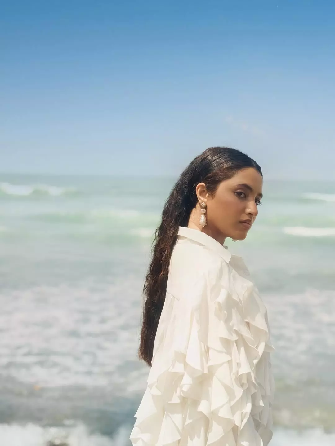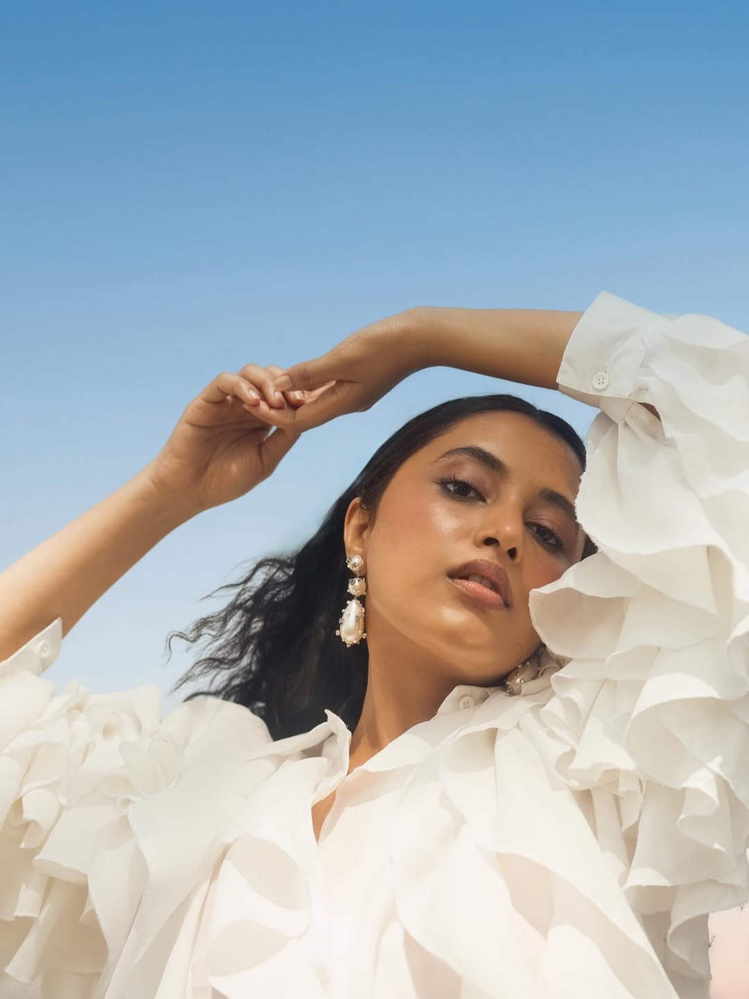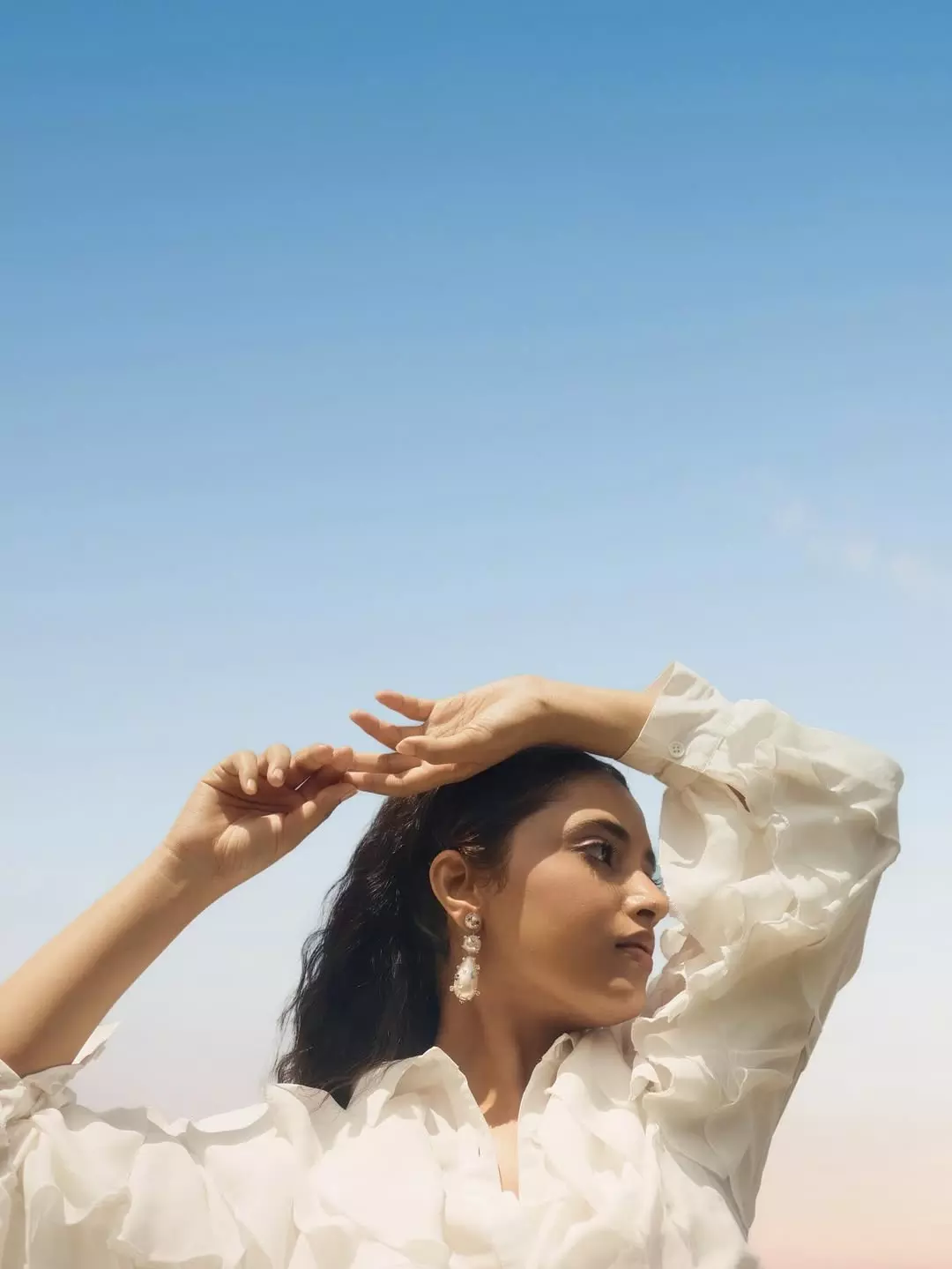Priyanka Mohan in recent photos shared by her looks just awesome. She looks ethereal dressed in a white ruffled dress with arms raised gently above her head, under a clear blue sky. The caption simply reads “The in-between 🌊☁️.”