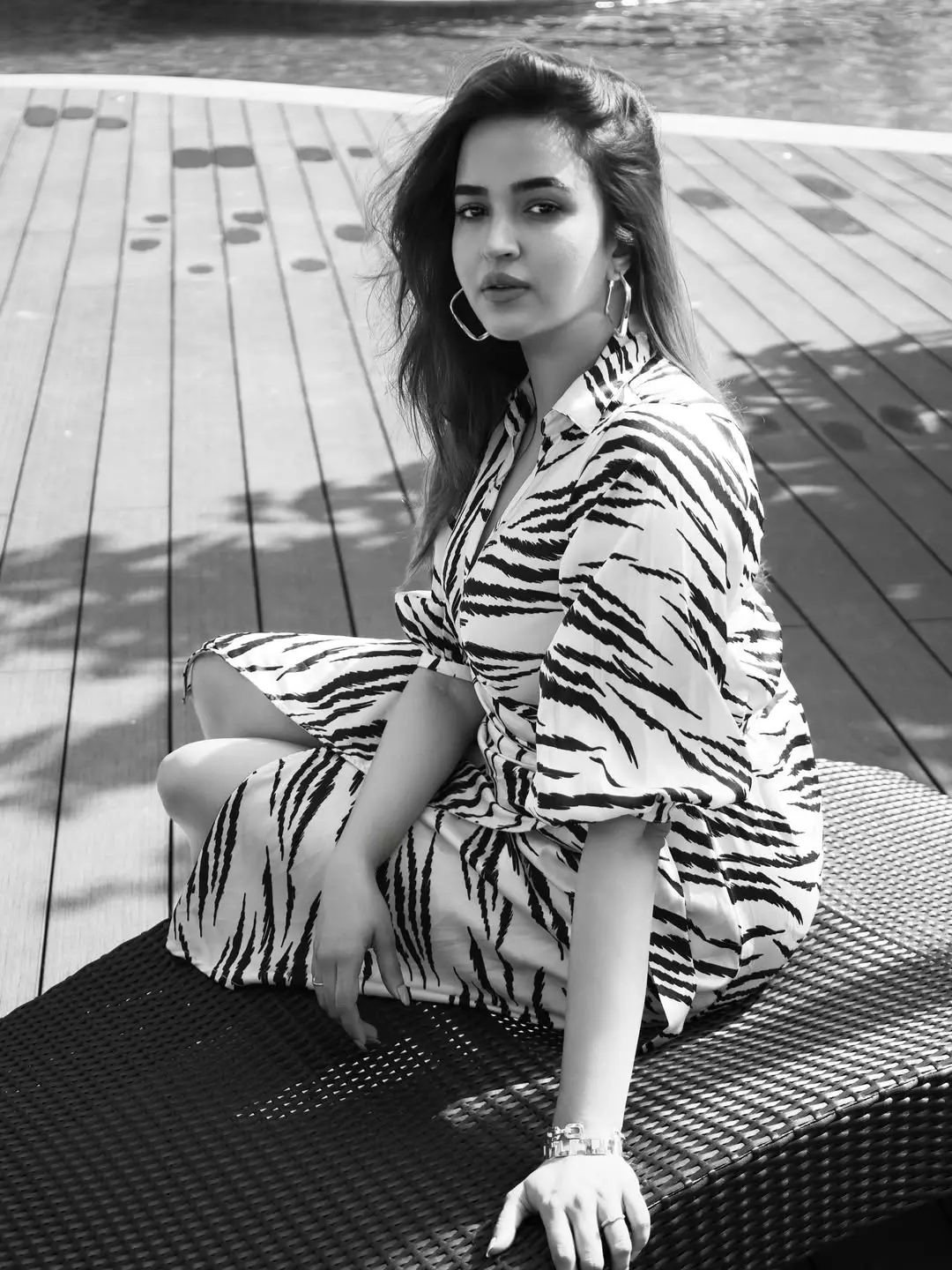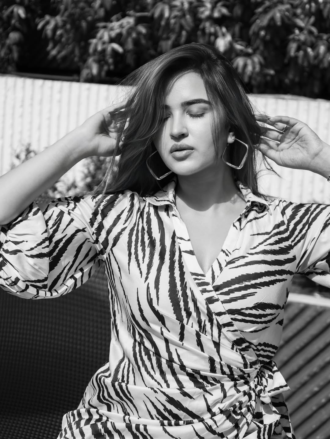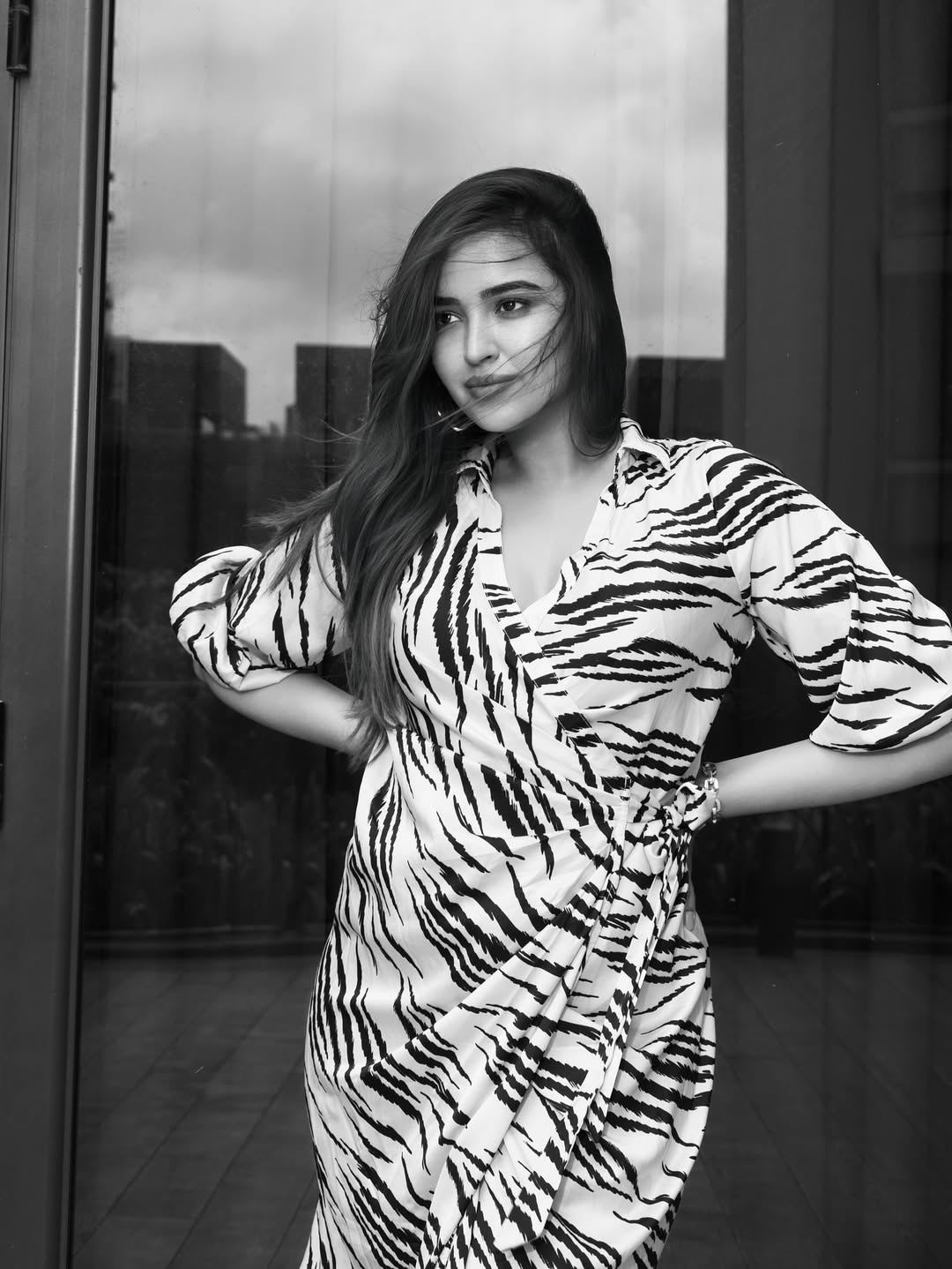 By: Tupaki Desk | 26 Dec 2025 10:27 PM ISTPujita Ponnada channels timeless 90s fashion in this stunning black-and-white photoshoot, captured against a modern urban skyline visible through glass doors. She poses confidently in a bold zebra-print wrap dress with flowing sleeves and a cinched waist, her long hair tousled by the wind, exuding effortless style and poise.