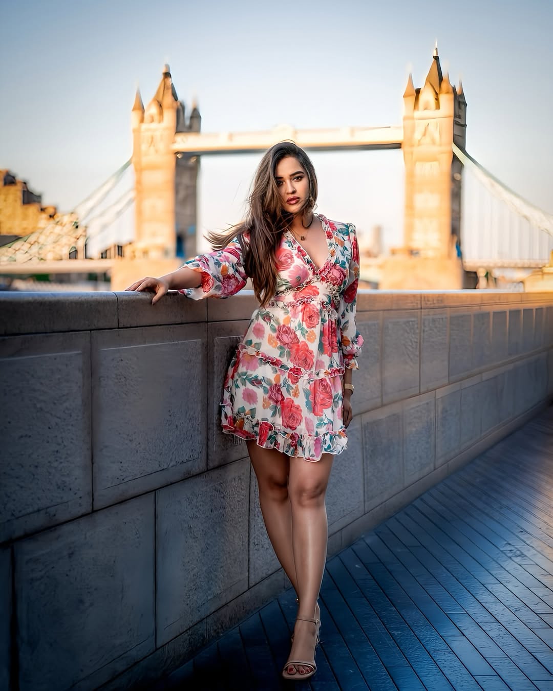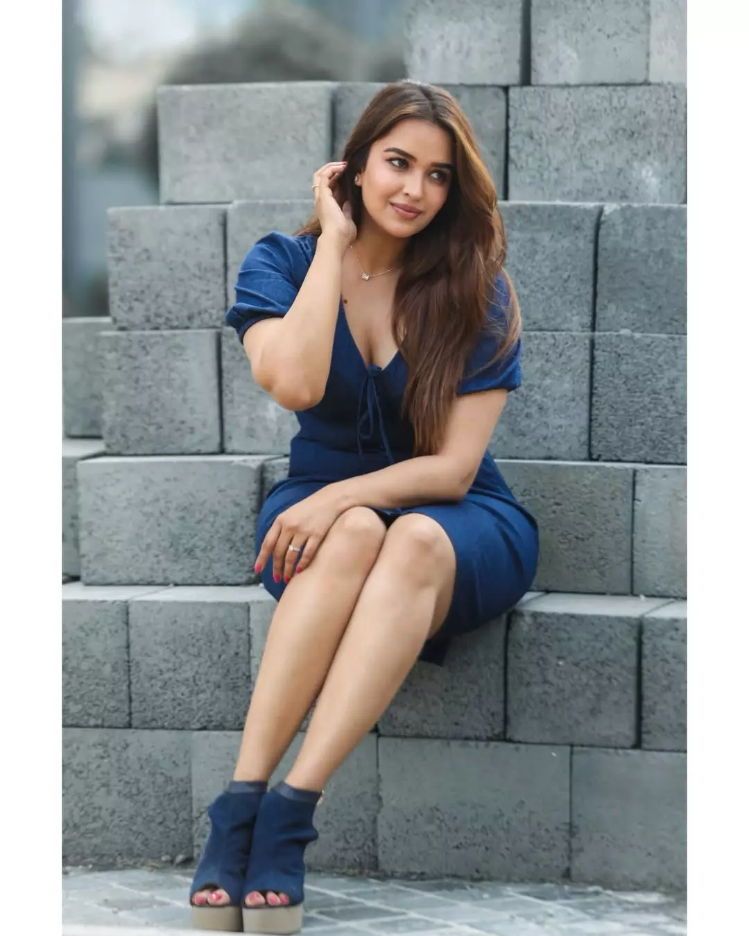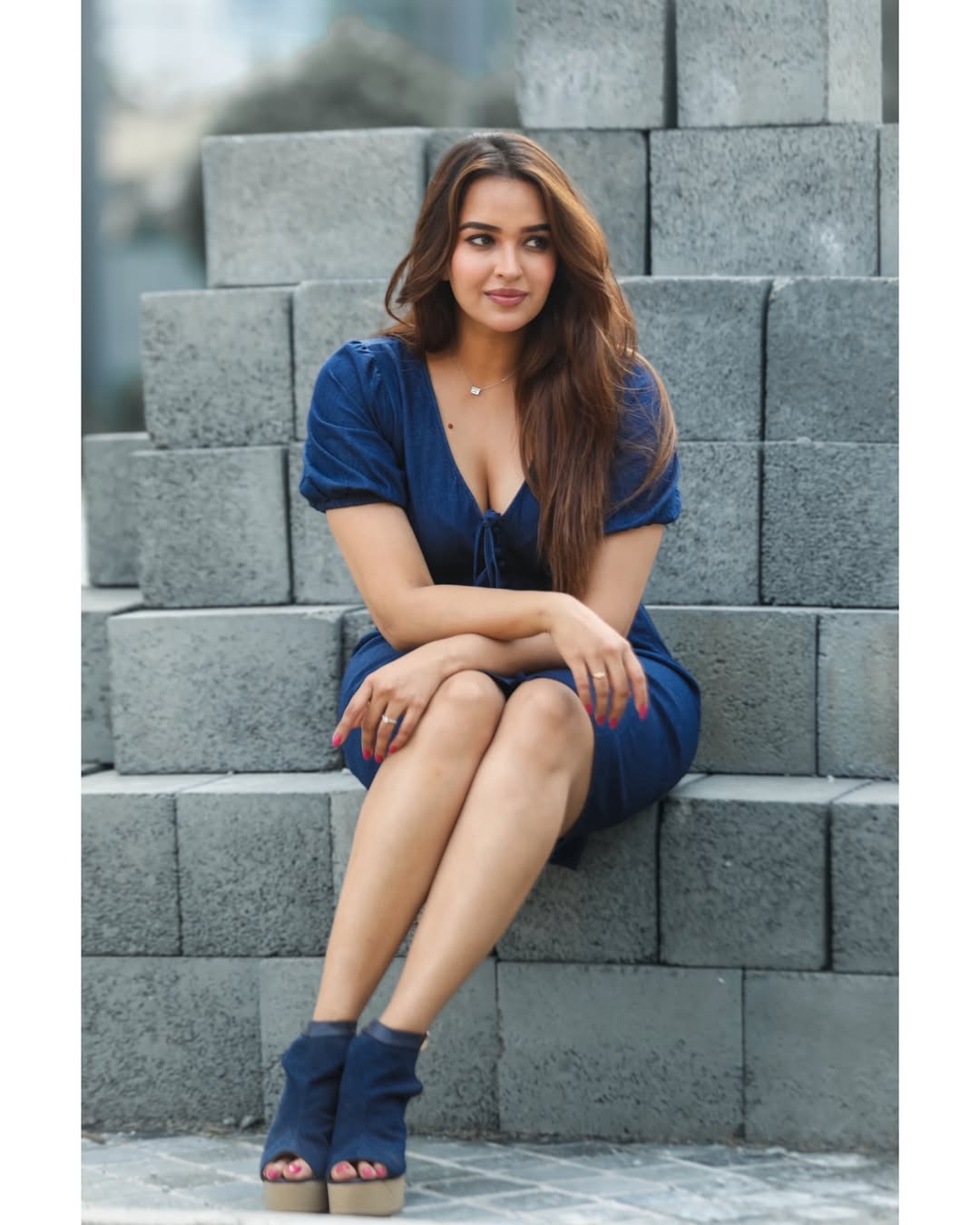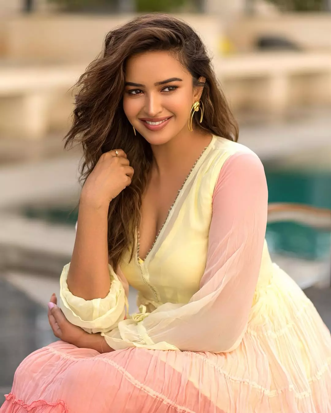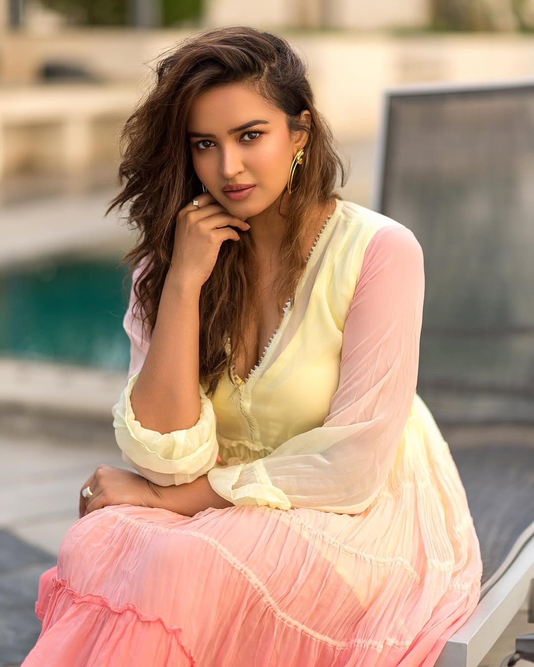Leaning against a rock in a vibrant mustard-yellow and rust-orange draped outfit, her wavy hair flowing naturally, she exudes effortless charm and girl-next-door warmth with a touch of traditional grace.