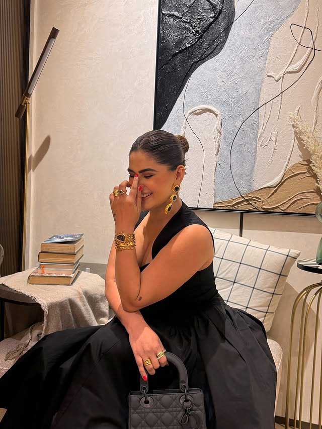 With gold statement jewelry, a sleek updo, and that powerful black outfit, Karishma truly turned the moment into a fashion statement. And the Lady Dior bag? Total style goals! Have you ever wanted a bag that makes you feel that special?