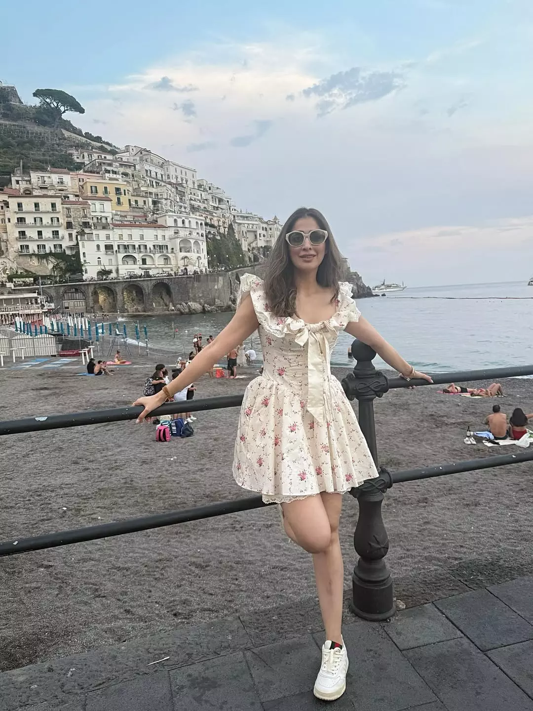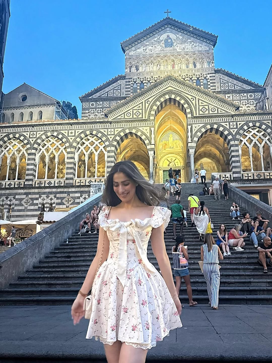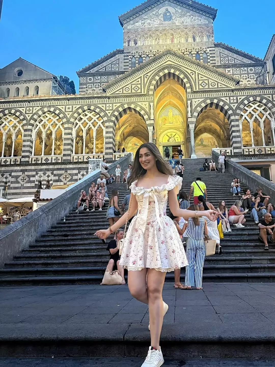 She wore a charming floral dress and posed with a smile. Behind her stood the grand Amalfi Cathedral by adding a magical touch to the photo.