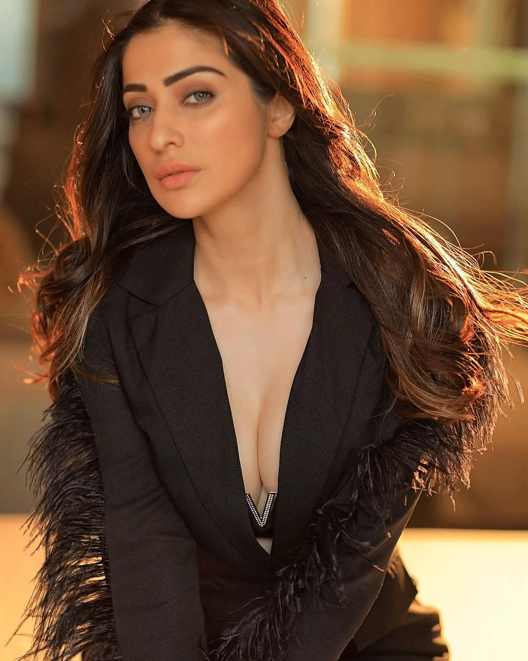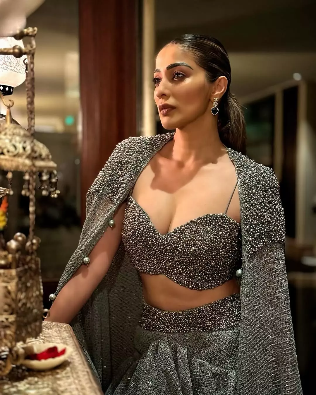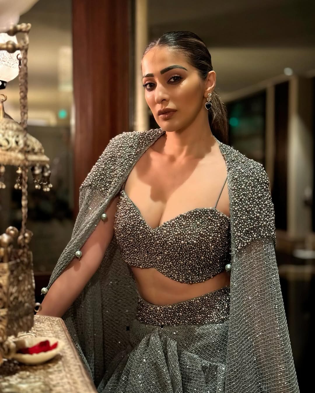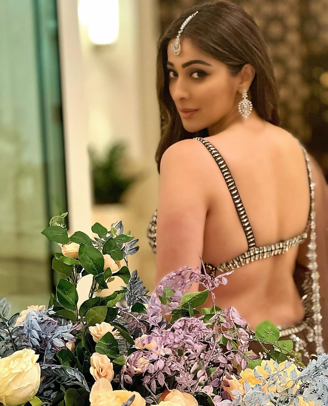 This glamorous photograph of Raai Laxmi captures her in a stunning backless designer outfit adorned with intricate silver embellishments. With a graceful over-the-shoulder gaze, diamond maang tikka, and statement earrings, she exudes timeless elegance and sensuality, beautifully framed by a lush floral arrangement.