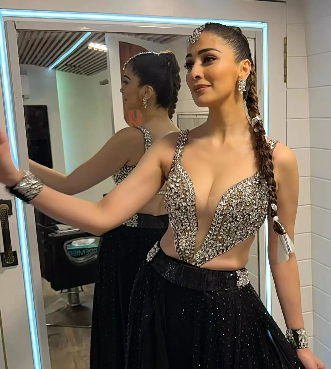 This glamorous photograph of Raai Laxmi captures her in a stunning backless designer outfit adorned with intricate silver embellishments.