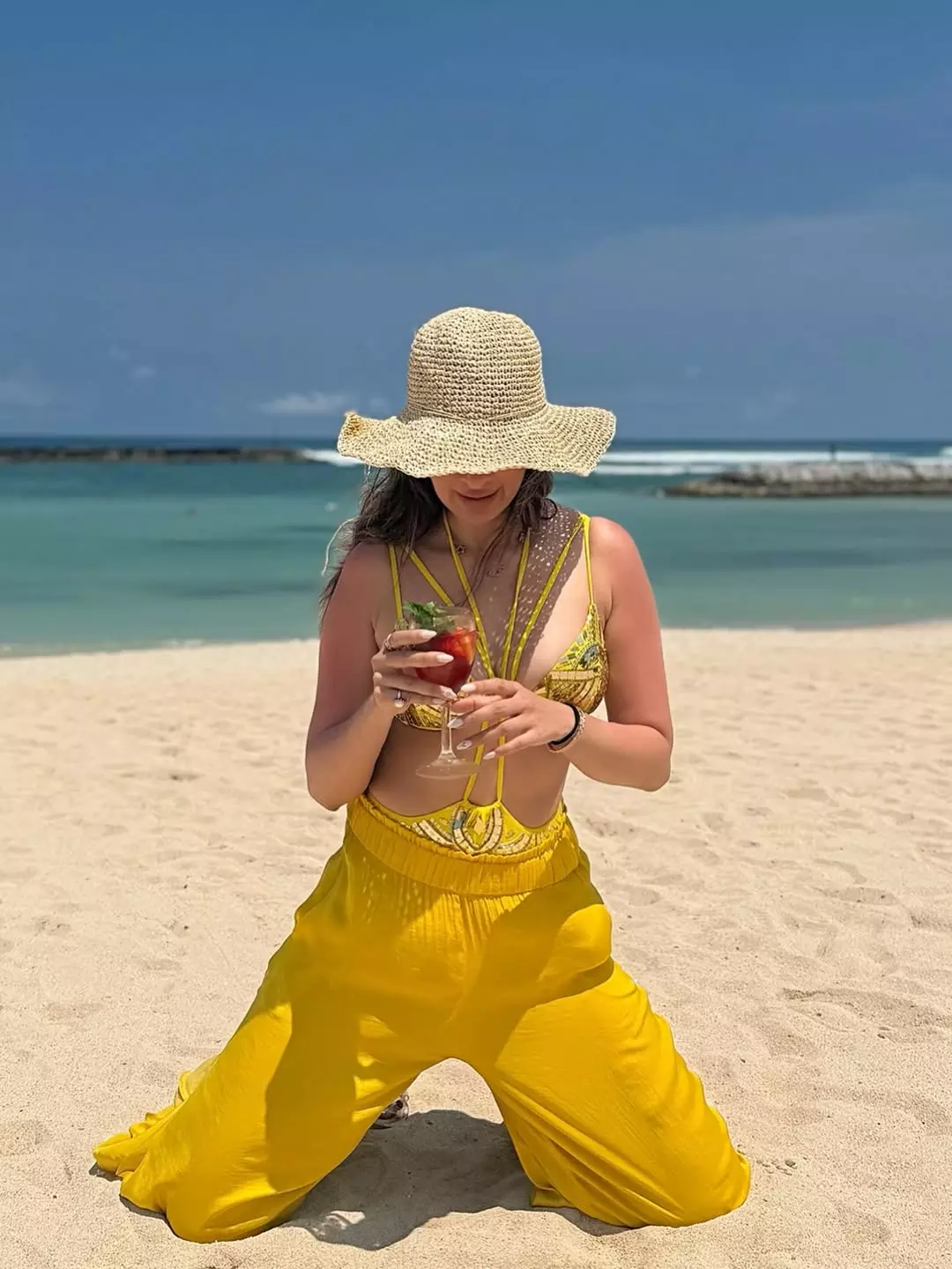 Dressed in a striking yellow sequined bikini paired with a wide-brimmed straw hat and mirrored sunglasses, the actress radiated pure summer energy.