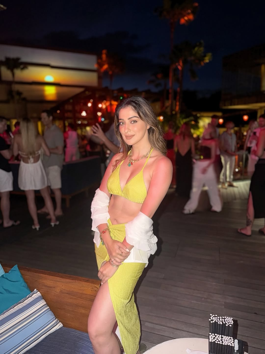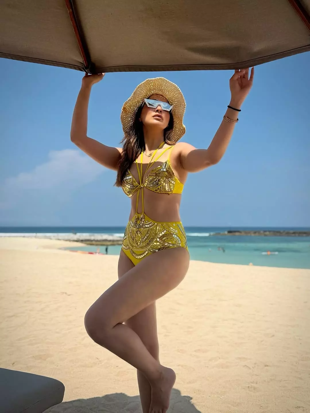 Raai Laxmi, popularly known as Lakshmi Raai, turned heads with her radiant beach photos from Bali, Indonesia. Dressed in a striking yellow sequined bikini paired with a wide-brimmed straw hat and mirrored sunglasses, the actress radiated pure summer energy.
