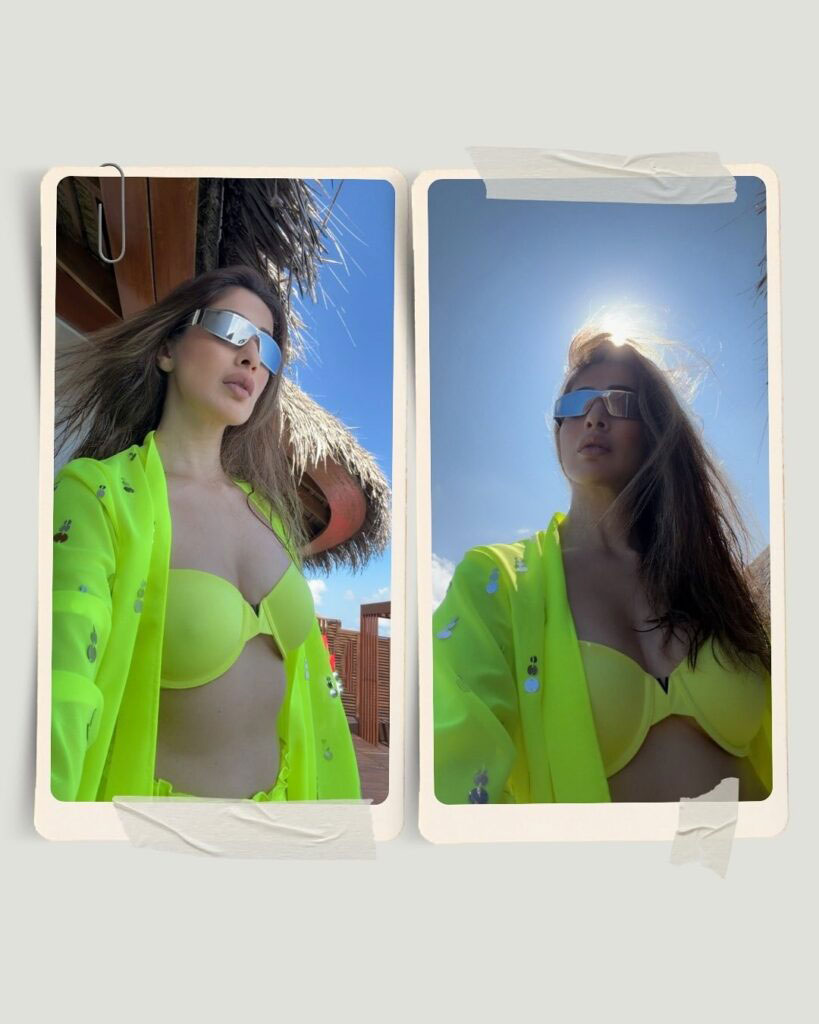 She’s seen walking by the beach in a bright neon yellow outfit that almost glows against the sky and sea. The sheer jacket tied at the waist, paired with a matching bikini, gave her that fun holiday energy, not overdone, just right. Add those spacey shades and a chill straw hat, and she’s got that “don’t care, just here to tan” mood going perfectly.