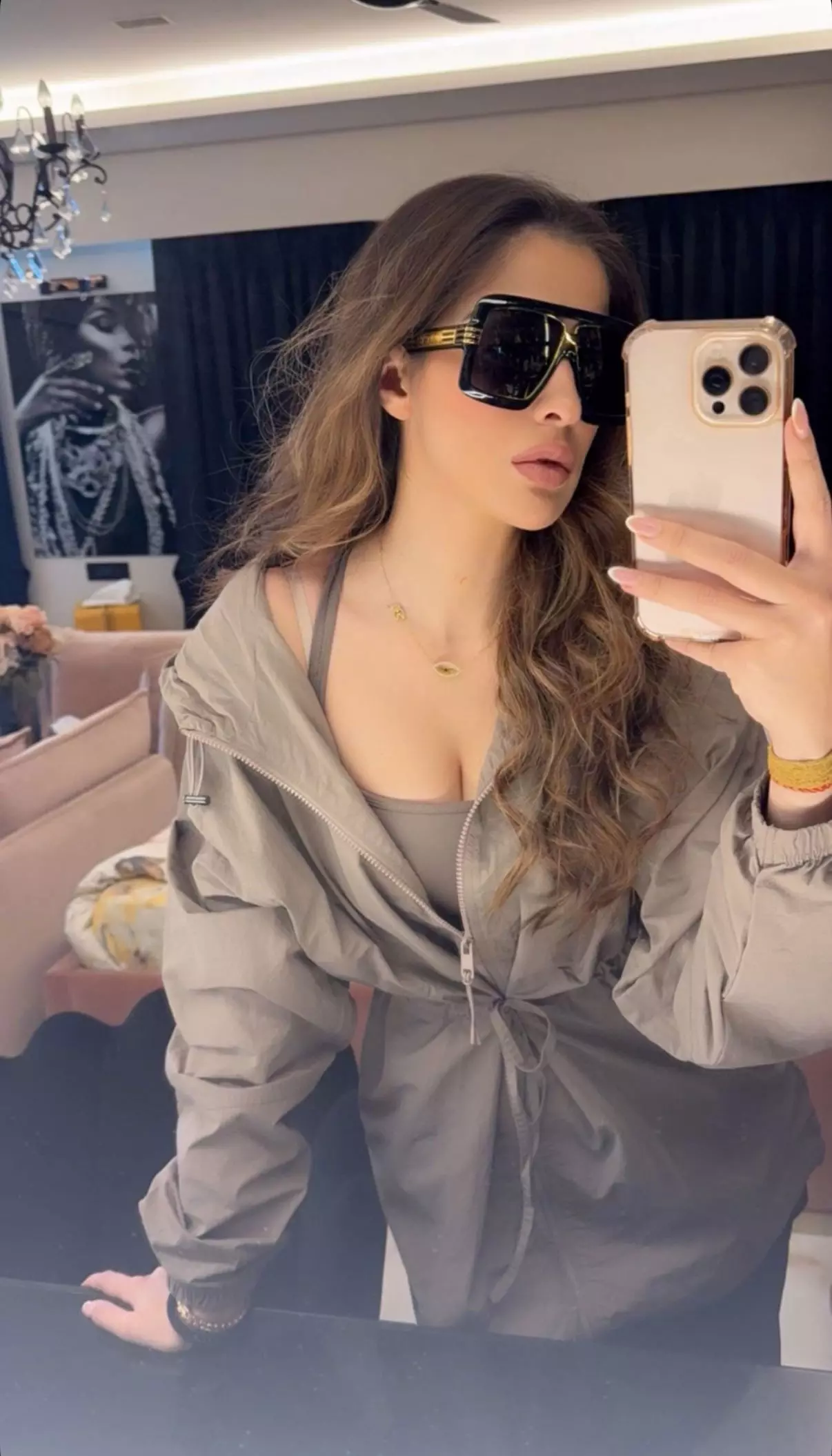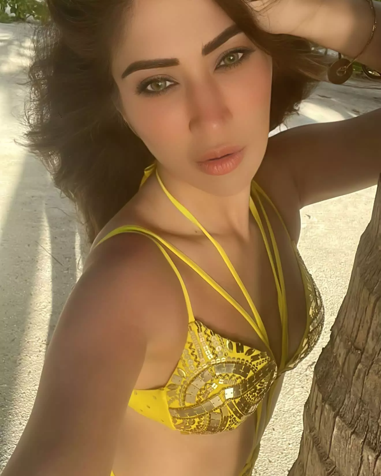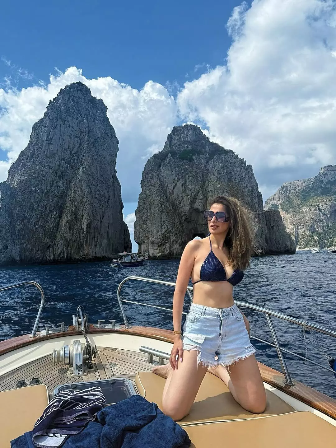 Raai Laxmi scorches the Santorini sun in a black crochet bikini that weaves desire into every floral cut-out, the halter top barely containing her curves while high-cut bottoms sculpt endless legs.