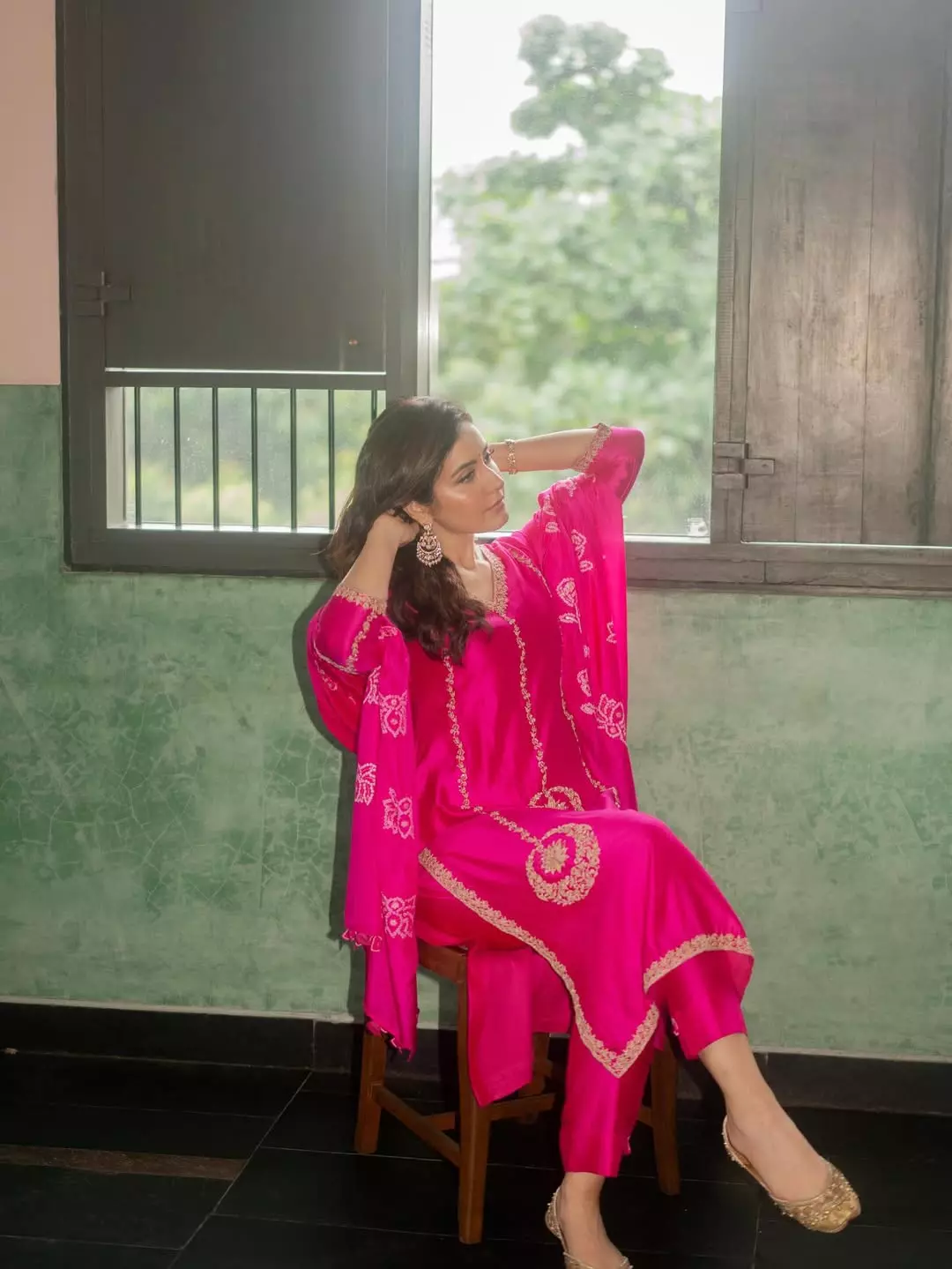 By: Tupaki Gallery Desk | 30 Sept 2025 7:30 PM ISTStunning beauty Raashi Khanna, who is busy with a bunch of movies in hand from south to north, stepped out in full festive spirit during the promotions of her upcoming film Telusu Kada. She chose a dark pink kurta with golden embroidery, paired with matching pants. The rich color and subtle shine instantly gave a festive mood. A simple choice, yet it carried a regal charm on her.