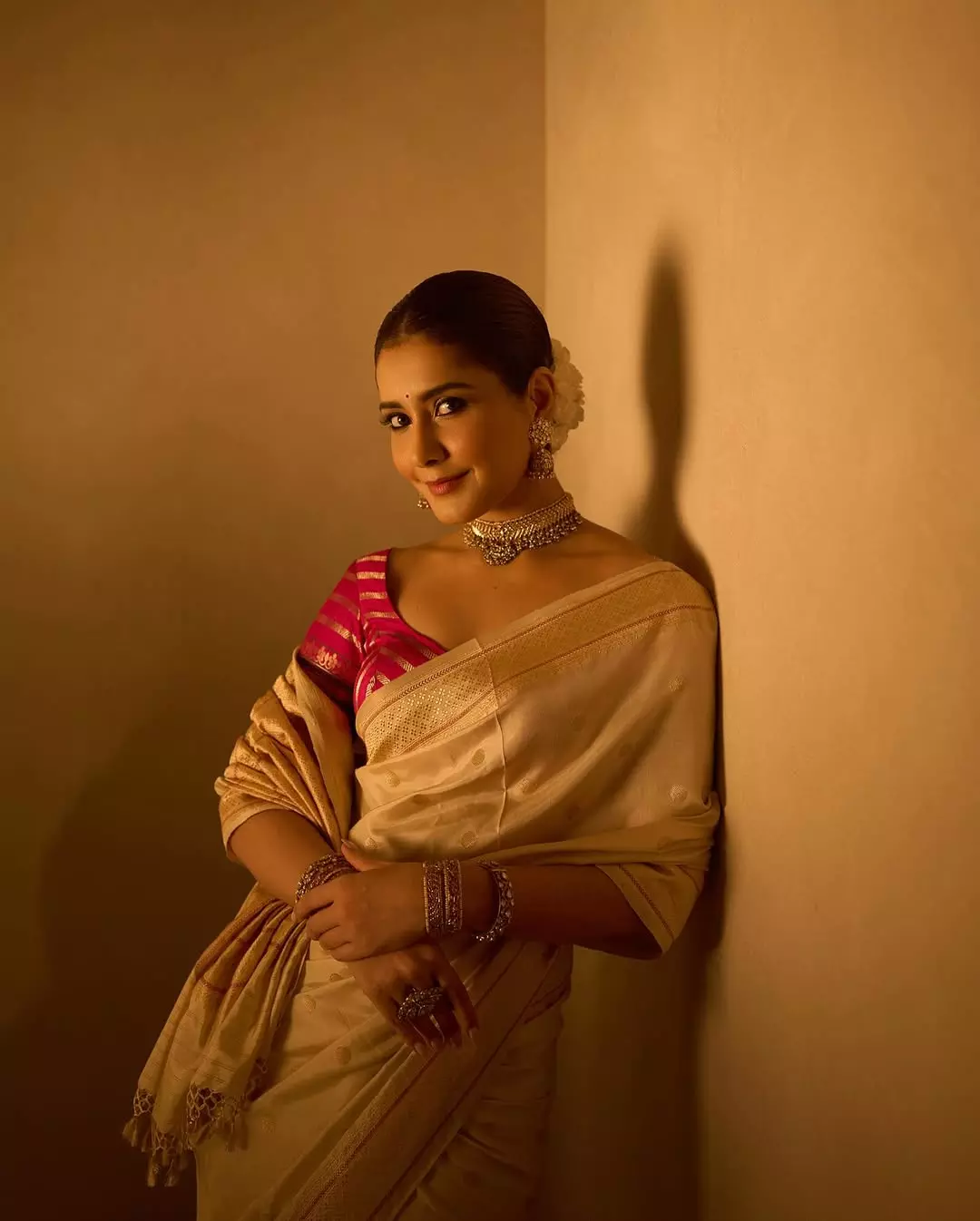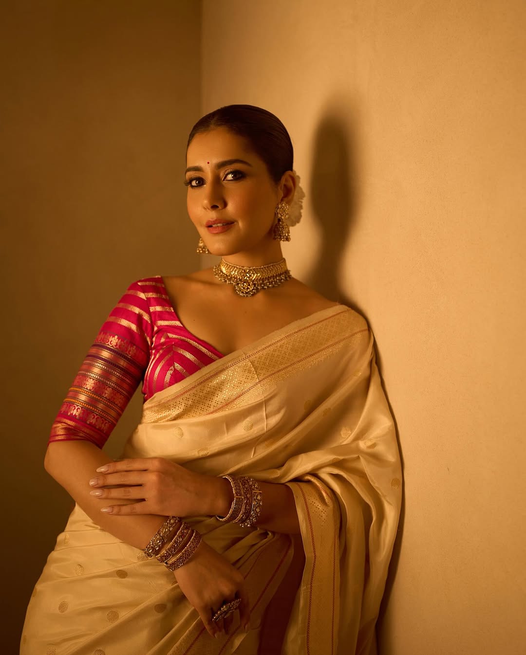 Stunning beauty Raashi Khanna, who is busy with a bunch of movies in hand from south to north, stepped out in full festive spirit during the promotions of her upcoming film Telusu Kada.