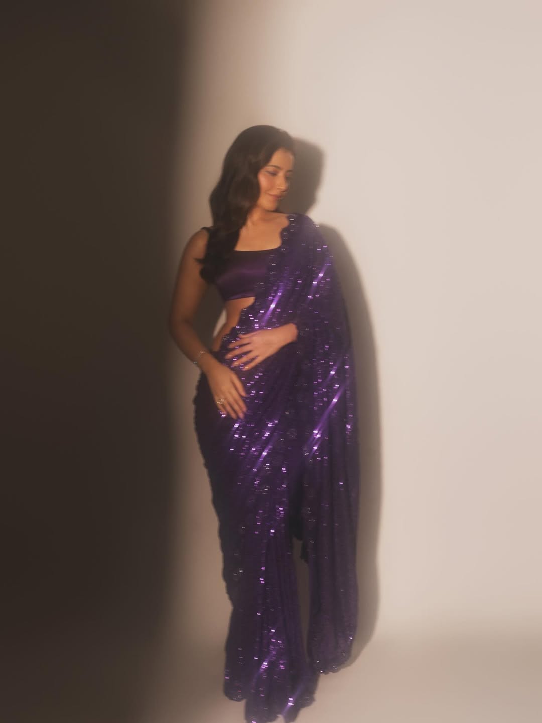 In the picture, she is seen wearing a dazzling purple saree paired with a matching blouse.