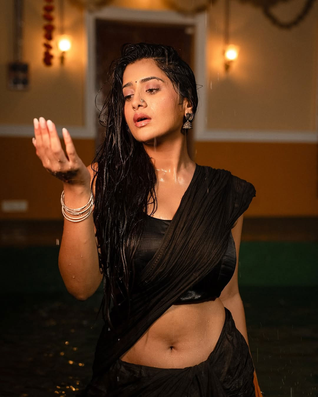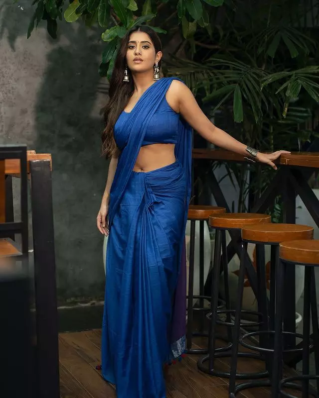 Wearing an adorable dark blue saree from @vipnari\_, Raashi looks graceful and elegant. Her caption reads, “Give me a caption? 💜.”
