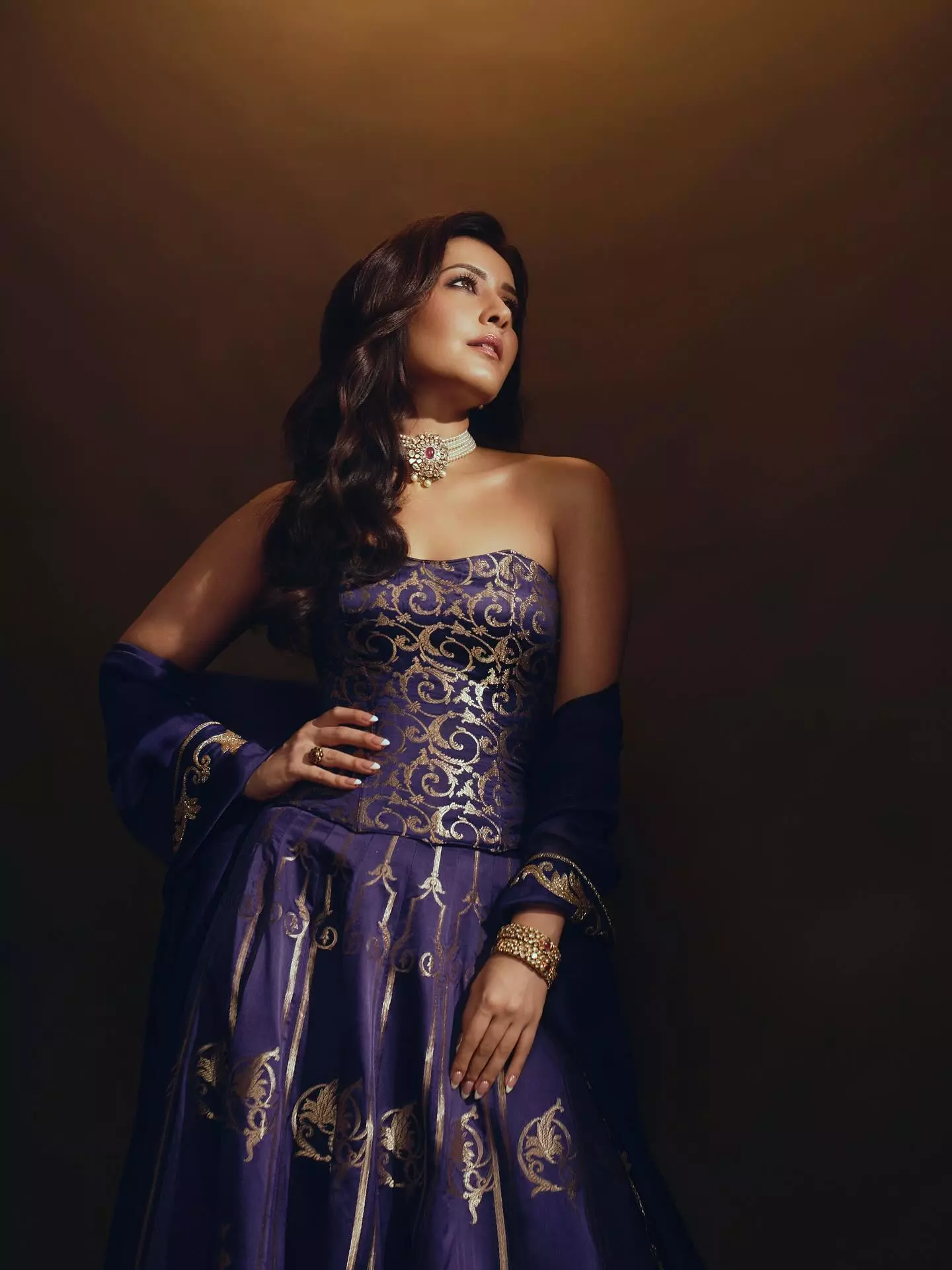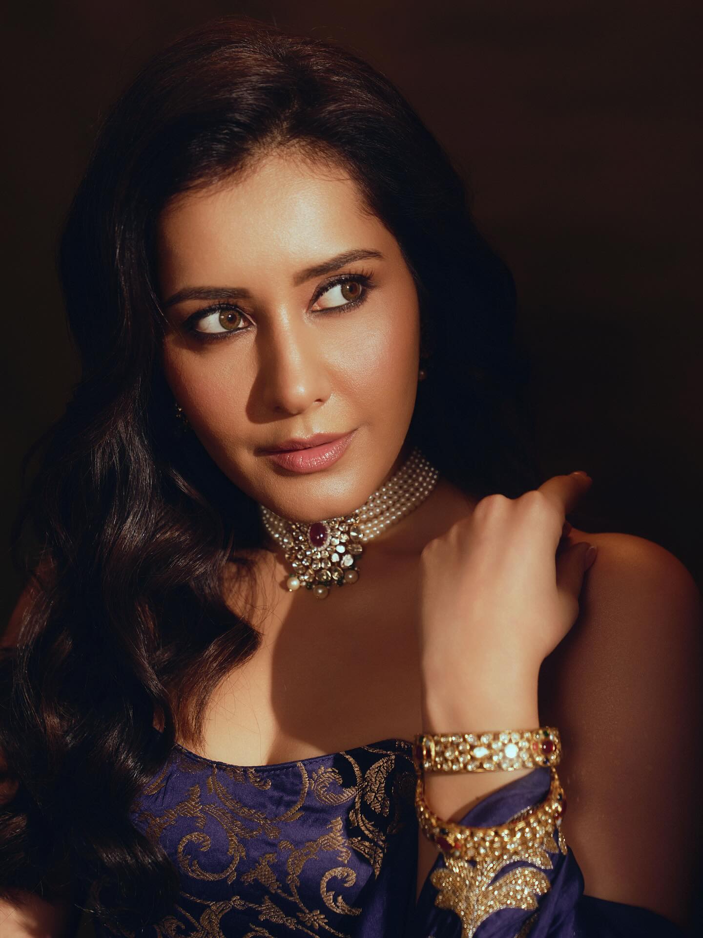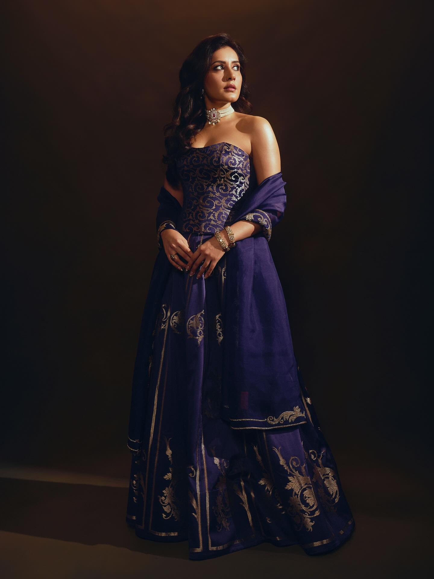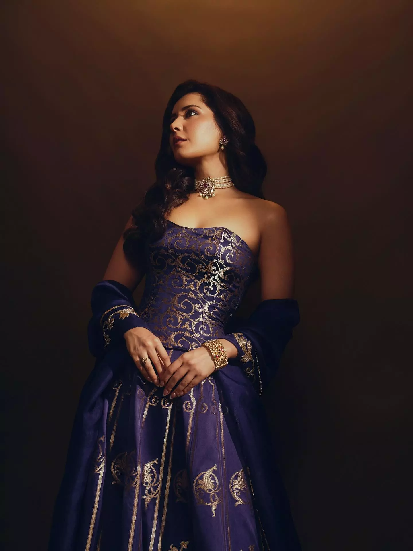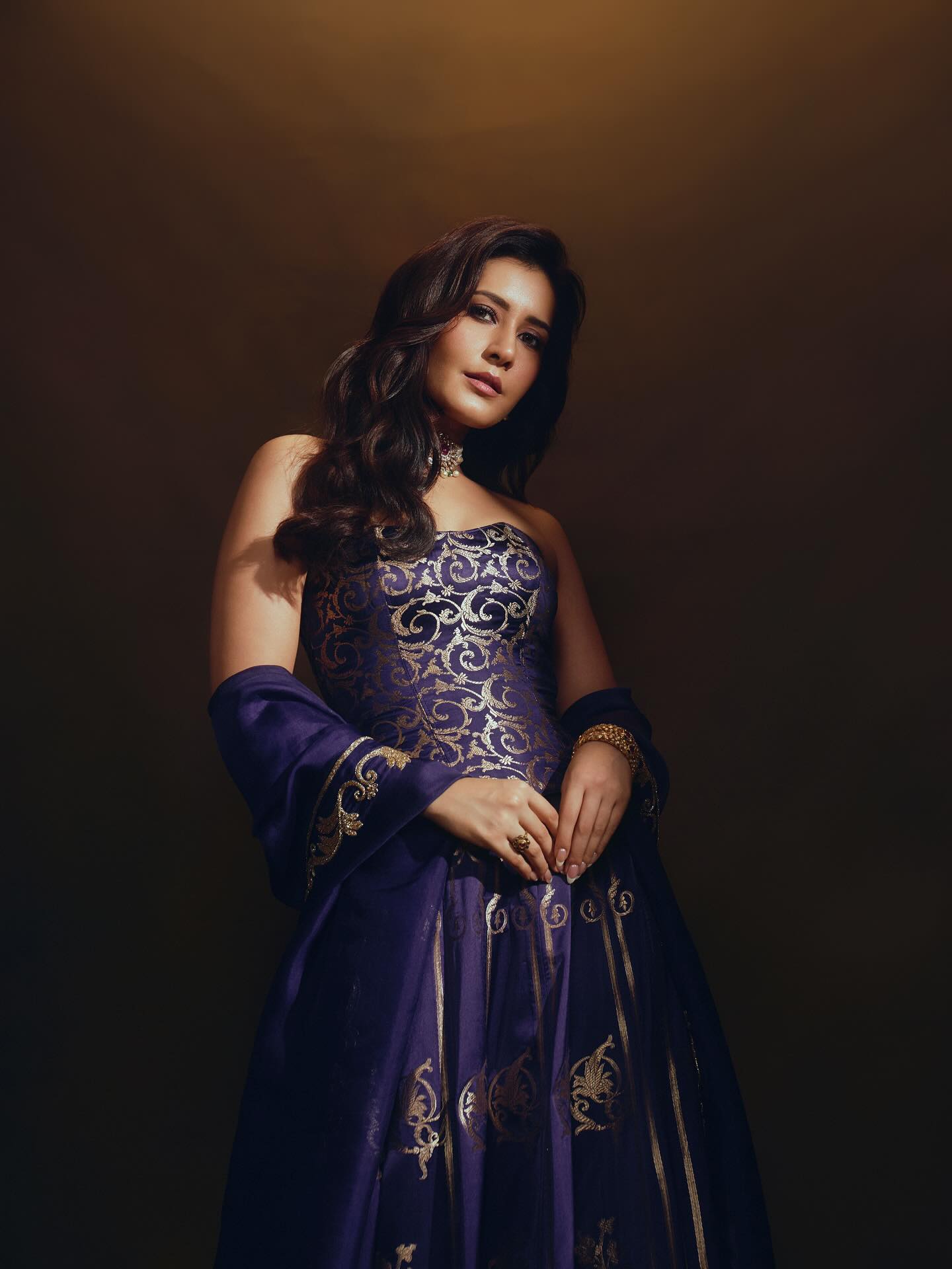 In the picture, Raashii is seen wearing a gorgeous royal purple dress that exudes grace and sophistication. The dress styled by Jukalker features golden embroidery that adds a rich and traditional touch to her appearance.