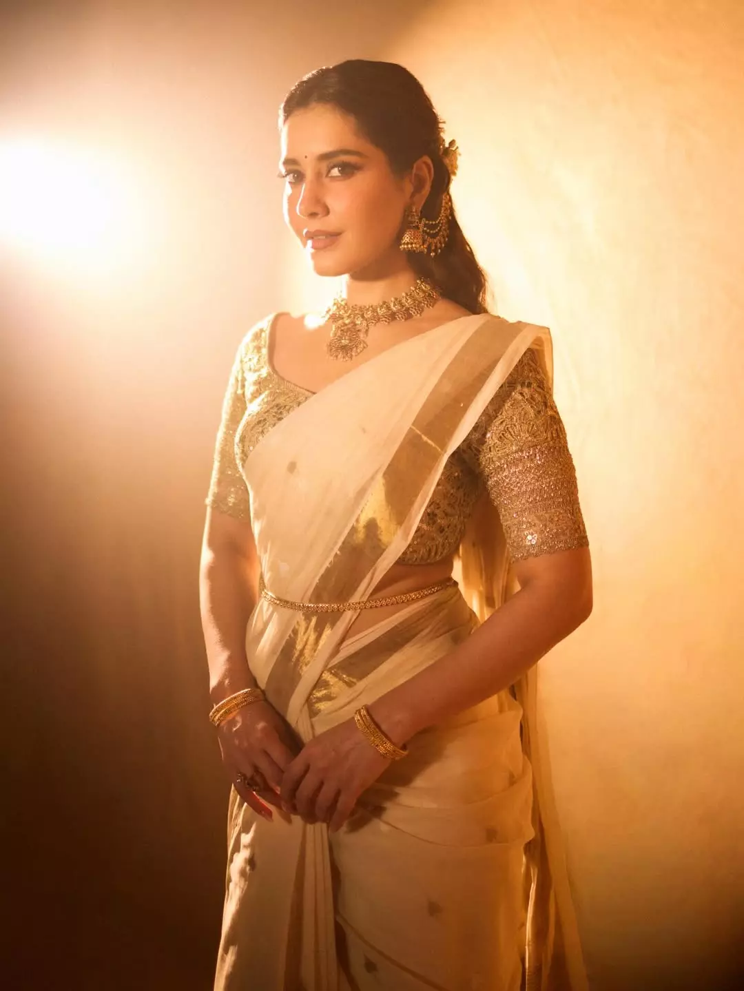 Raashii Khanna once again proves why she is celebrated for her effortless elegance and versatile screen presence. In this stunning portrait, the actress dazzles in a beautifully crafted ivory-and-gold saree that perfectly complements her radiant aura. The intricate embroidery on her blouse, paired with the soft, sheer drape, creates a look that is both regal and graceful. Her poised expression, subtle smile, and expressive eyes add depth to the frame, while the warm golden lighting enhances the richness of the ensemble. Statement gold jewellery completes the look, giving her an ethereal, almost royal charm.