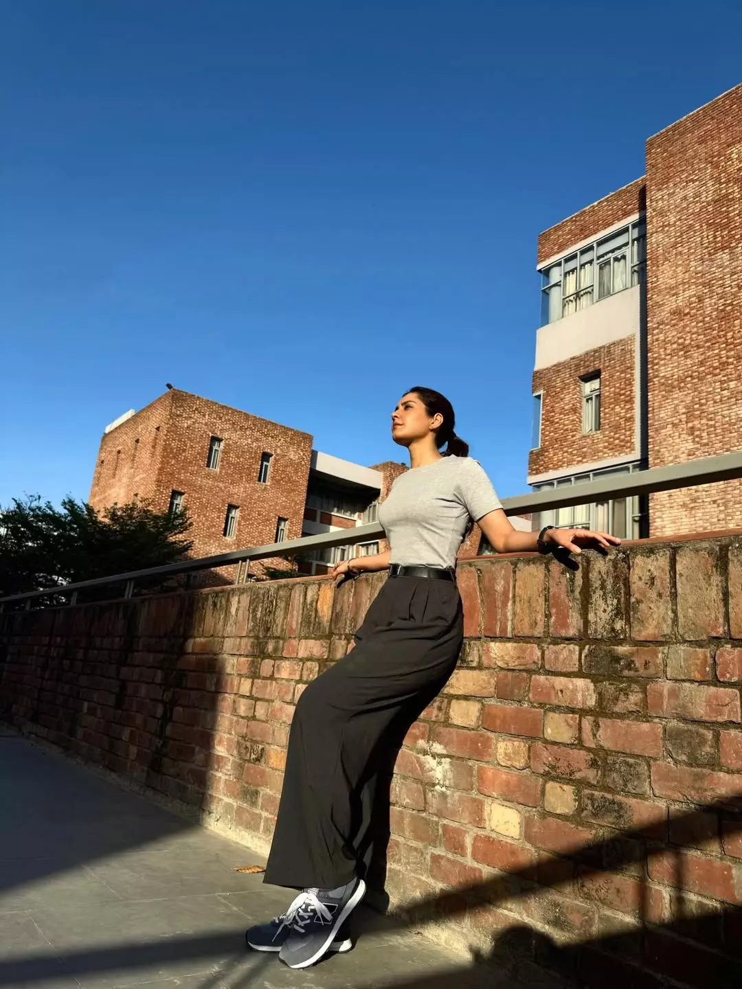 Raashii Khanna stuns in a poised outdoor portrait against a clear blue sky and urban backdrop, her confident side profile and sharp gaze reflecting quiet strength. The image pairs beautifully with her introspective note about complex characters — hinting at a deeply layered role coming soon.
