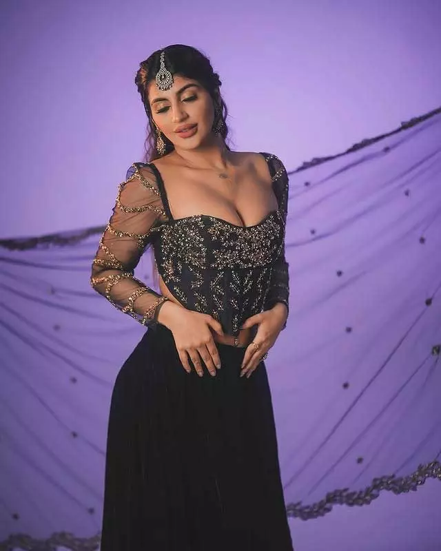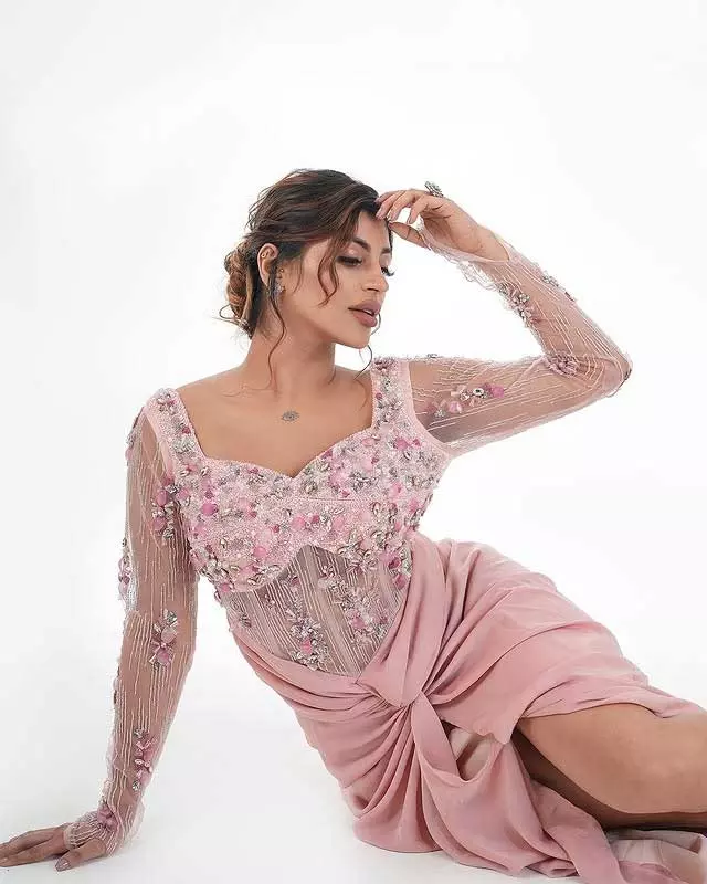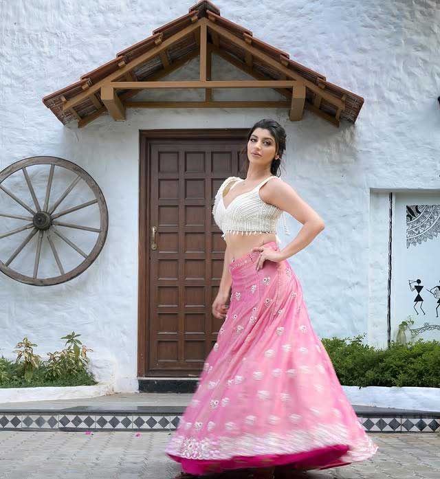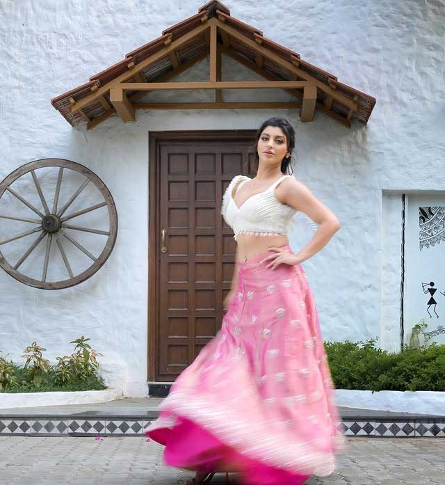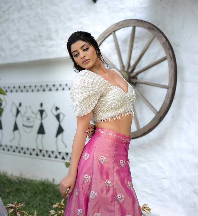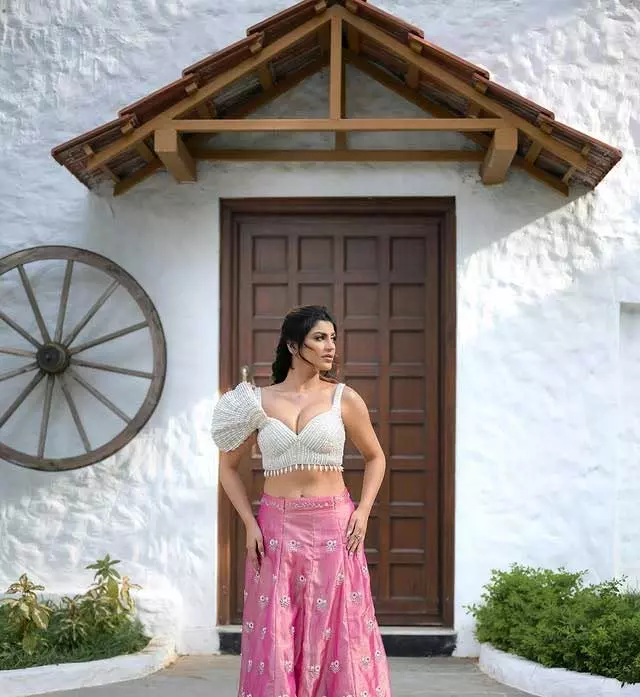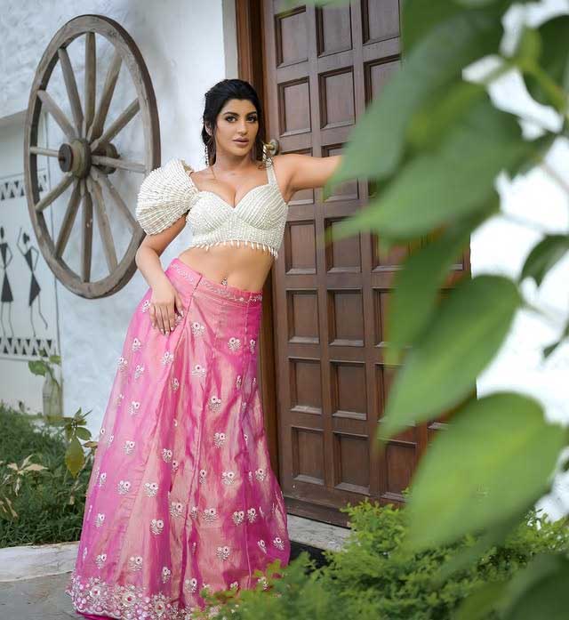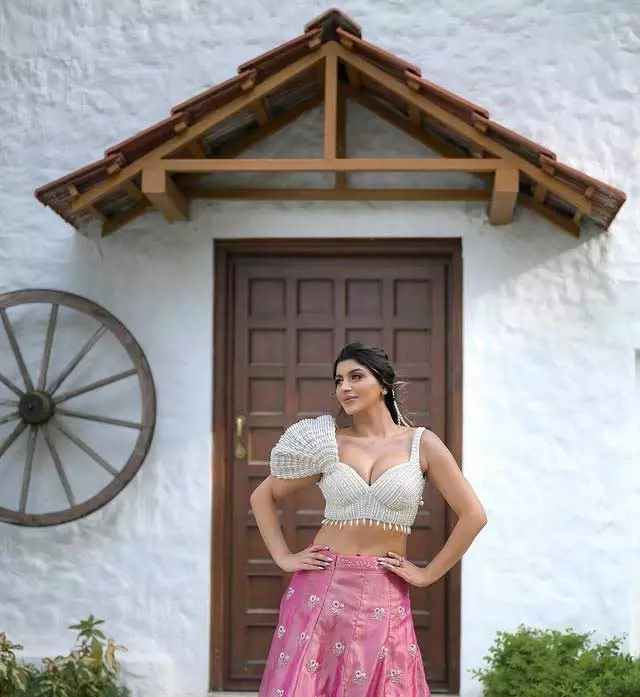 Actress Yashika Aannand stuns in a glamorous Indo-Western ensemble that perfectly blends tradition with bold fashion.Dressed in a pearl-embellished crop blouse featuring intricate beaded work and a structured shoulder, she pairs it with a vibrant pink lehenga adorned with delicate embroidery.