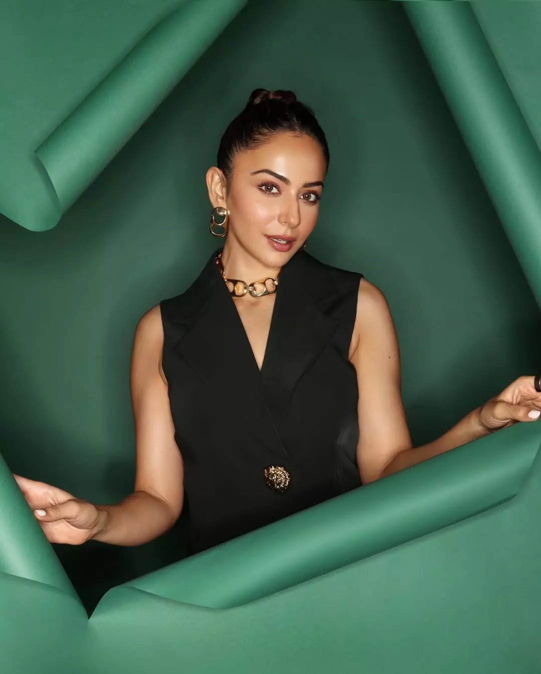 By: Tupaki Gallery Desk | 2 April 2026 6:49 PM ISTRakul Preet Singh continues to redefine elegance and confidence, and this striking photoshoot is a perfect example of her effortless style. Dressed in a sleek black body-hugging outfit with intricate cut-out detailing, Rakul exudes a bold yet sophisticated vibe. The high-neck design paired with statement earrings enhances her graceful profile, while her neatly tied ponytail adds a touch of modern chic. The soft studio backdrop complements her look, allowing her presence to take center stage.