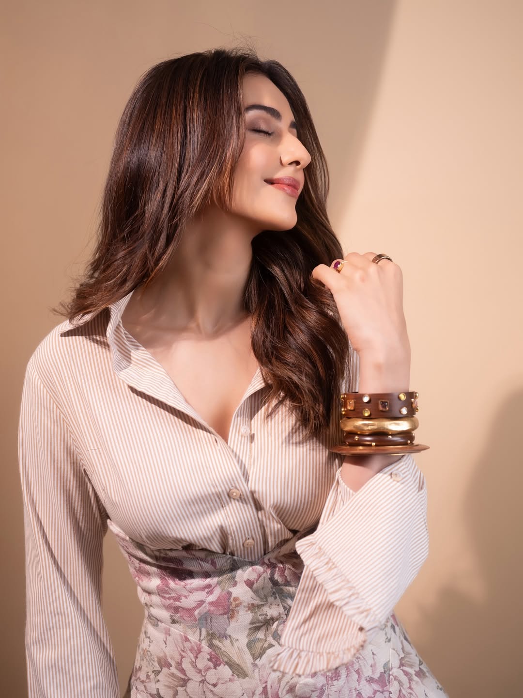 Rakul Preet Singh blooms with effortless elegance in this chic studio portrait, channeling soft femininity against a warm beige backdrop. She wears a fitted, striped beige shirt tucked into a high-waisted floral mini skirt in delicate pink and white tones, cinched to perfection for a flattering silhouette. Her glossy waves cascade loosely, framing a poised expression, while white pointed heels elongate her toned legs. Subtle pearl earrings and a dewy glow complete the refined yet playful look. This is Ayesha’s version of Monday motivation: swap the blues for pinks #DDPD2 — a fresh, floral reminder to embrace the week with grace and charm.