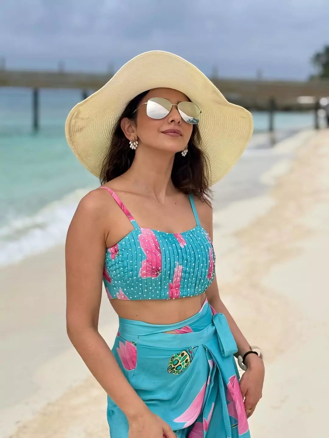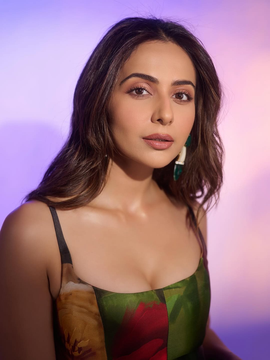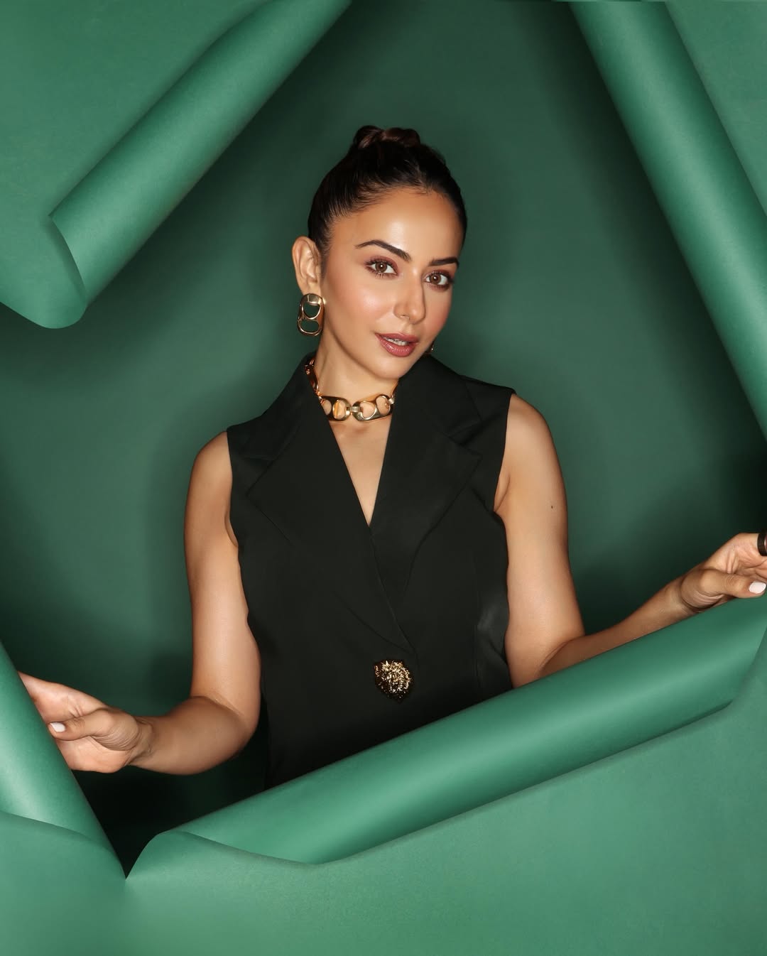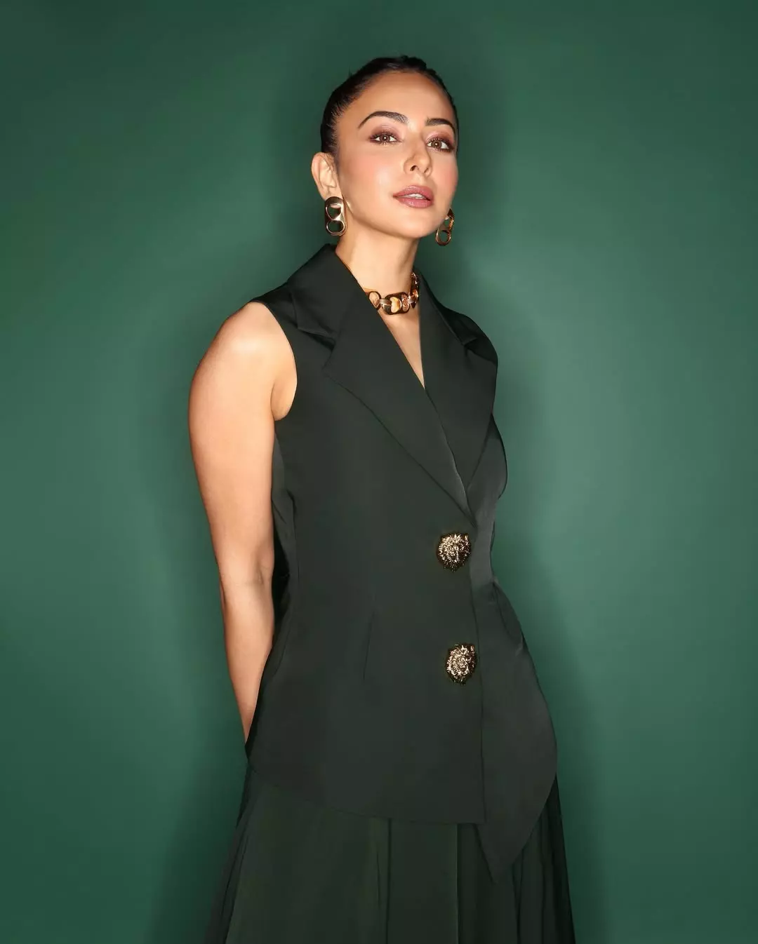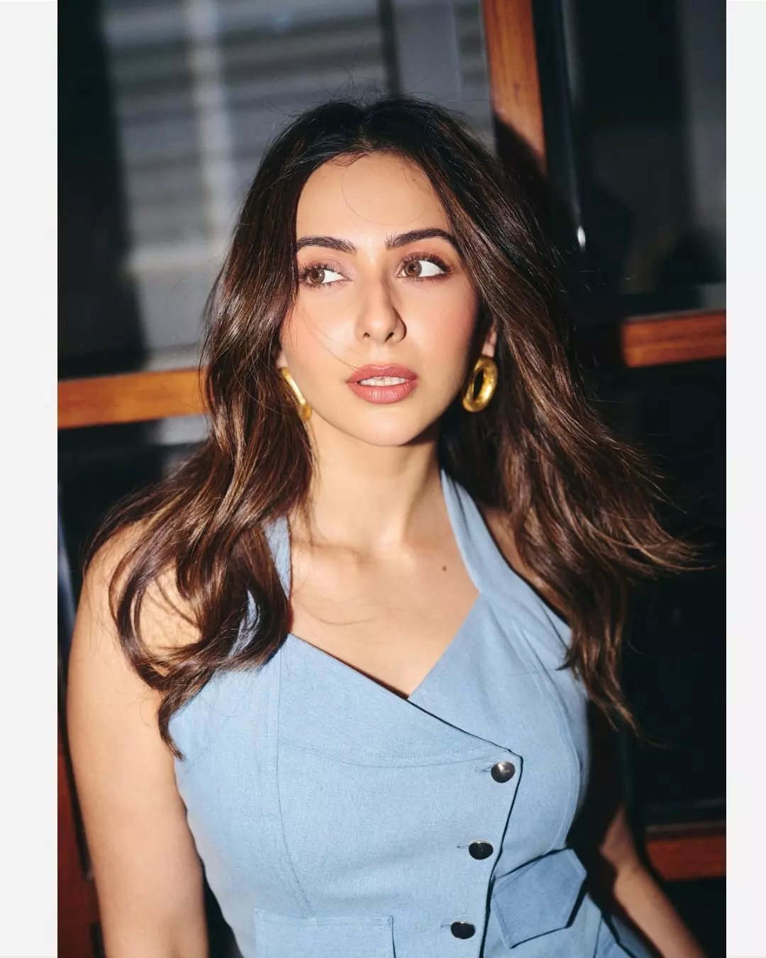 Her minimal yet striking styling stands out — from the subtle makeup that enhances her natural beauty to the statement gold earrings that elevate the entire ensemble. With her hair flowing naturally and her expressions capturing both poise and allure, Rakul creates a visual treat for fans and fashion enthusiasts alike.