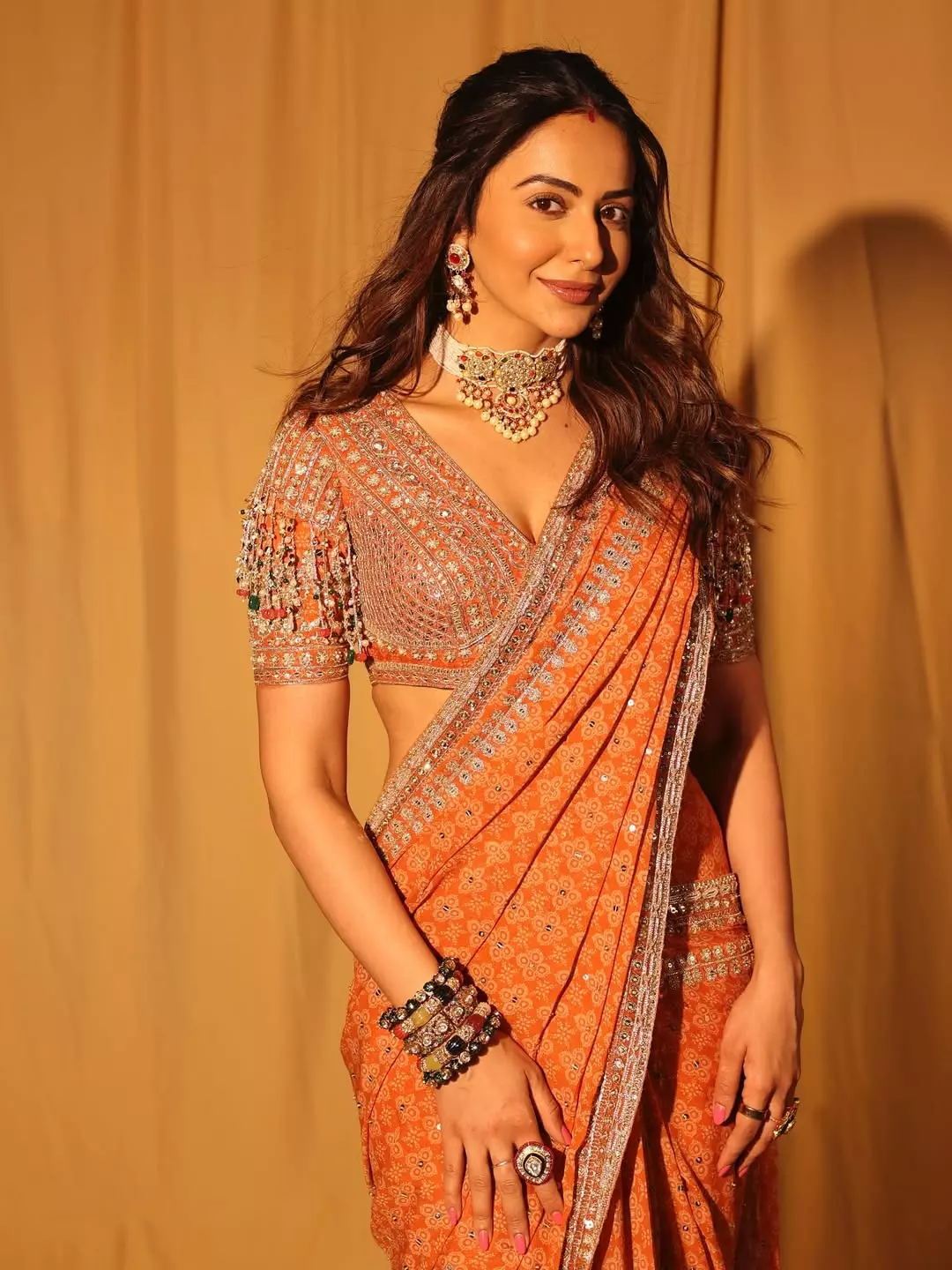 Actress Rakul Preet Singh shared a beautiful moment from her Karwa Chauth celebration with her husband Jackky Bhagnani on Instagram. In the photo, Rakul is seen wearing a traditional orange saree accessorized with elegant jewellery and a bright smile. She held a decorated thali with all the Karwa Chauth essentials a silver pot, diya, and sweets while Jackky stood beside her wearing a cream colored embroidered kurta.